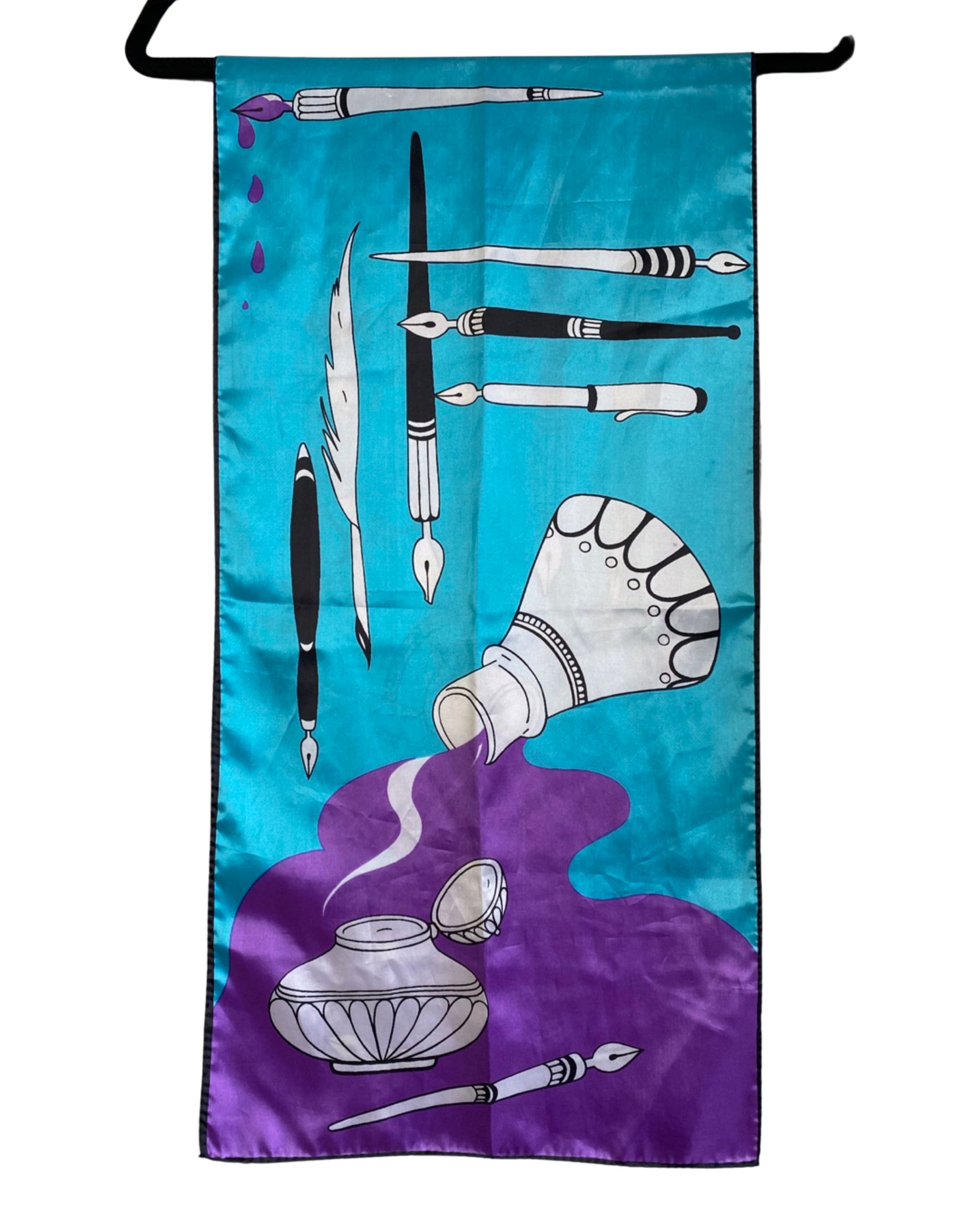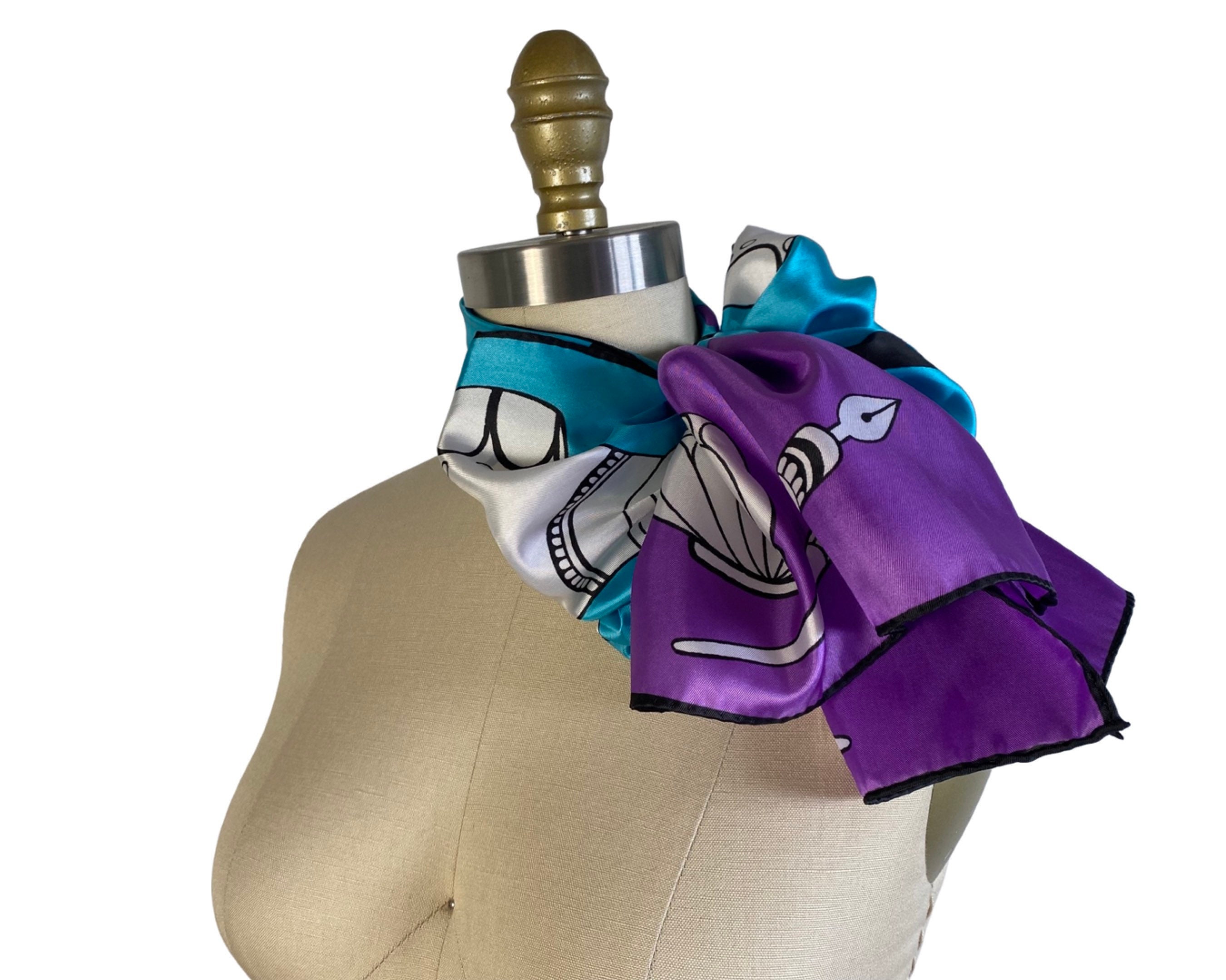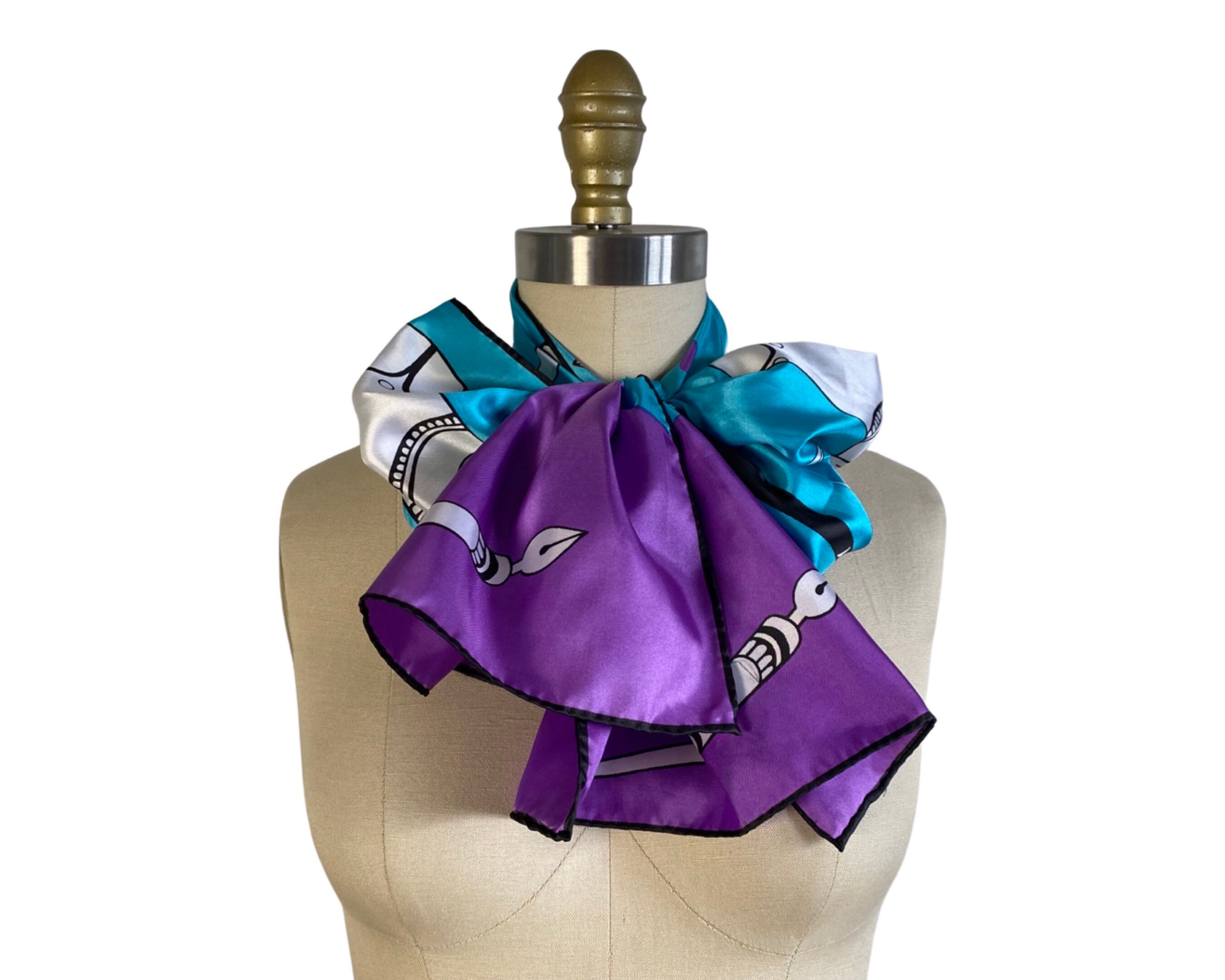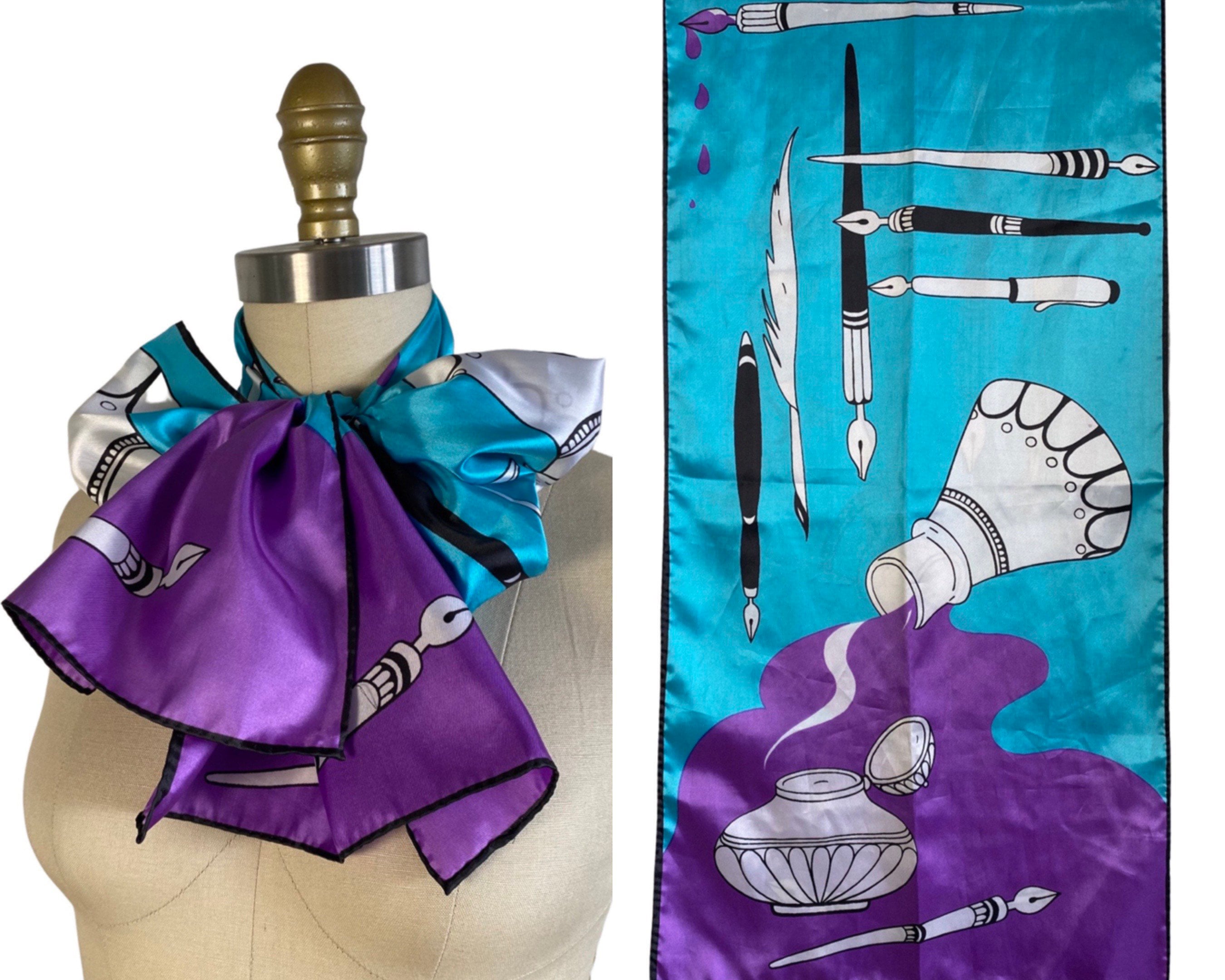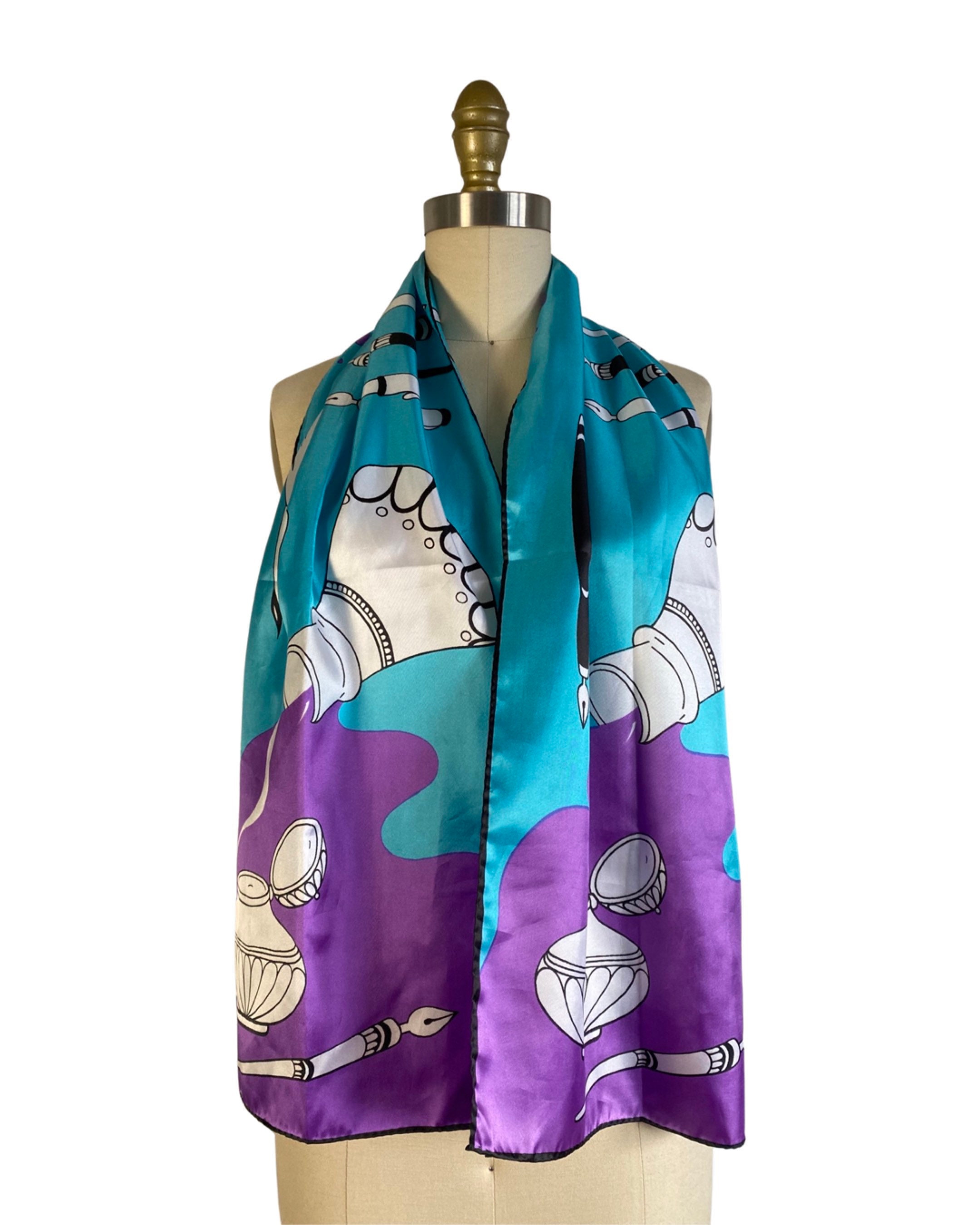 Wonderful 1960's silky nylon neck scarf in a fabulous turquoise blue and bright violet artistic print of quill and calligraphy pens with ink bottles. Beautiful and a perfect gift for an artist or writer!