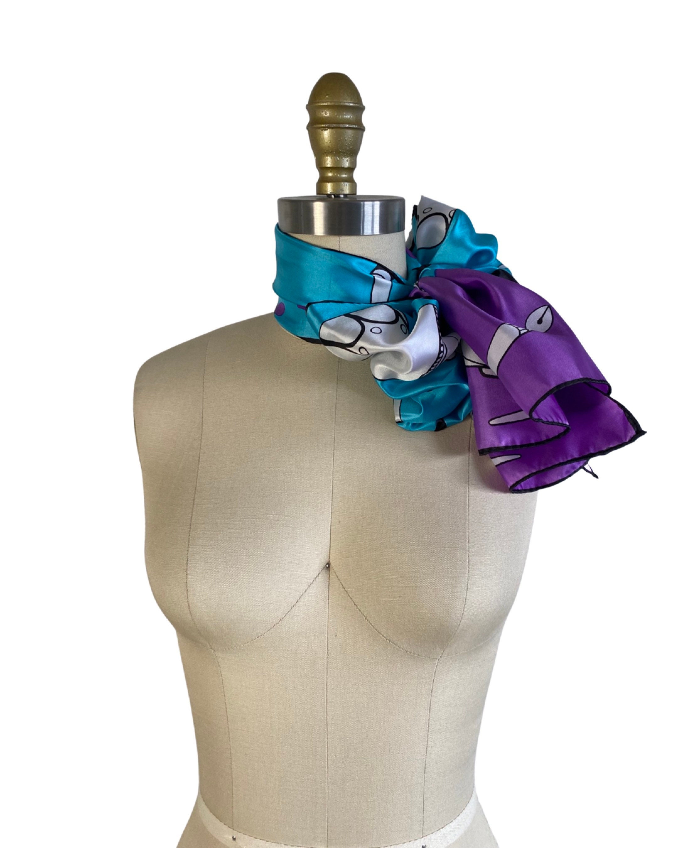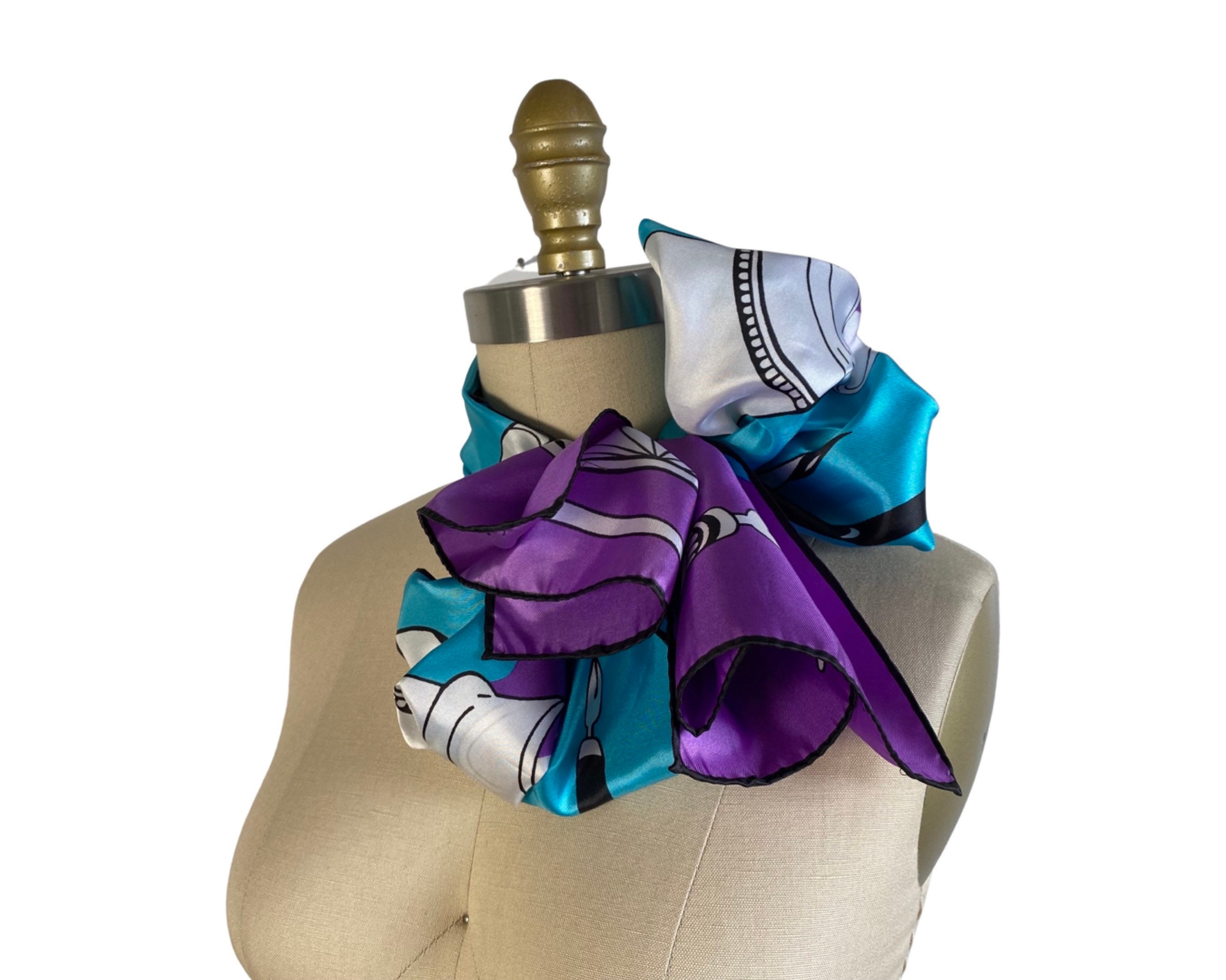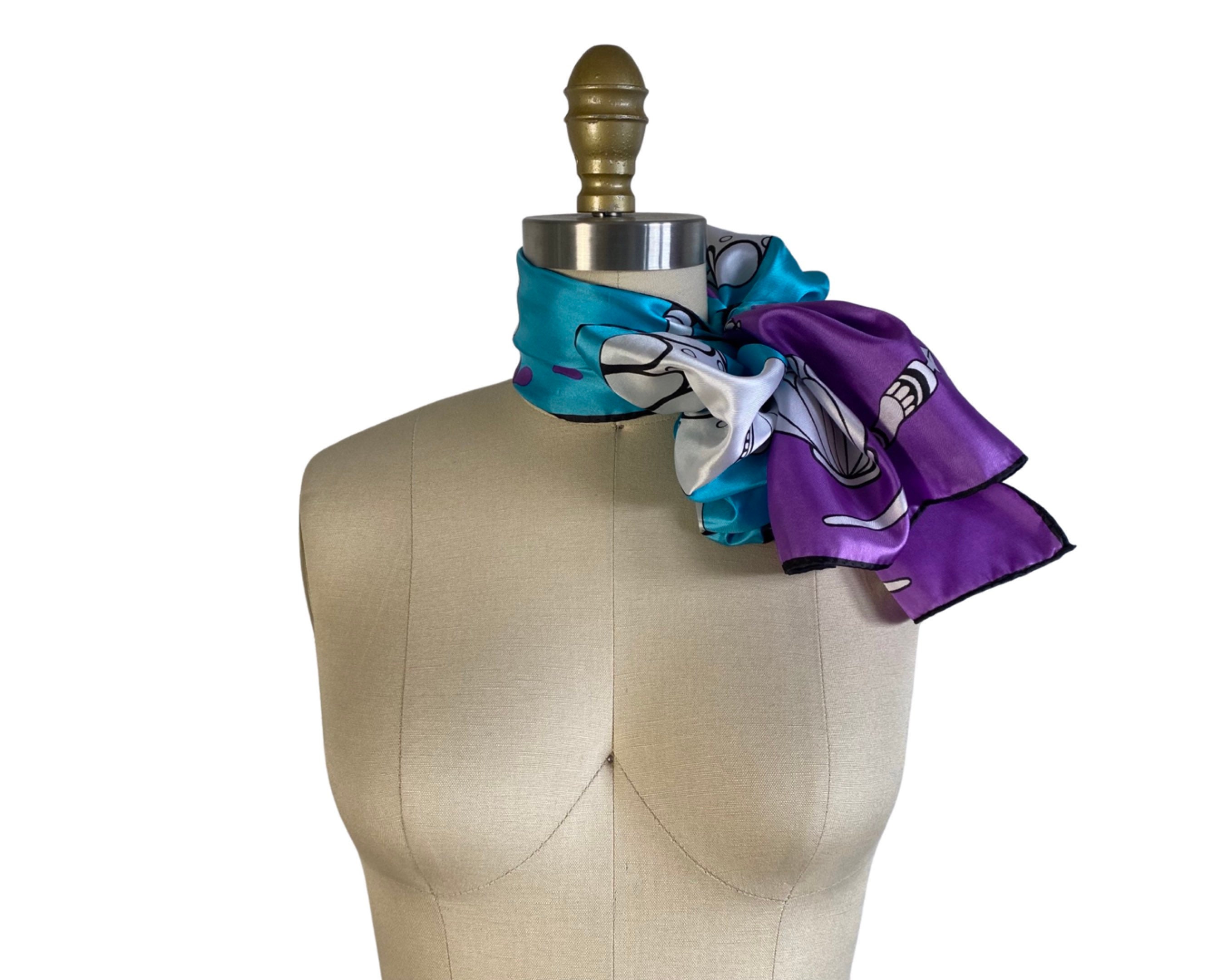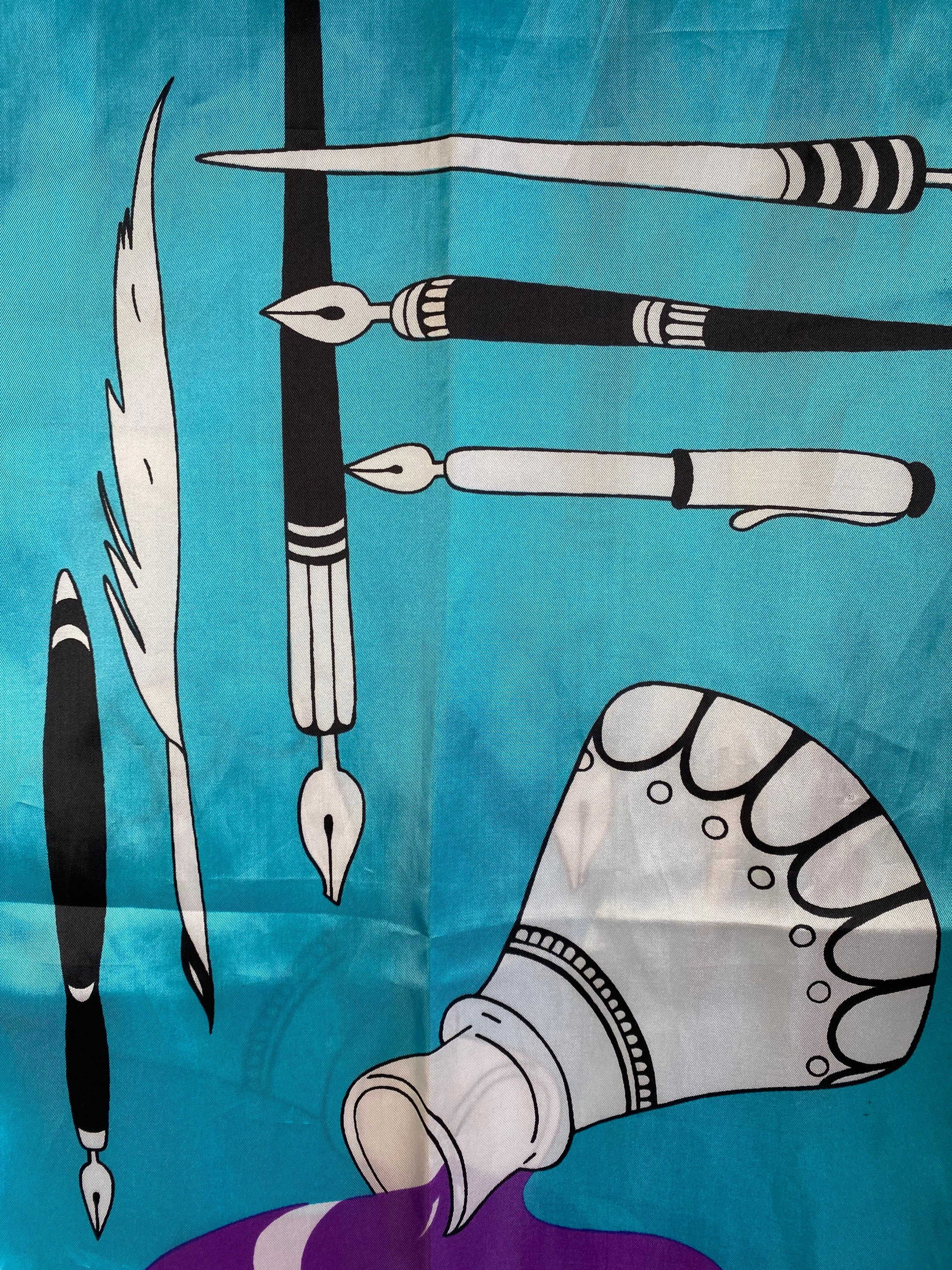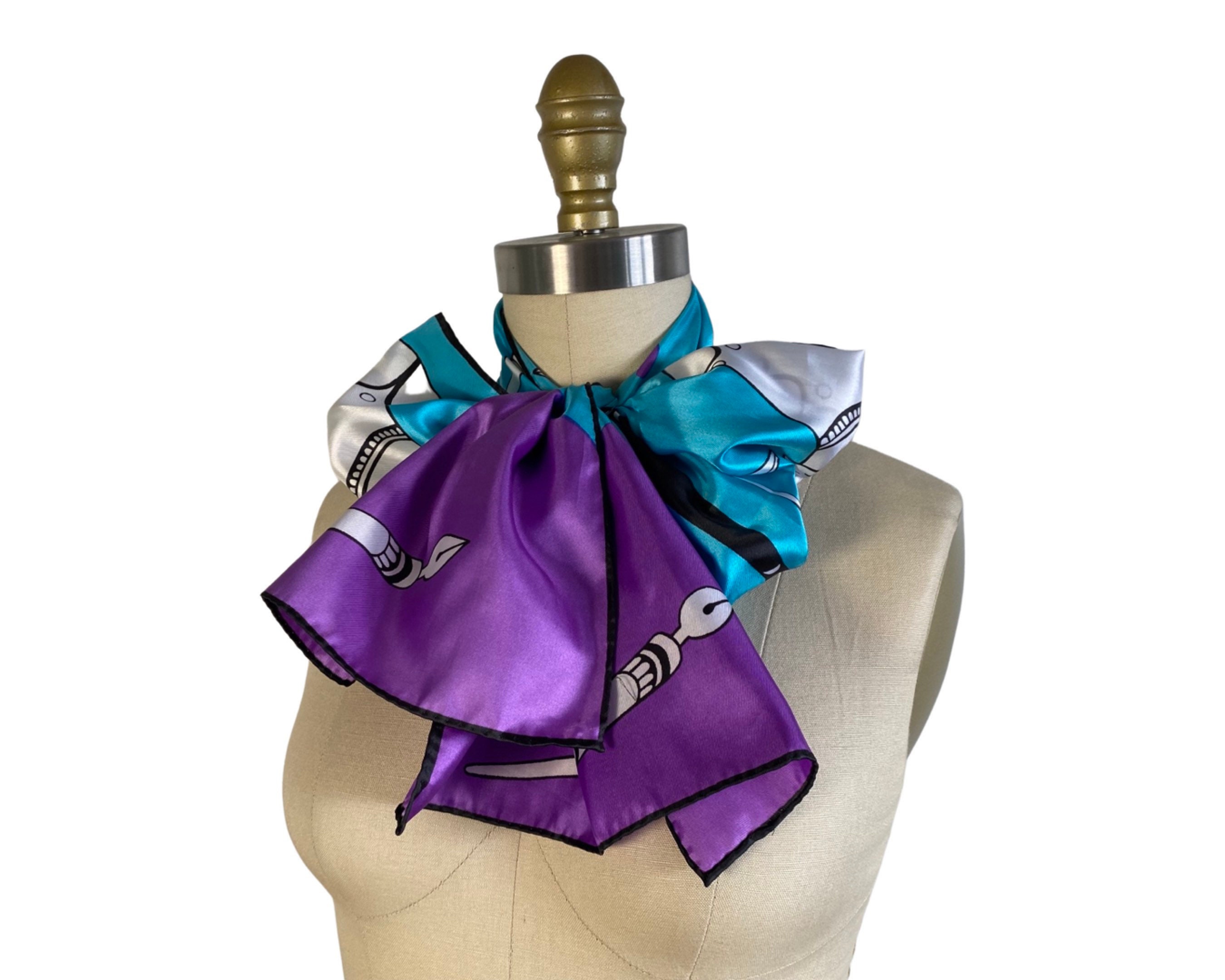 Wonderful 1960's silky nylon neck scarf in a fabulous turquoise blue and bright violet artistic print of quill and calligraphy pens with ink bottles. Beautiful and a perfect gift for an artist or writer!