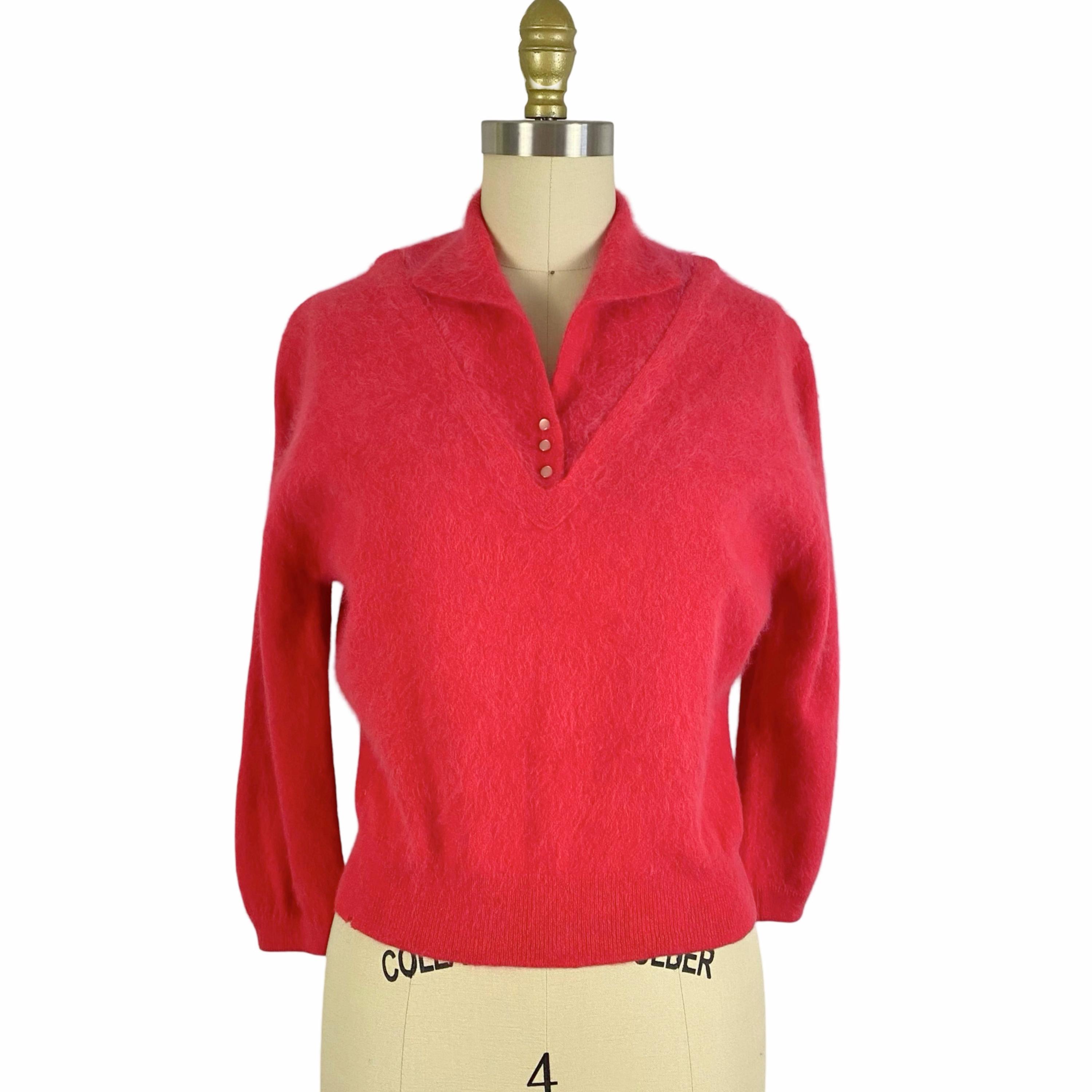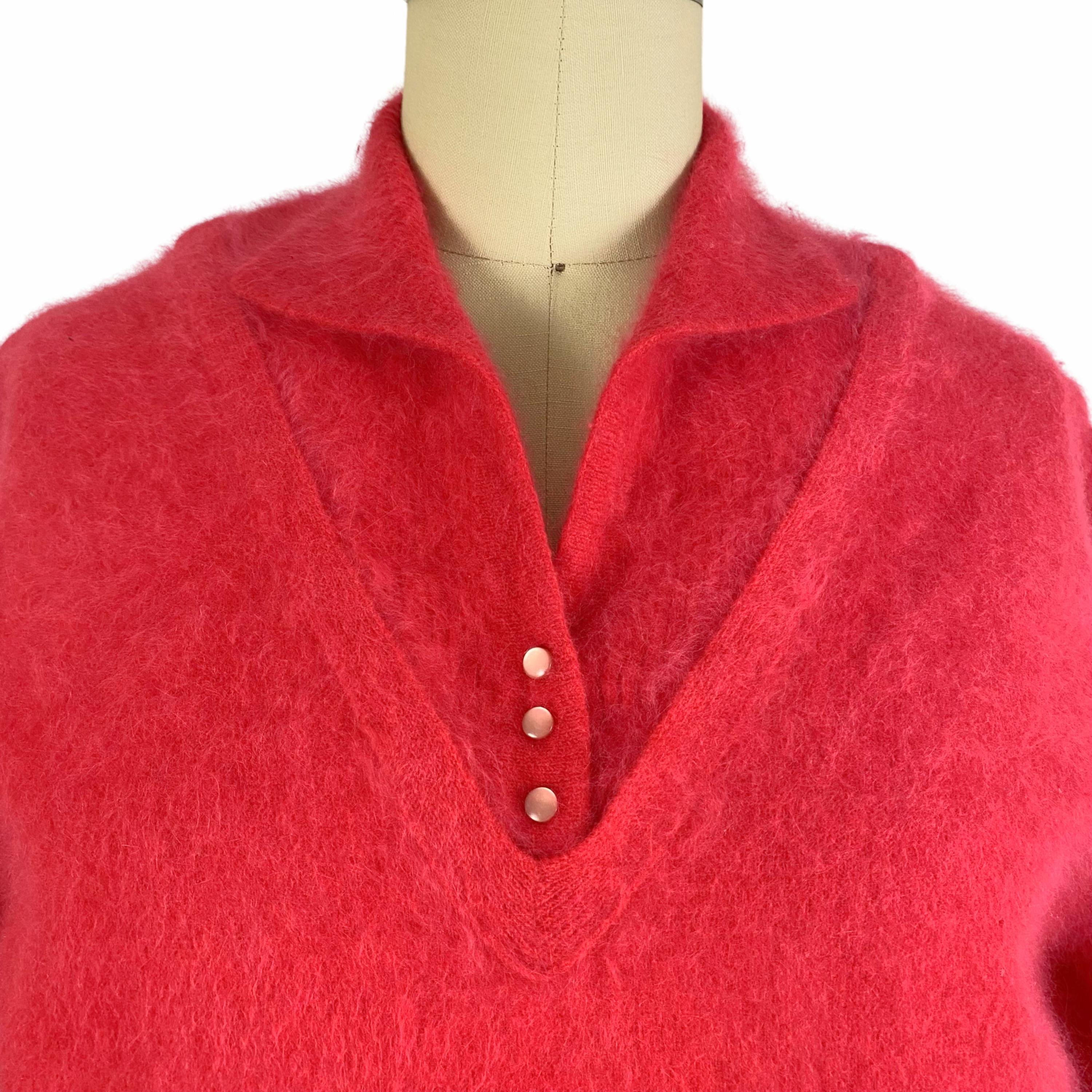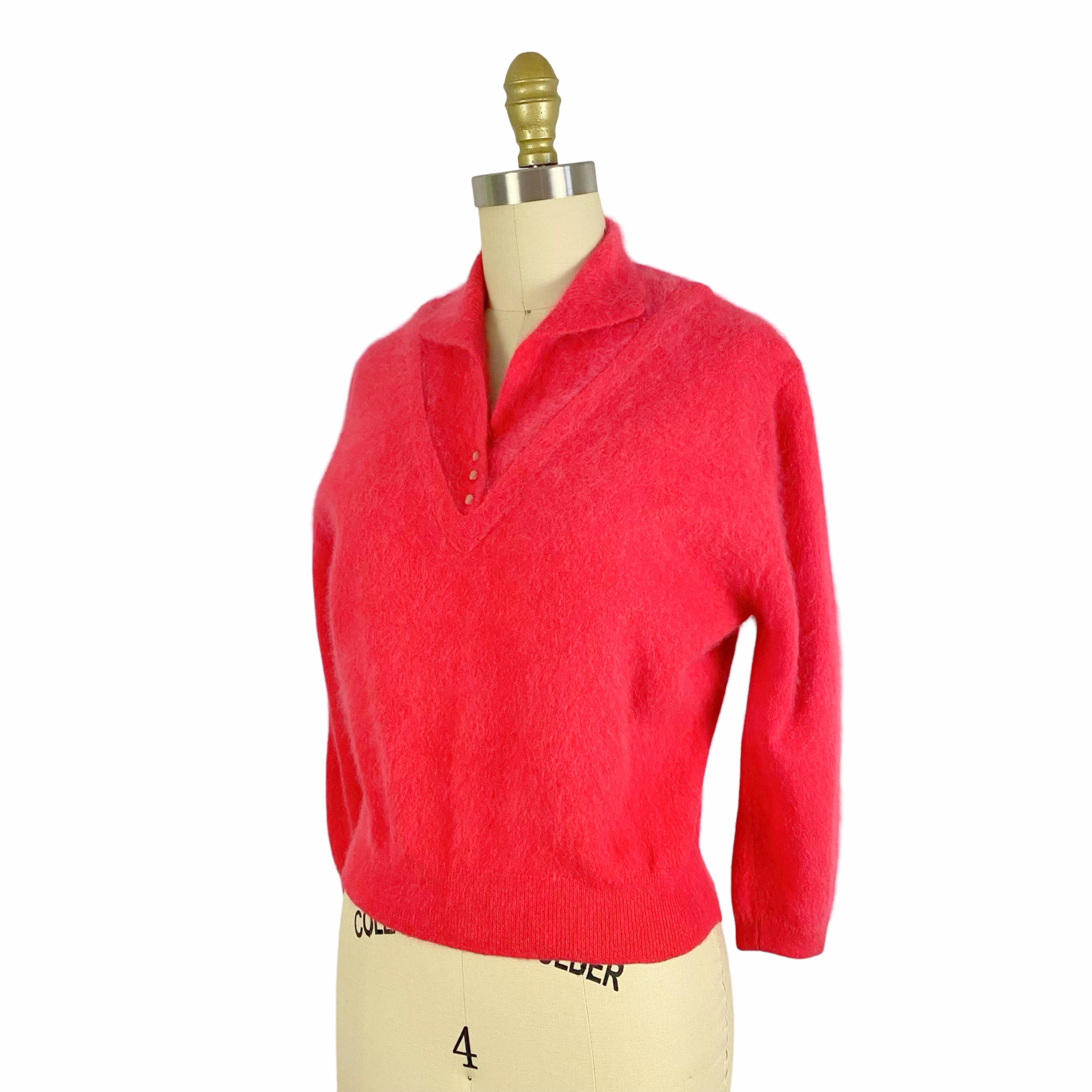 Beautiful early 1960's hot pink Angora and Wool blend soft fuzzy sweater. Pullover style with bracelet sleeves, collared neckline and 3 little buttons at front. Ribbed neckline and cuffs. No fasteners