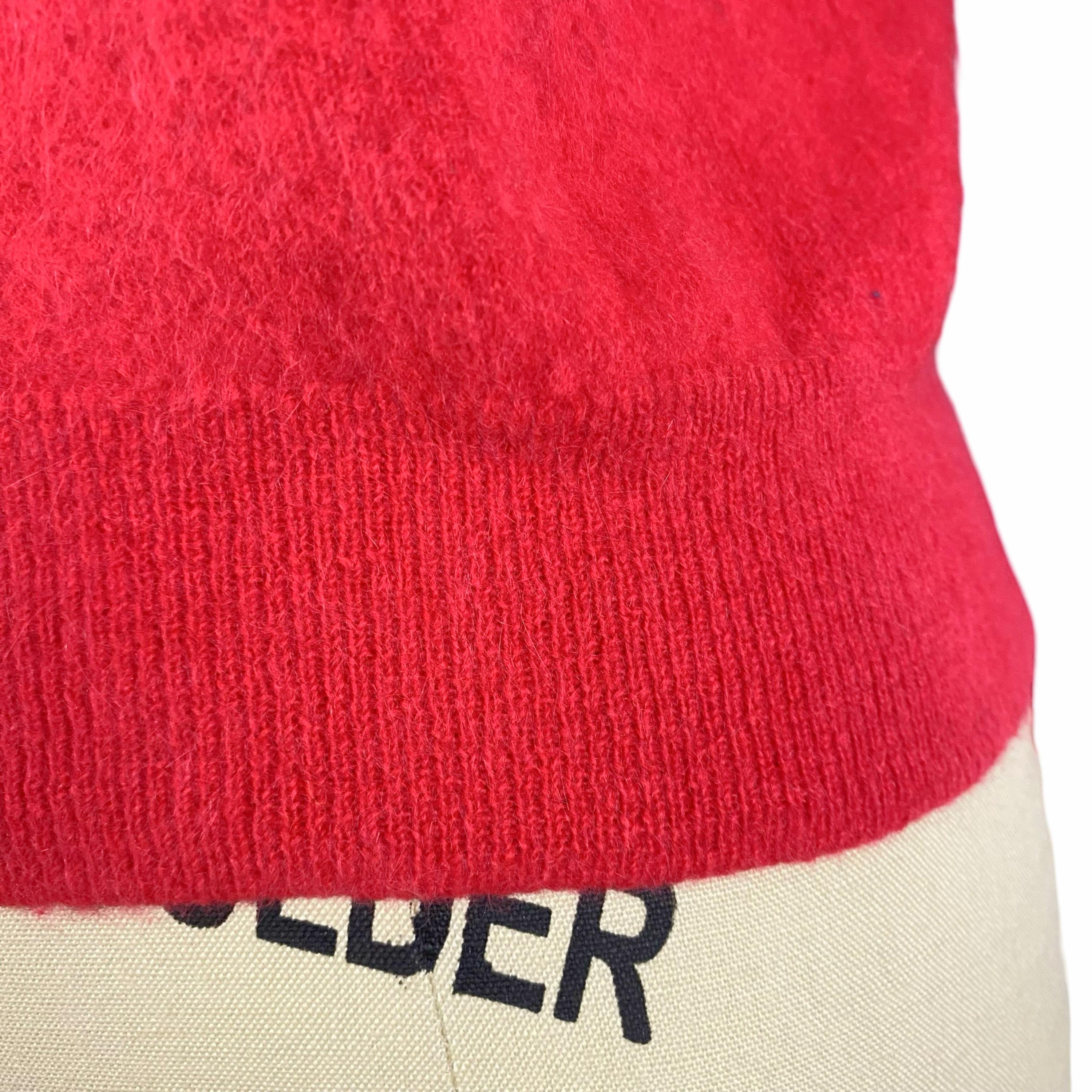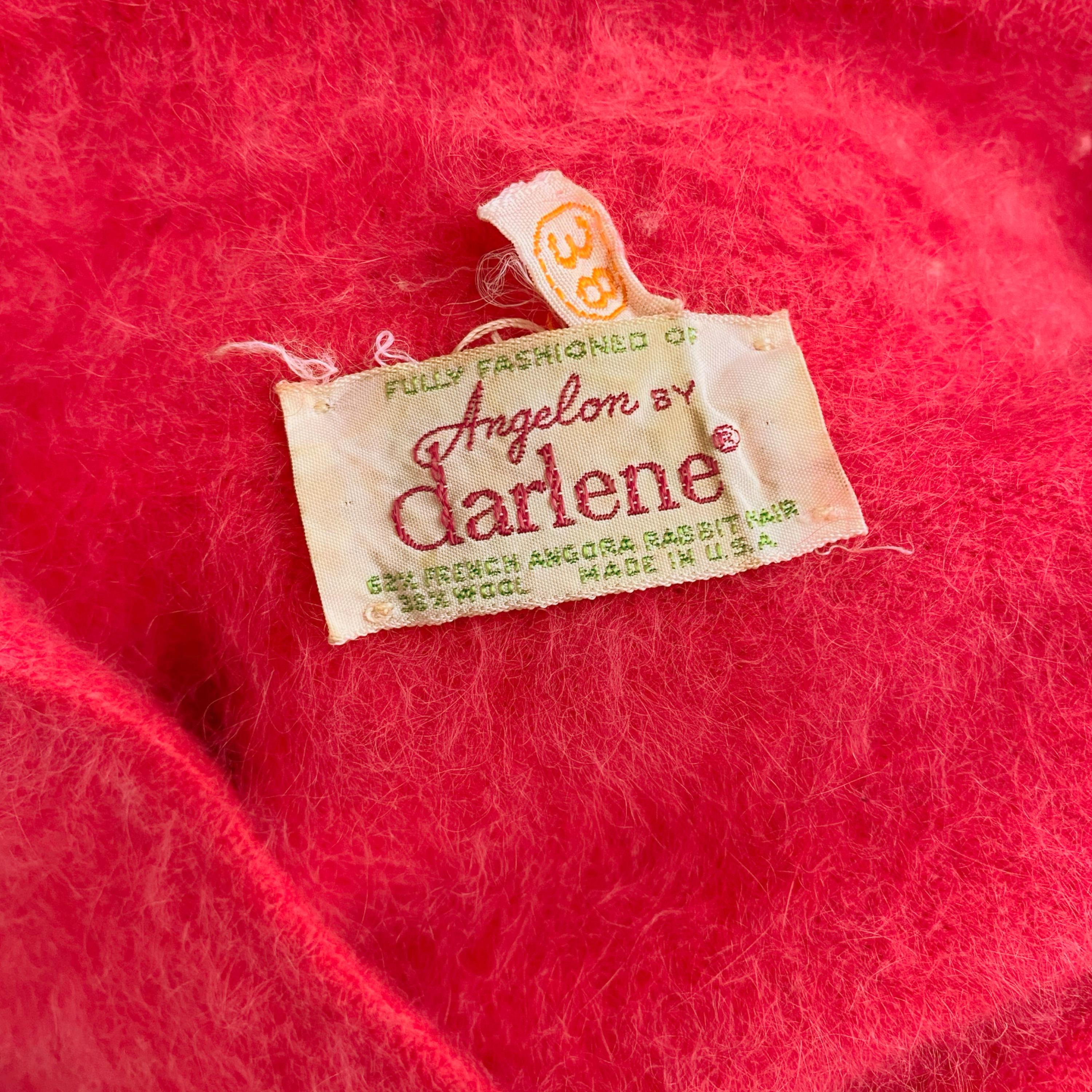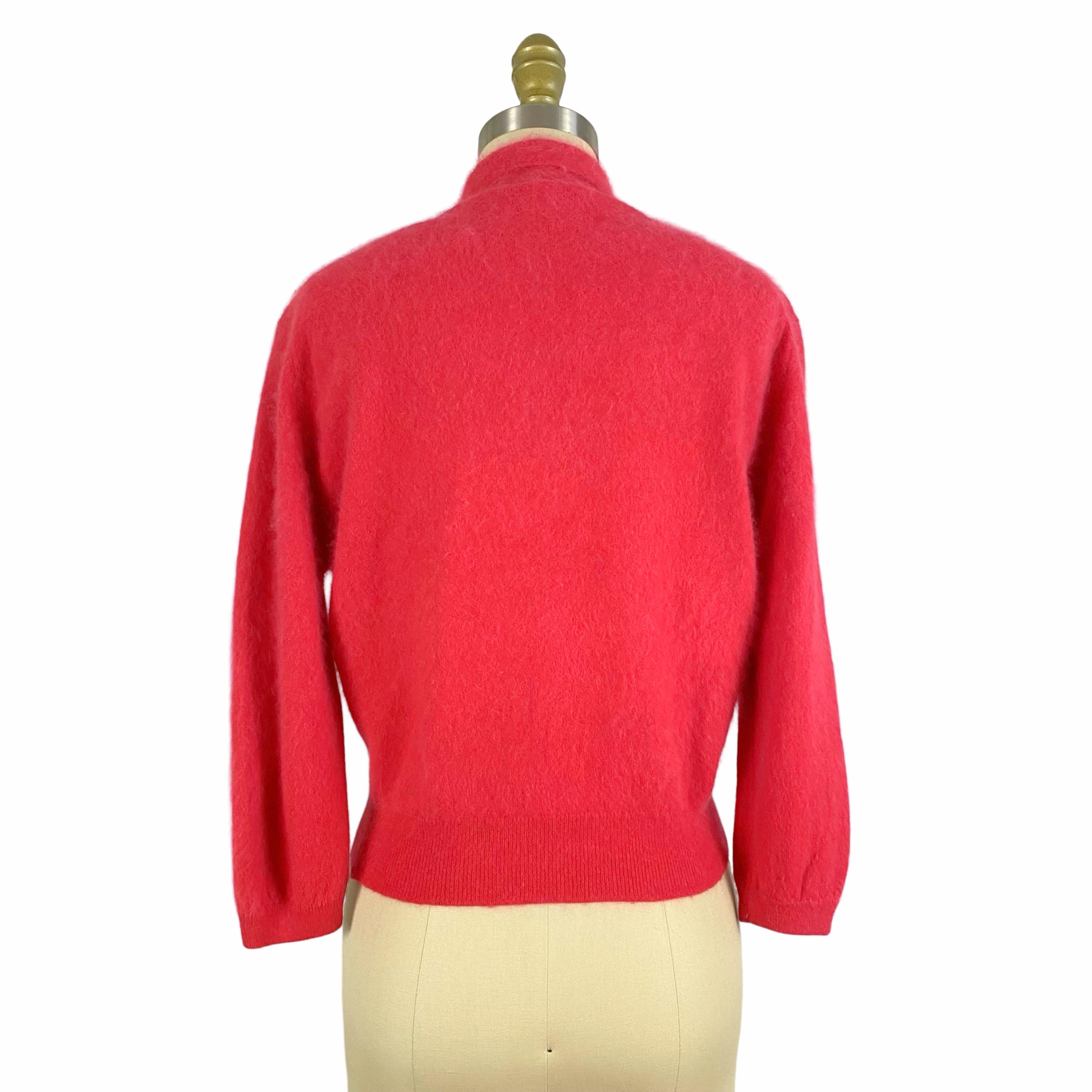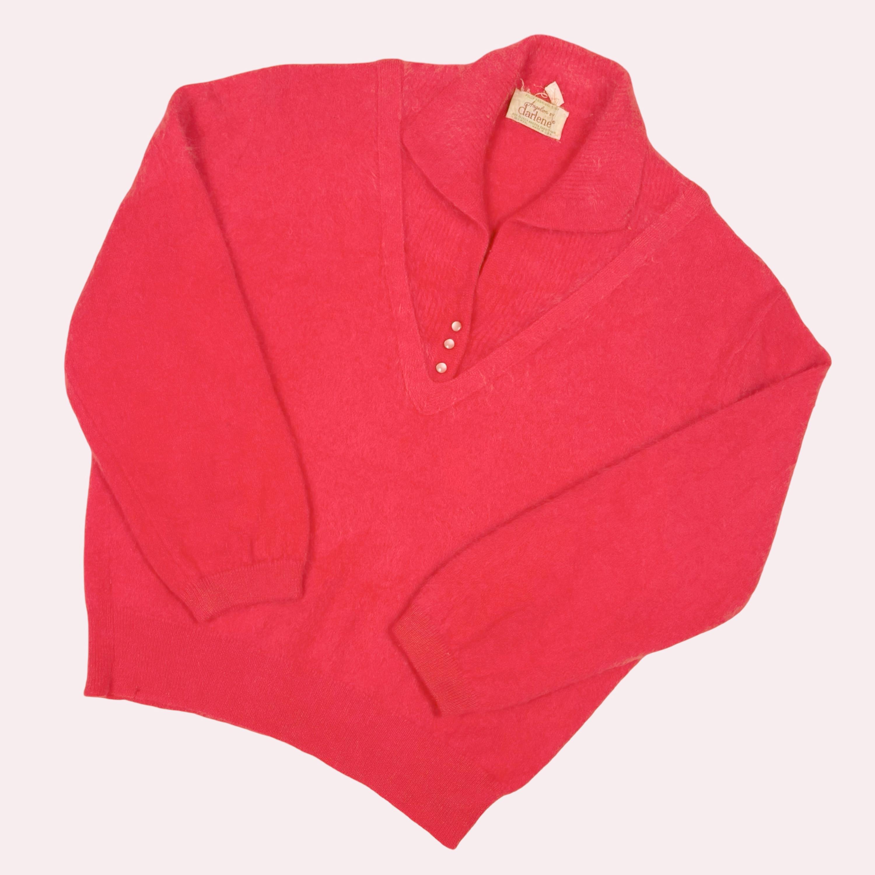 Beautiful early 1960's hot pink Angora and Wool blend soft fuzzy sweater. Pullover style with bracelet sleeves, collared neckline and 3 little buttons at front. Ribbed neckline and cuffs. No fasteners