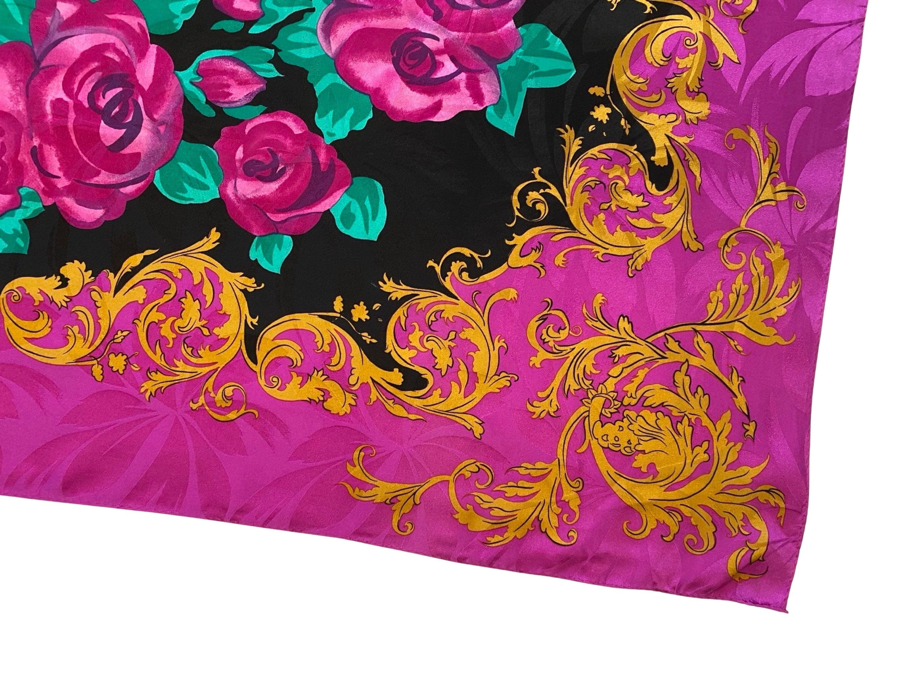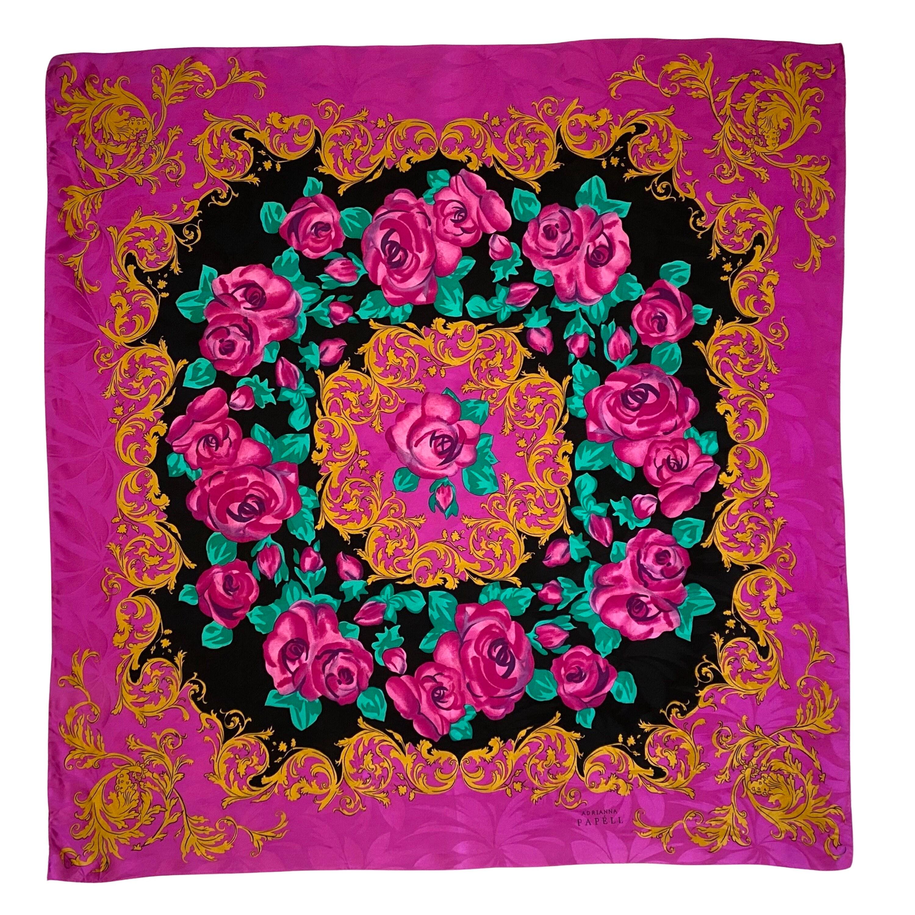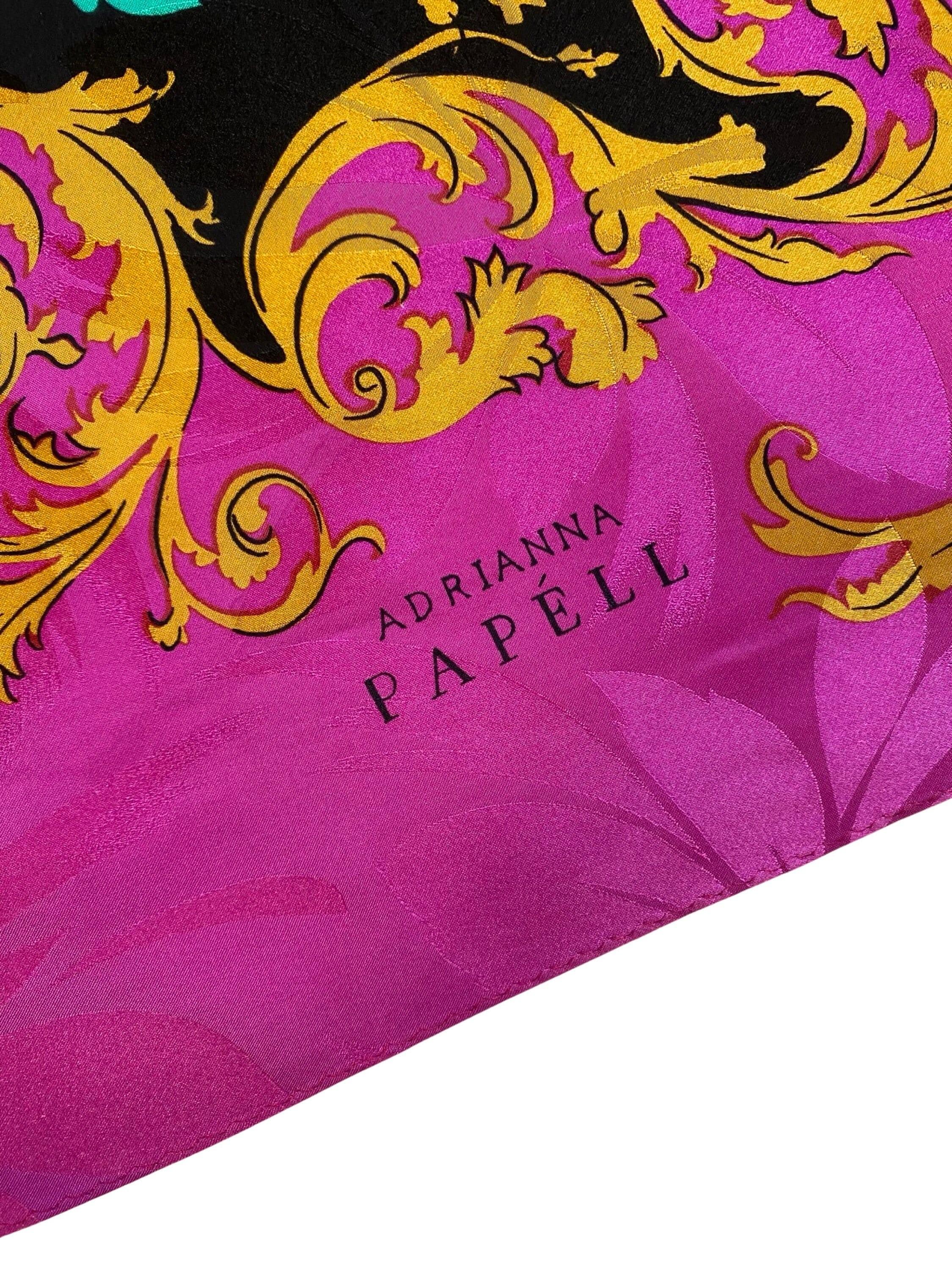 Beautiful 1990's large silk head or neck scarf in a vibrant pink, green, yellow and black floral print.LABEL: Adrianna PapellMEASURES: Width: 34.5"Length: 35.5"CONDITION: Excellent***All sales final***