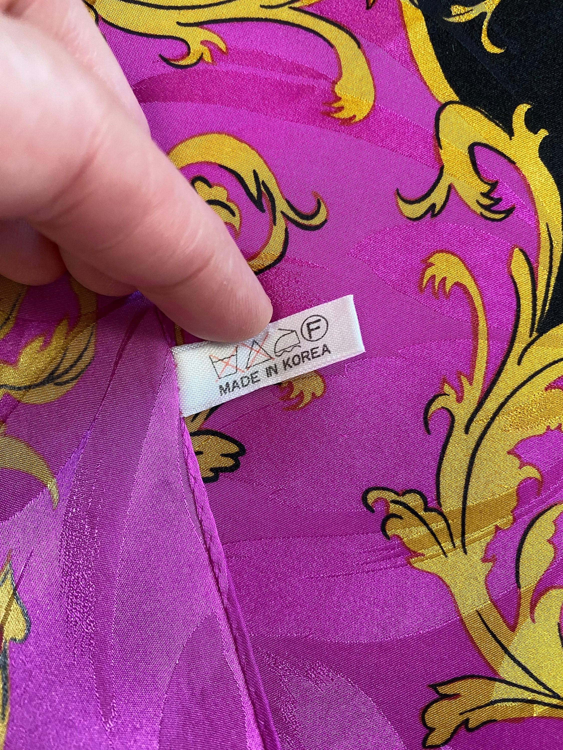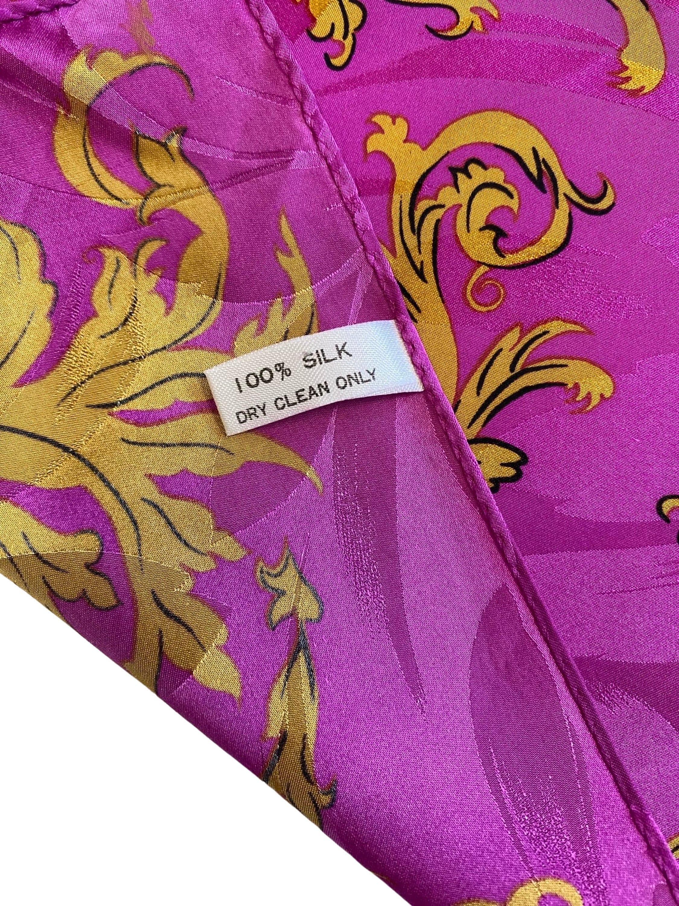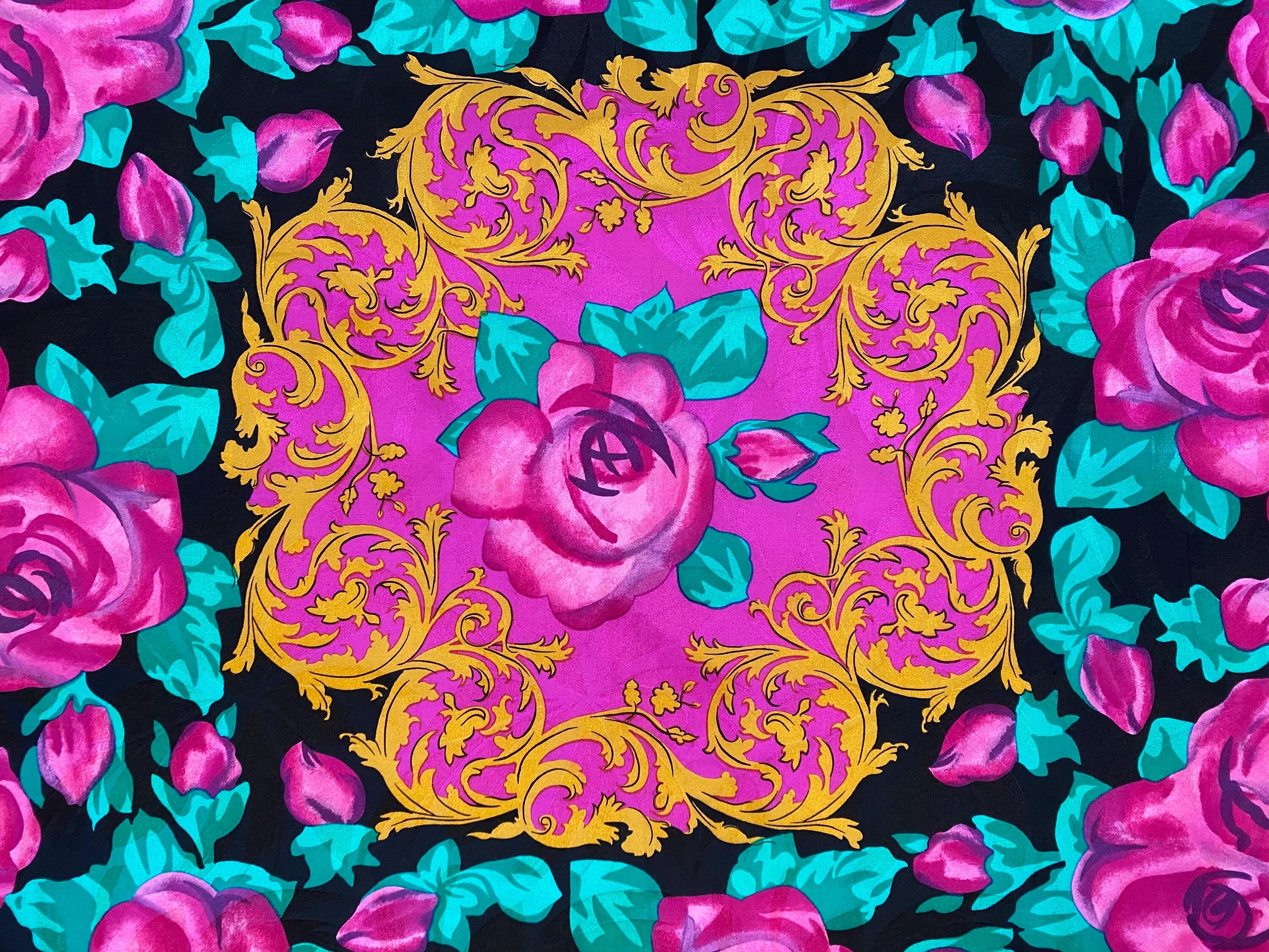 Beautiful 1990's large silk head or neck scarf in a vibrant pink, green, yellow and black floral print.LABEL: Adrianna PapellMEASURES: Width: 34.5"Length: 35.5"CONDITION: Excellent***All sales final***