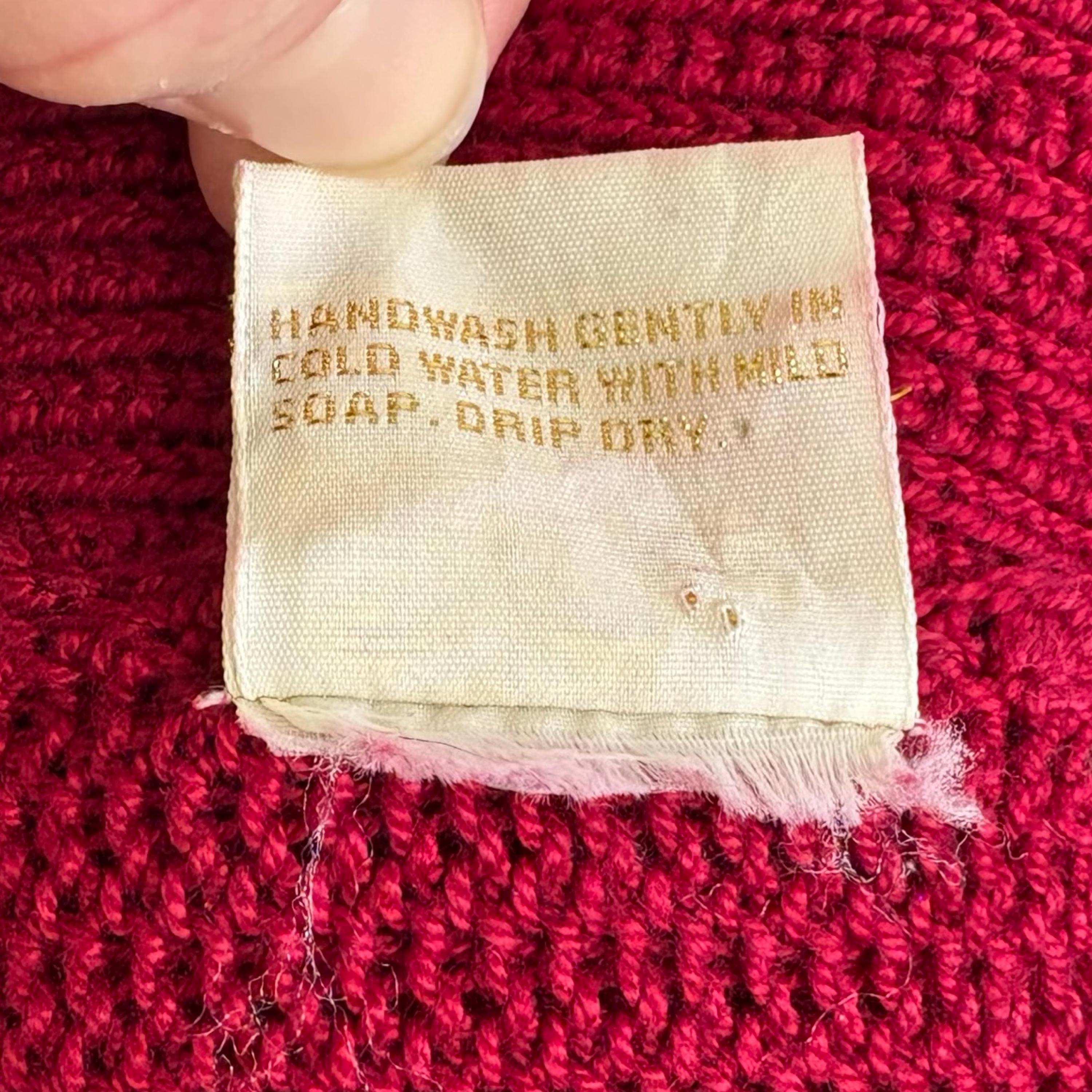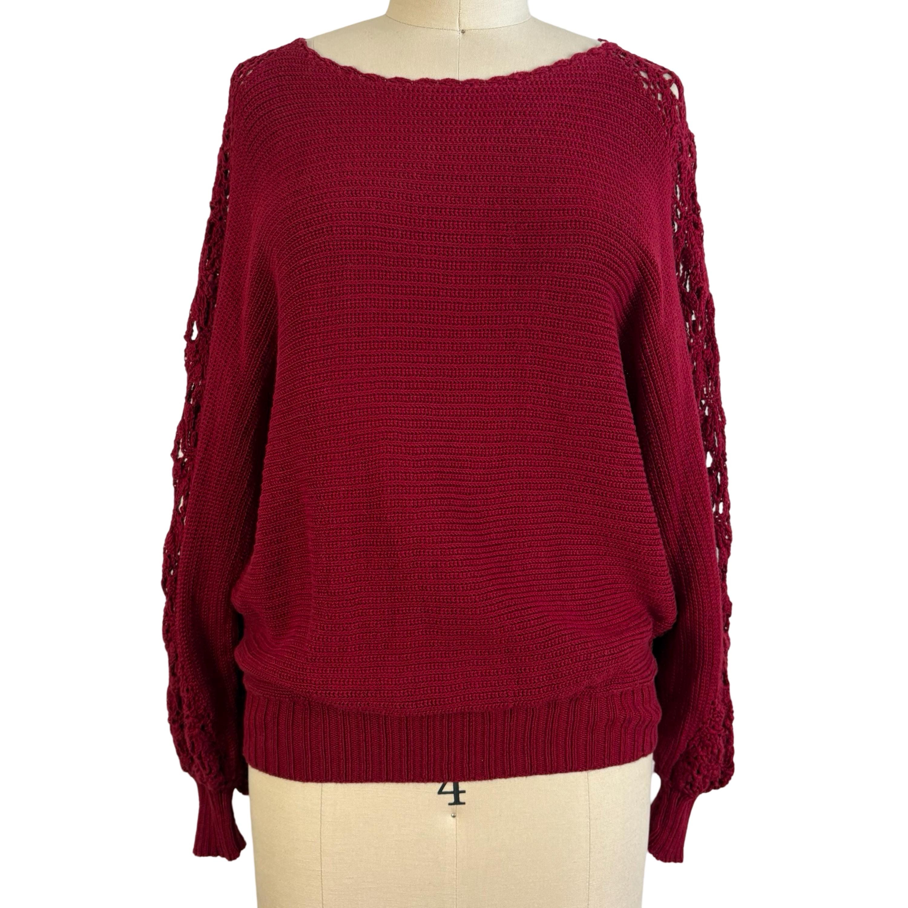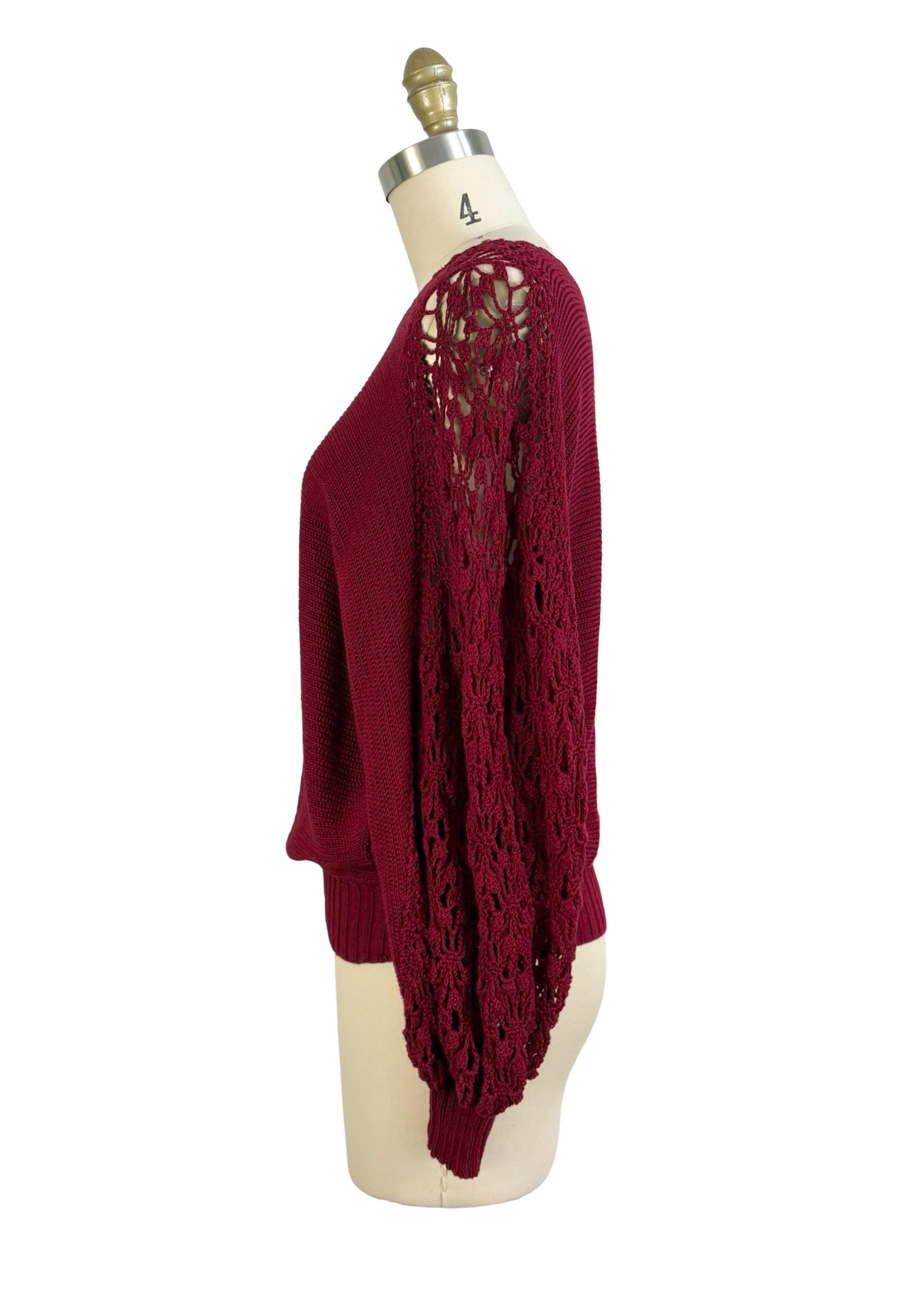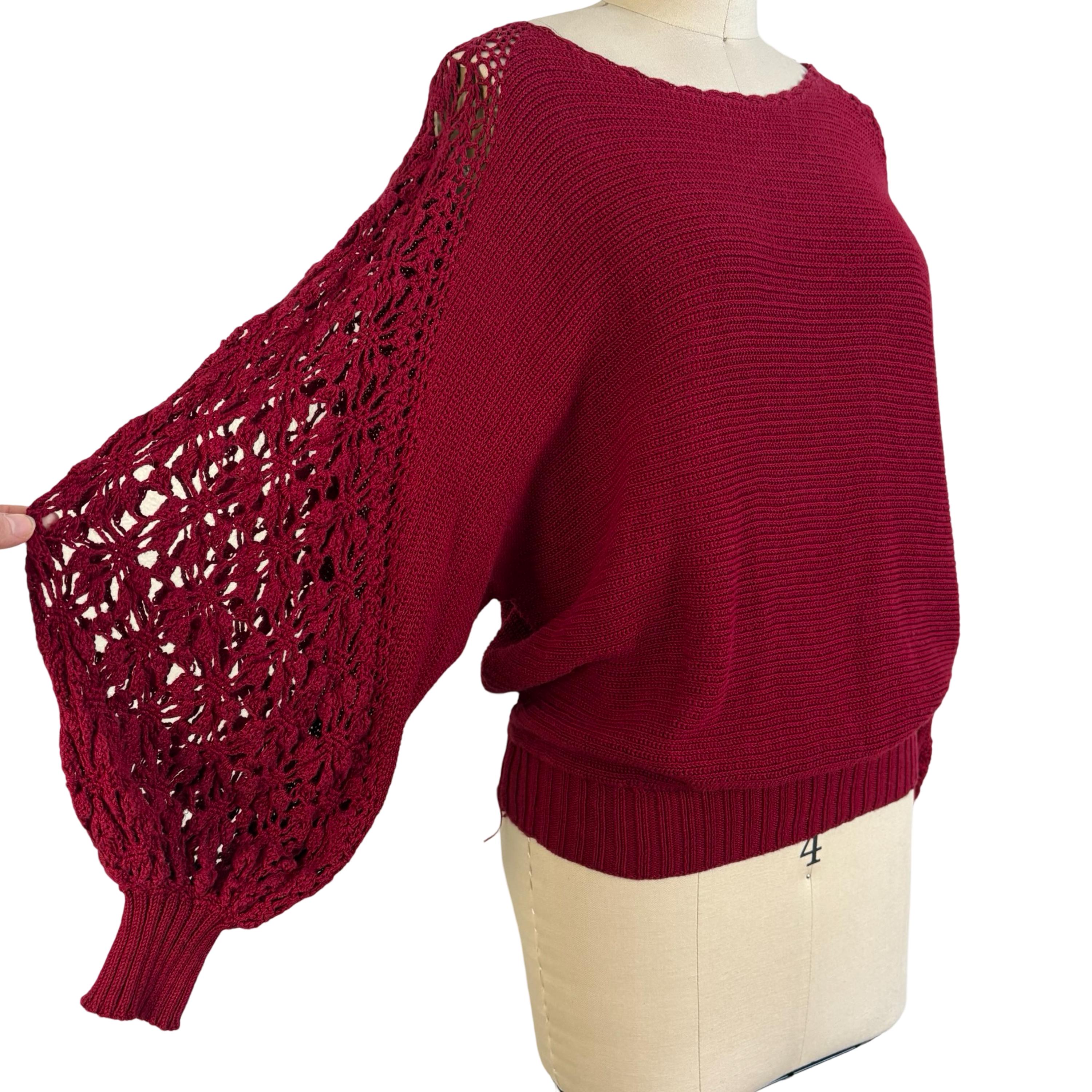 Chic 1970's cotton knit maroon sweater with phenomenal crochet balloon sleeves. Wide boat neckline and pullover style with no fasteners. Falls to mid hip.