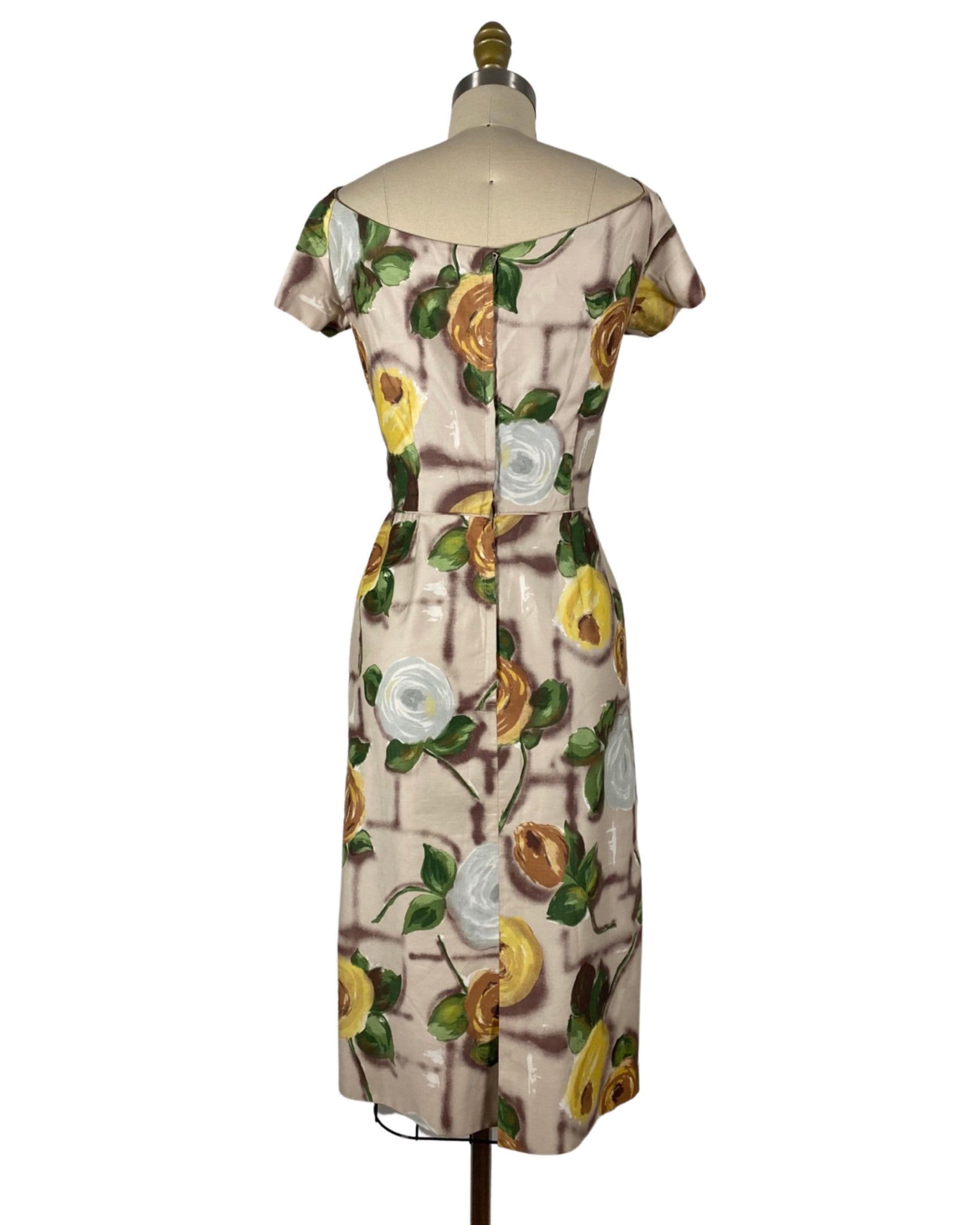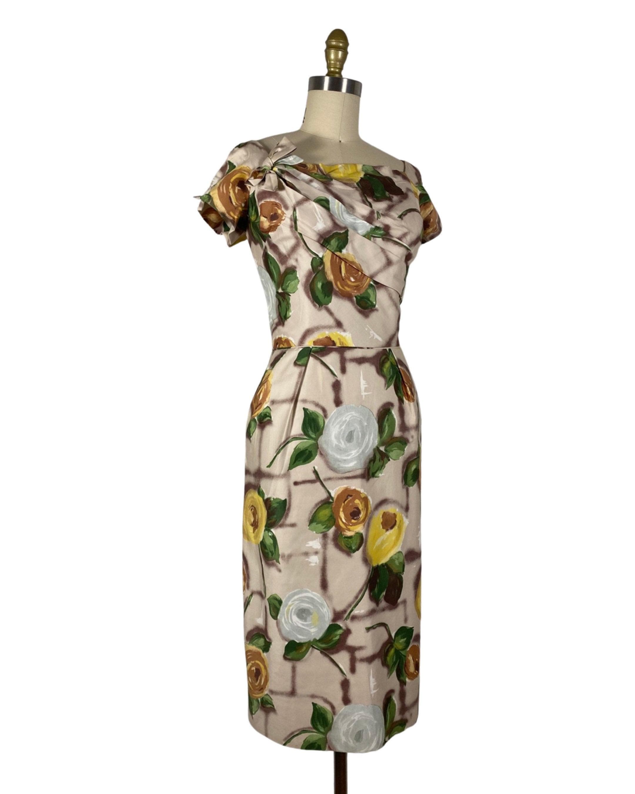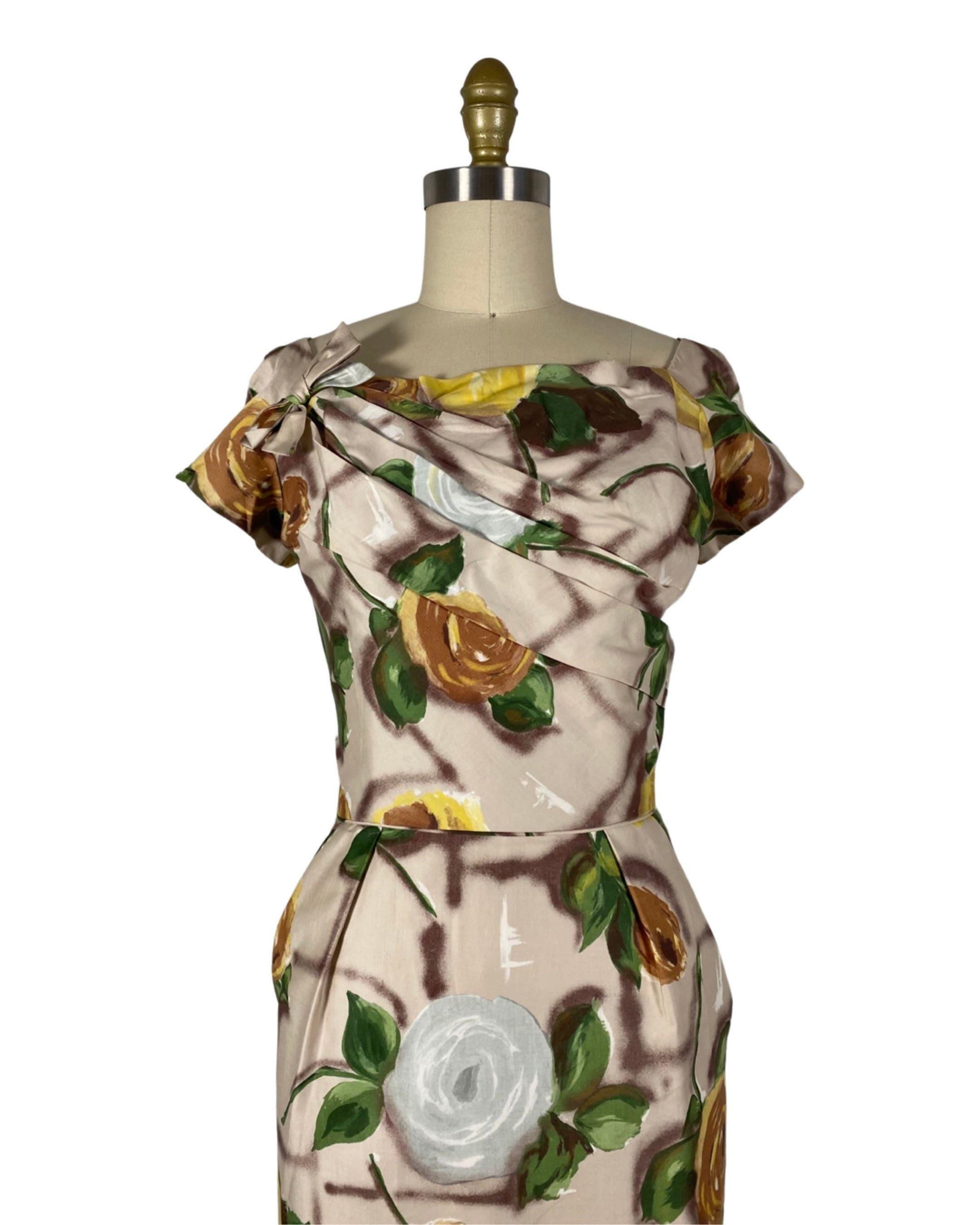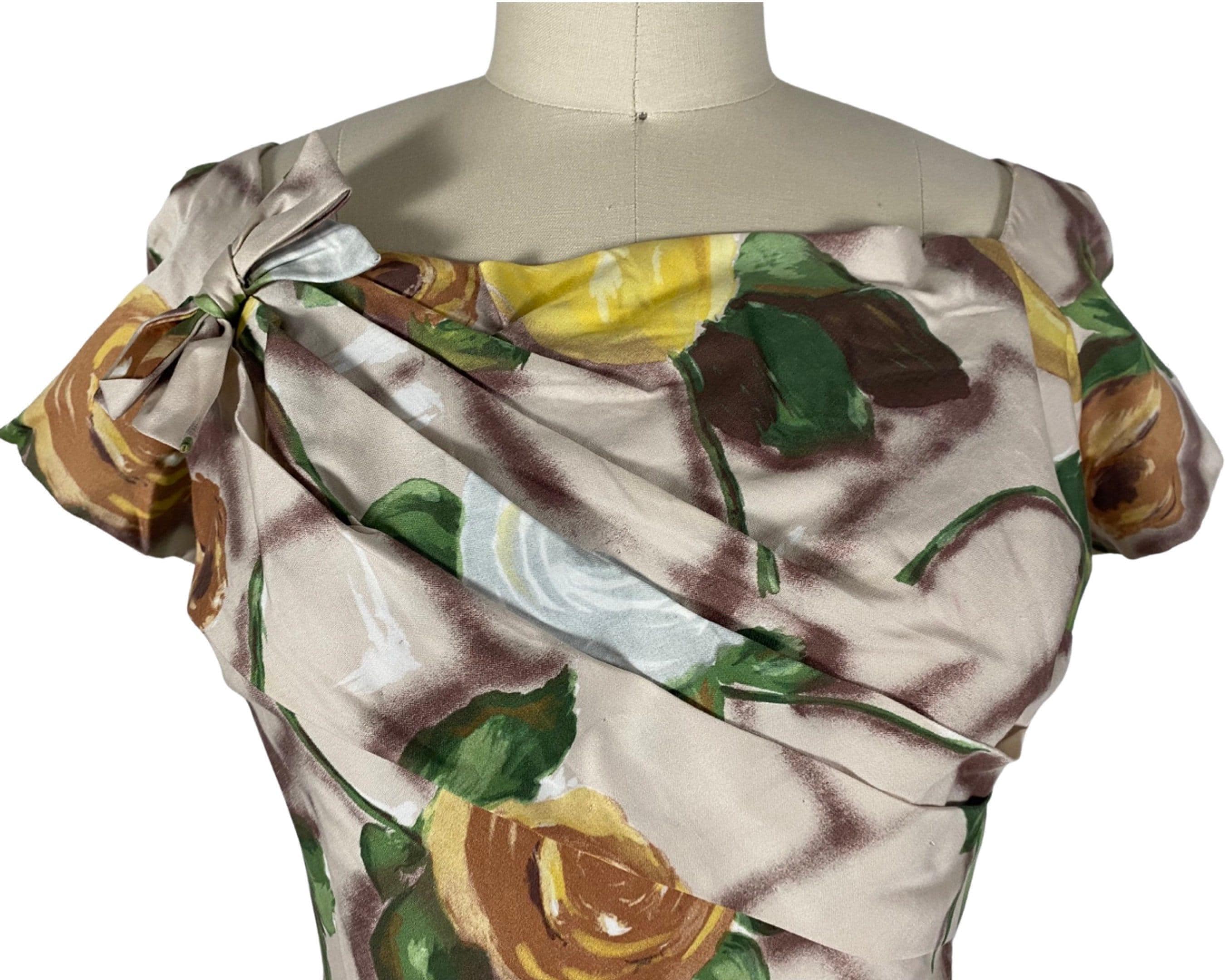 Stunning 1950's cotton sateen cocktail dress in a beautiful ecru, green, yellow and brown floral rose print. Fitted bodice with short cap sleeves and draping detail with little bow at right shoulder. Slim sheath style skirt. Lined in beige taffeta with metal zip at back.