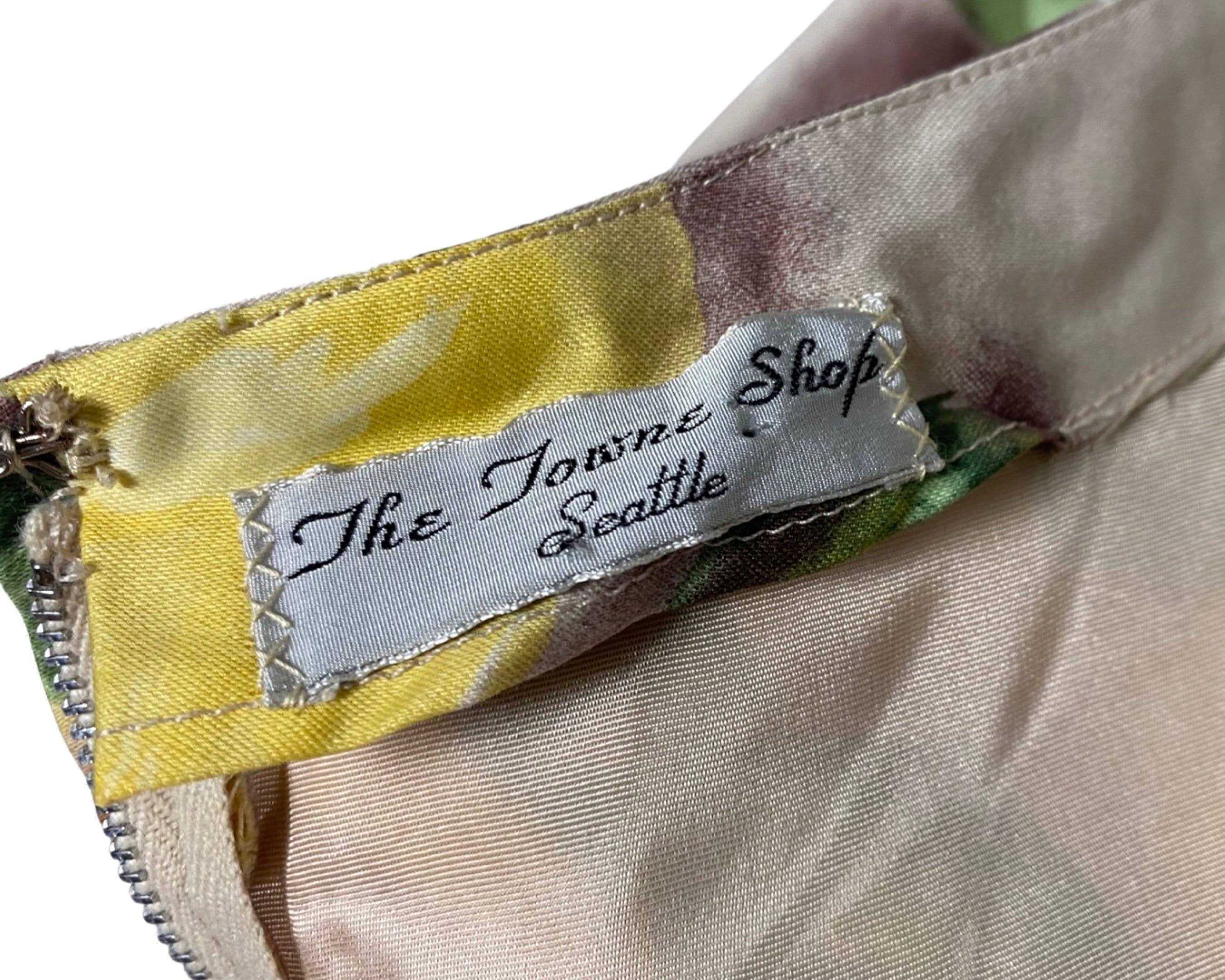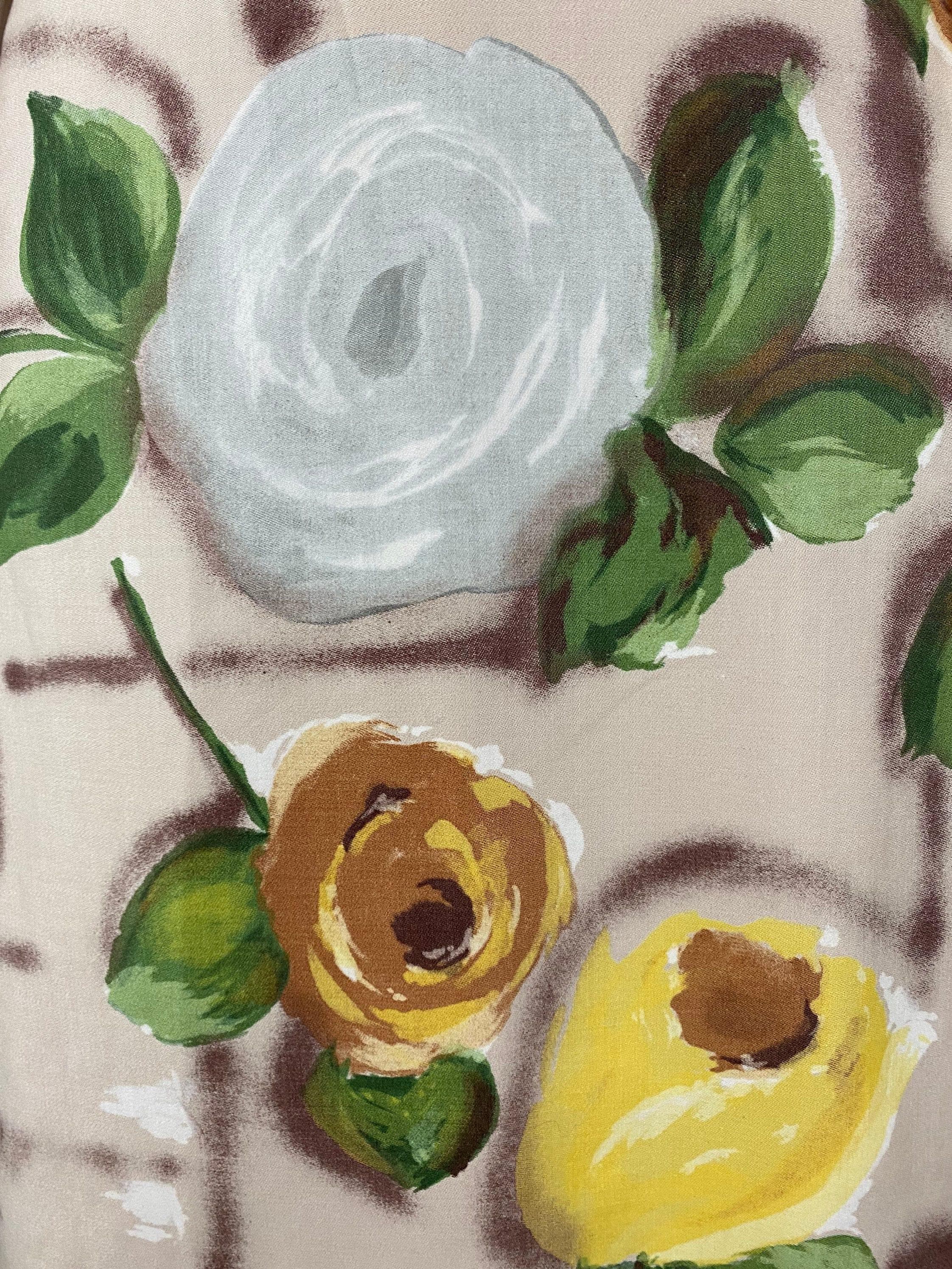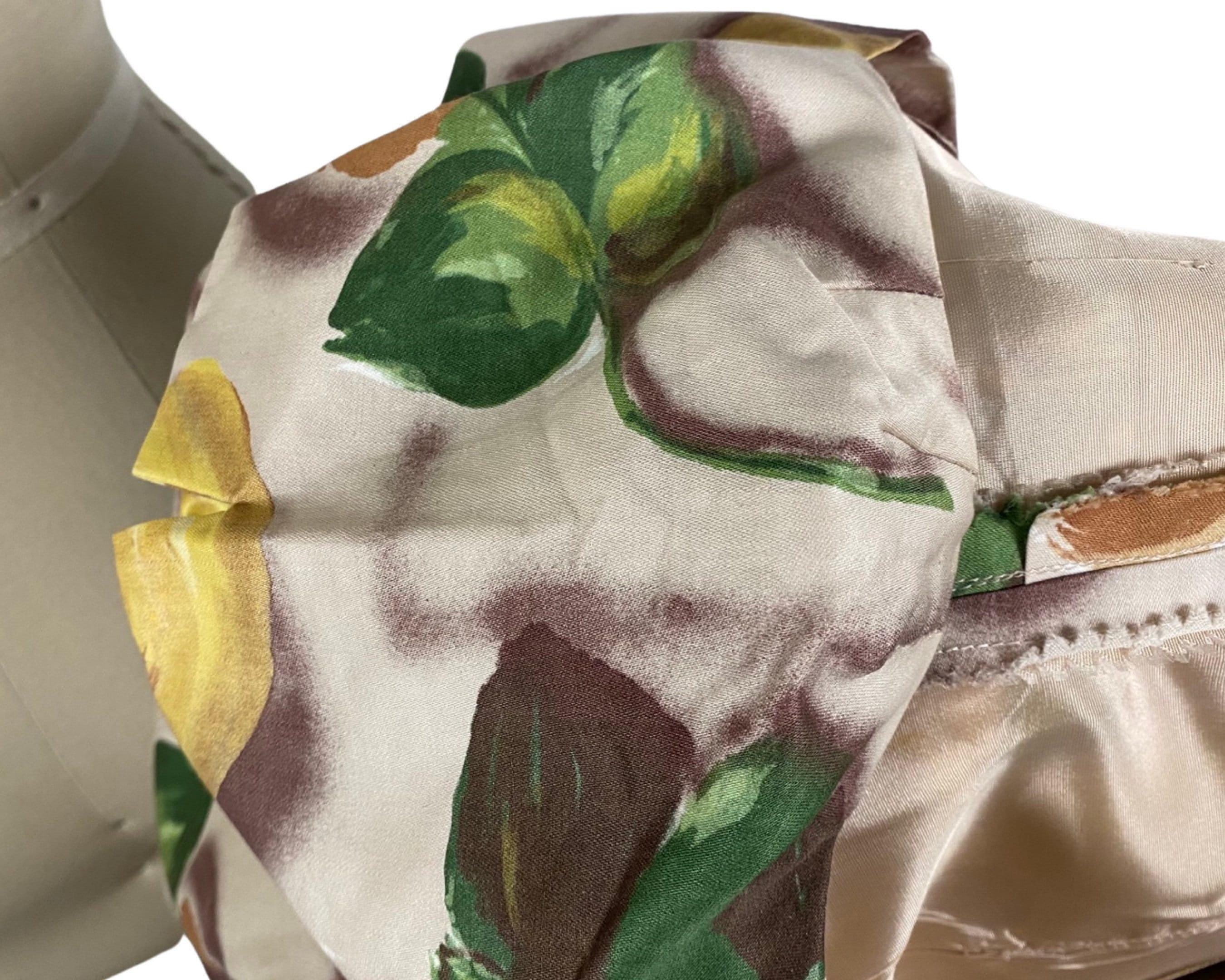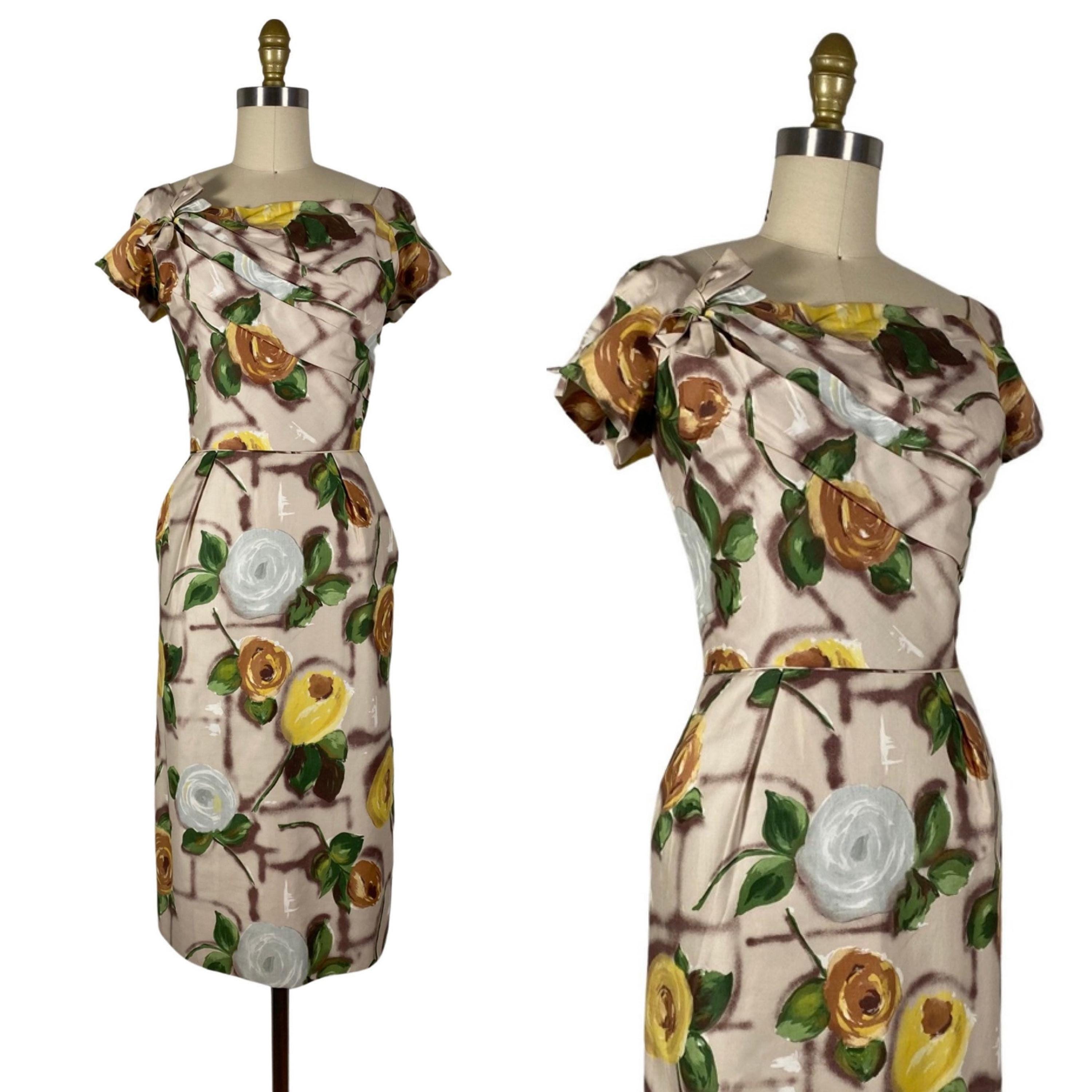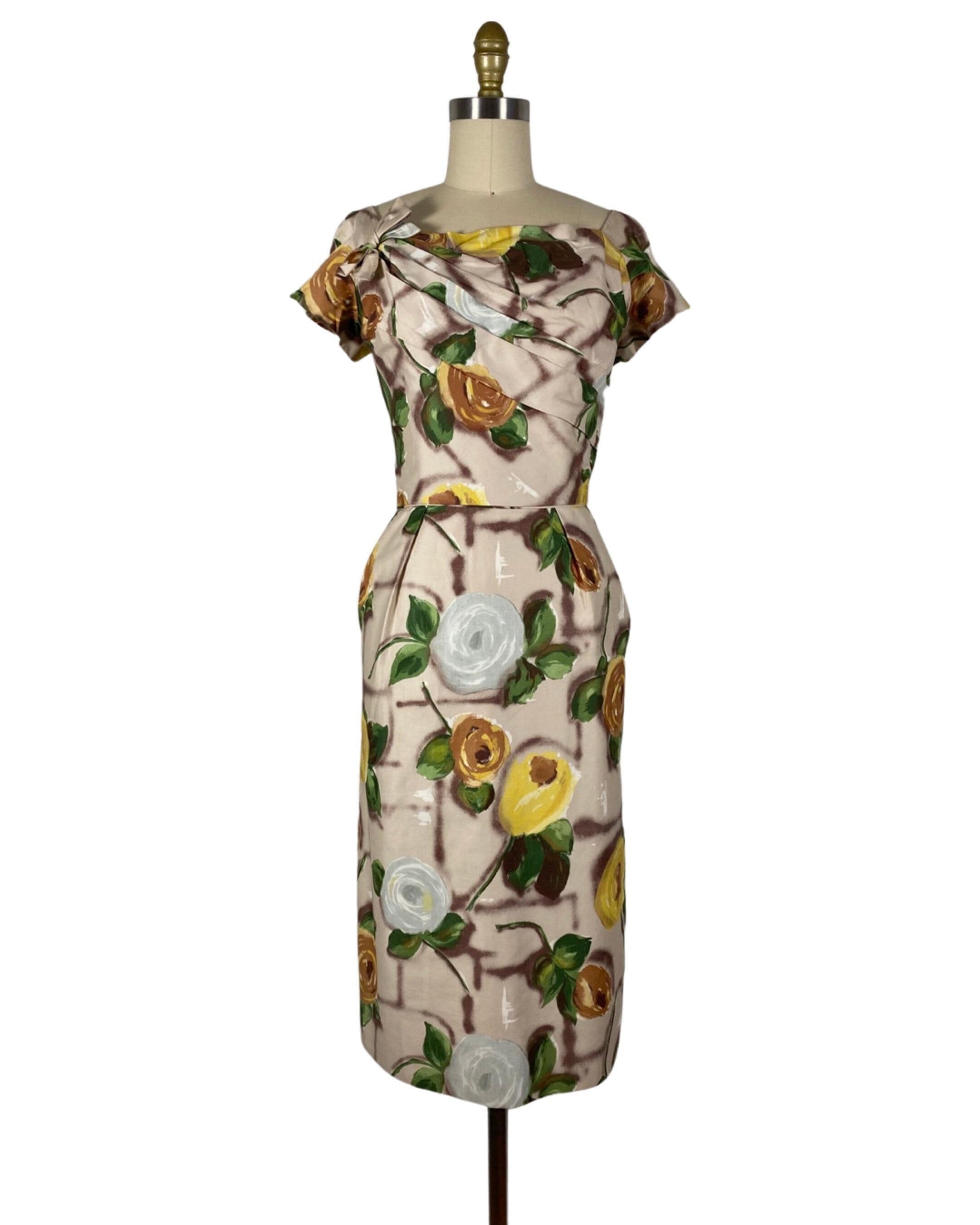 Stunning 1950's cotton sateen cocktail dress in a beautiful ecru, green, yellow and brown floral rose print. Fitted bodice with short cap sleeves and draping detail with little bow at right shoulder. Slim sheath style skirt. Lined in beige taffeta with metal zip at back.