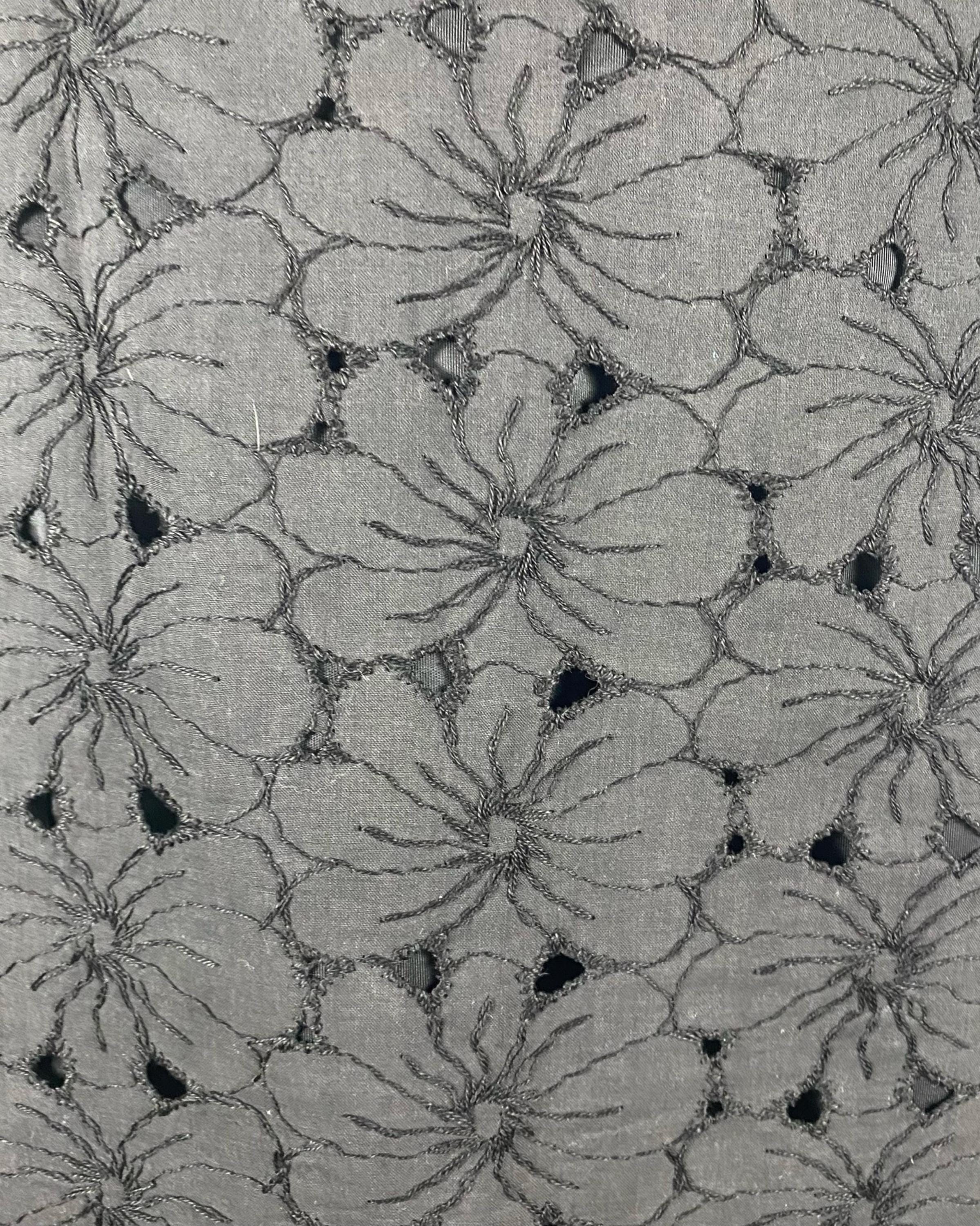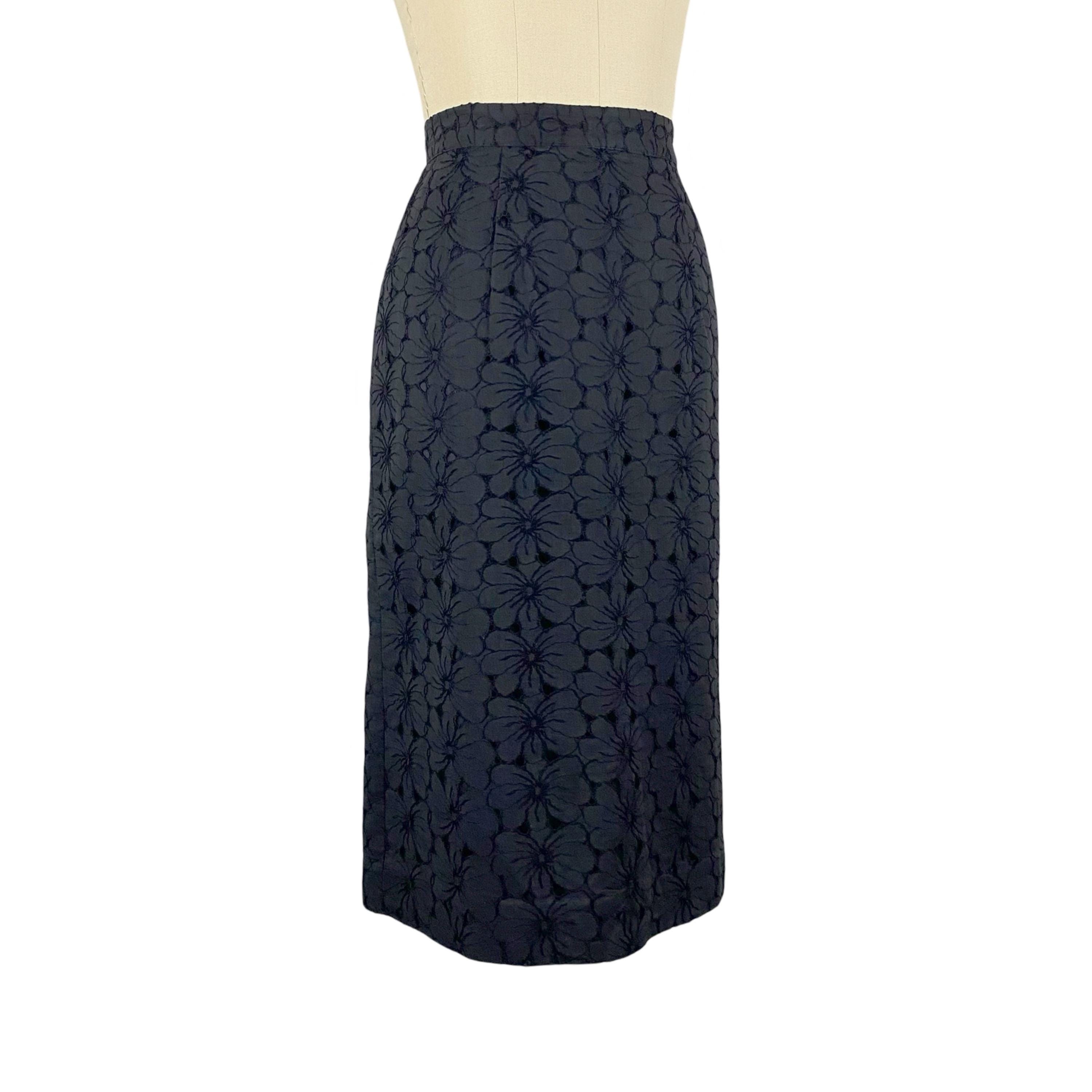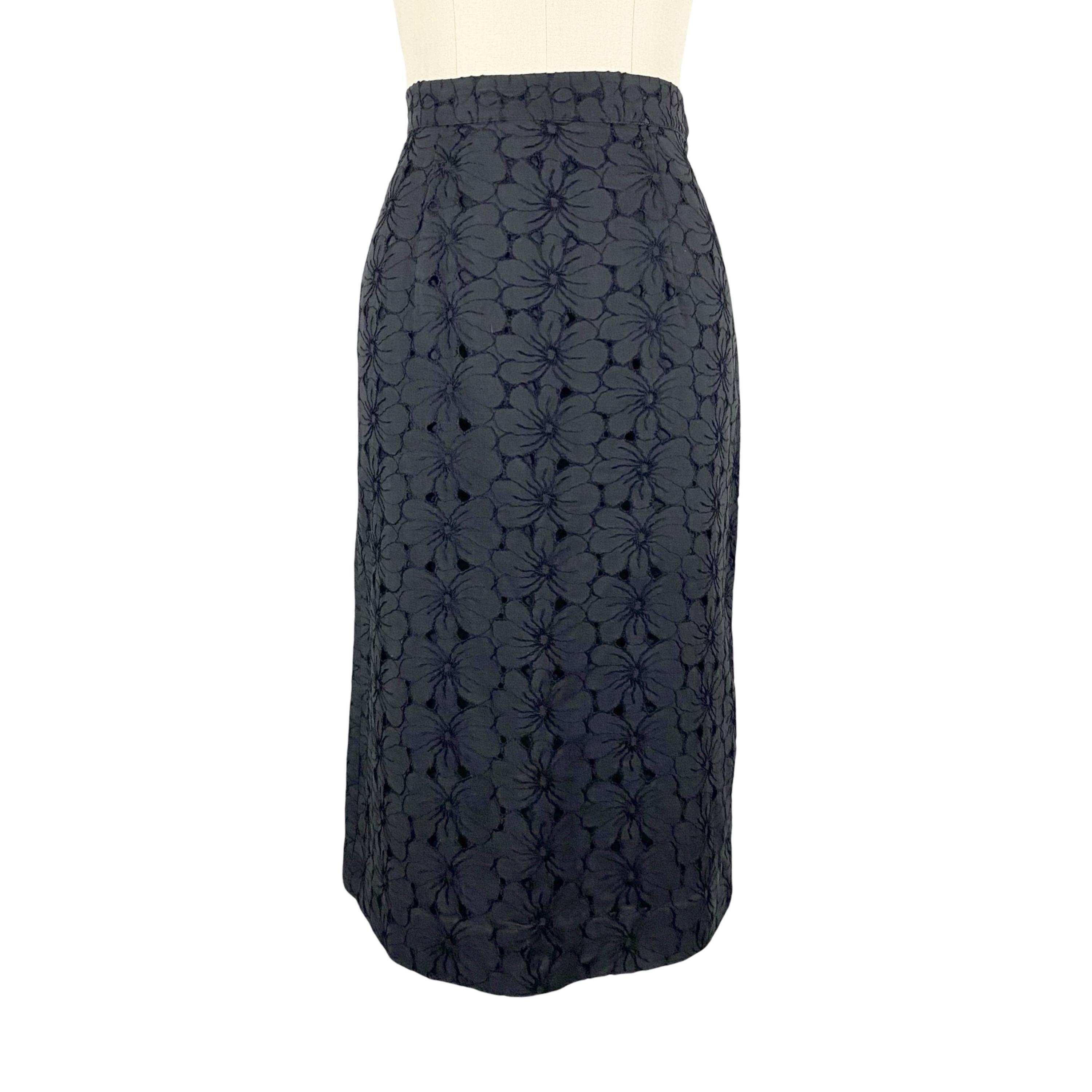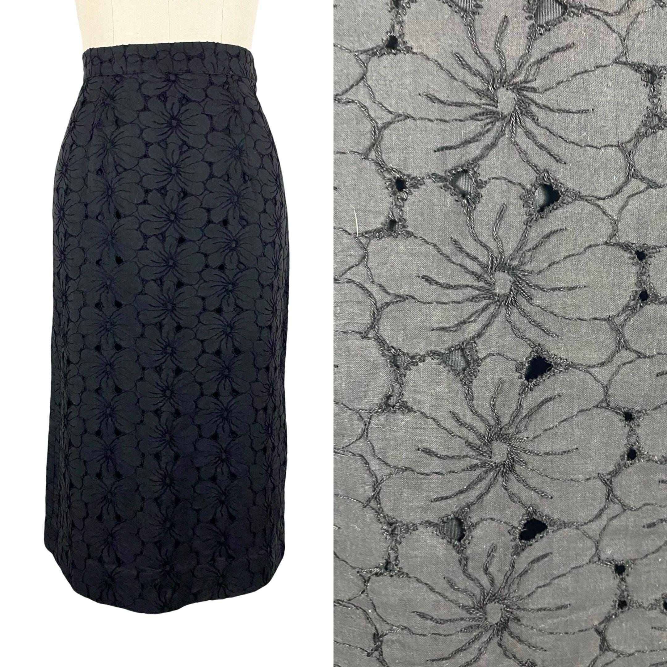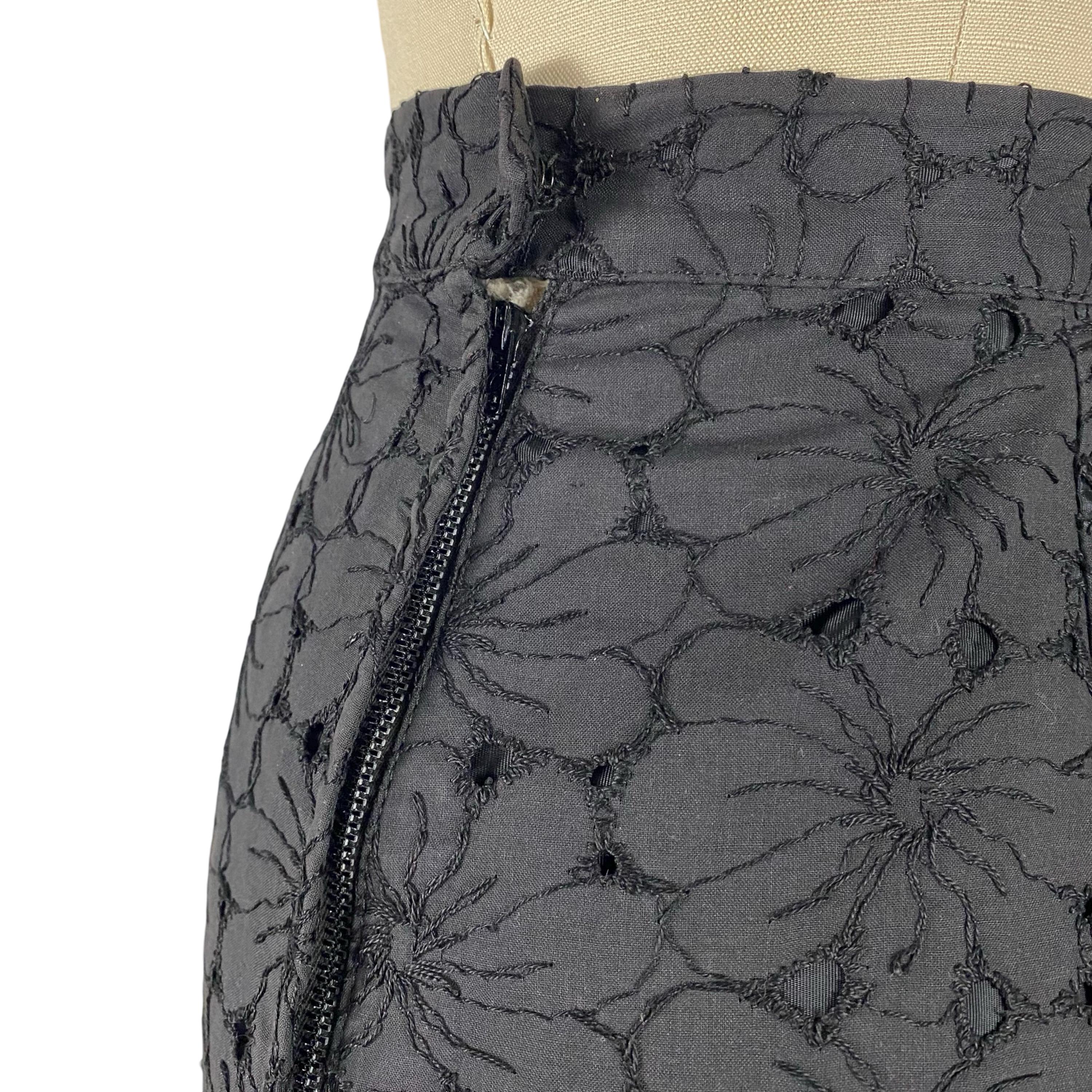 Beautiful 1950's black cotton floral eyelet lace pencil skirt. High waist with zipper and hook and eye closure at side. Fully lined.