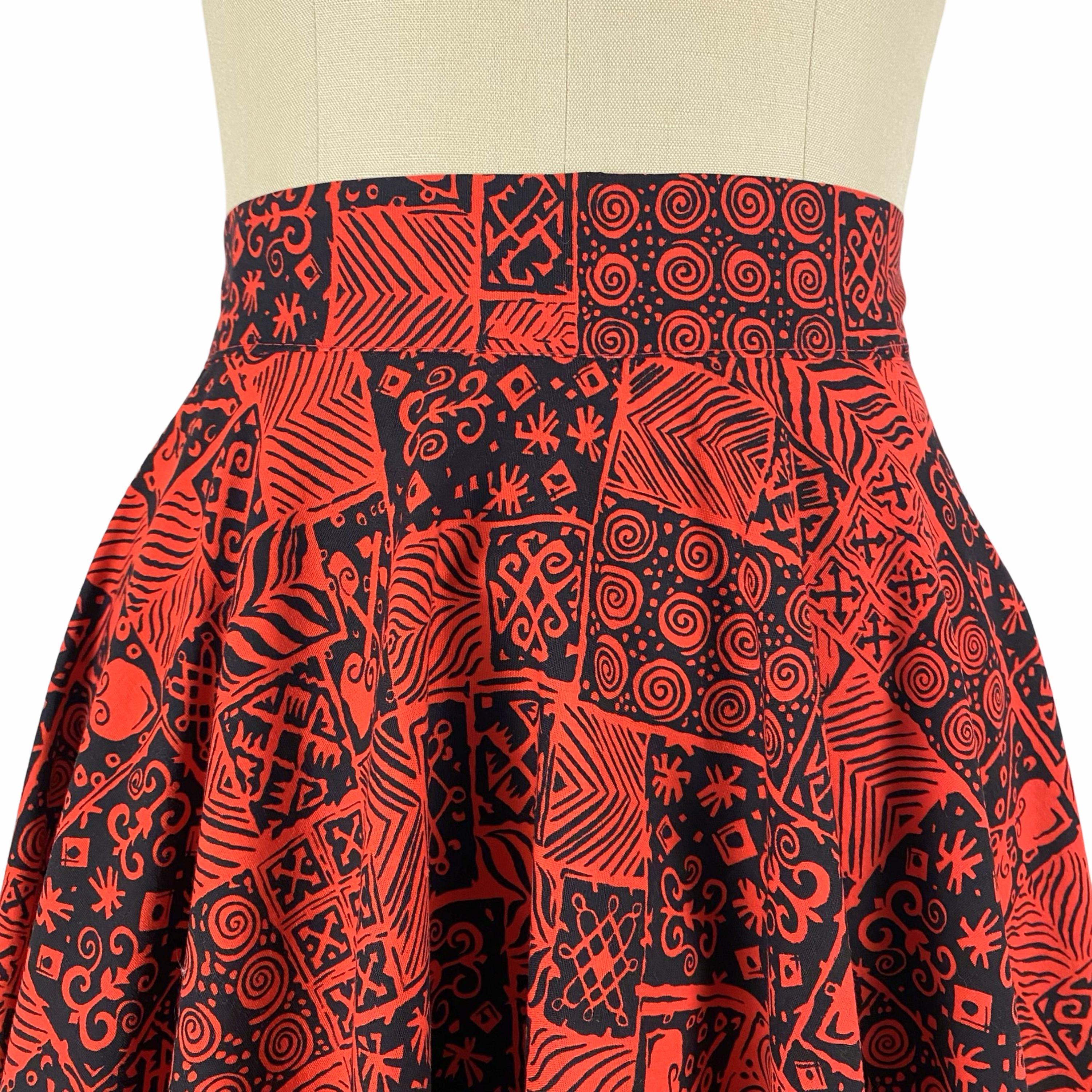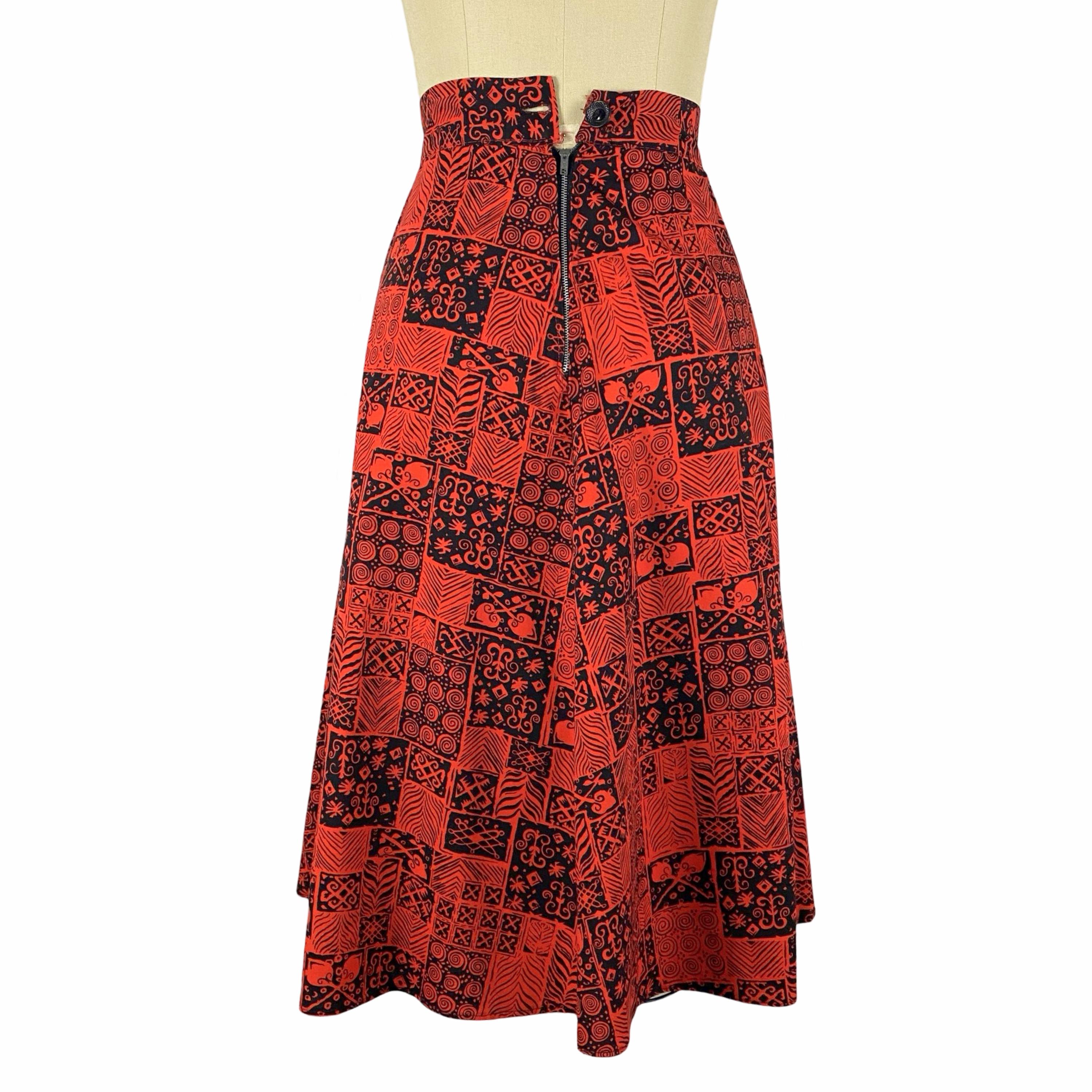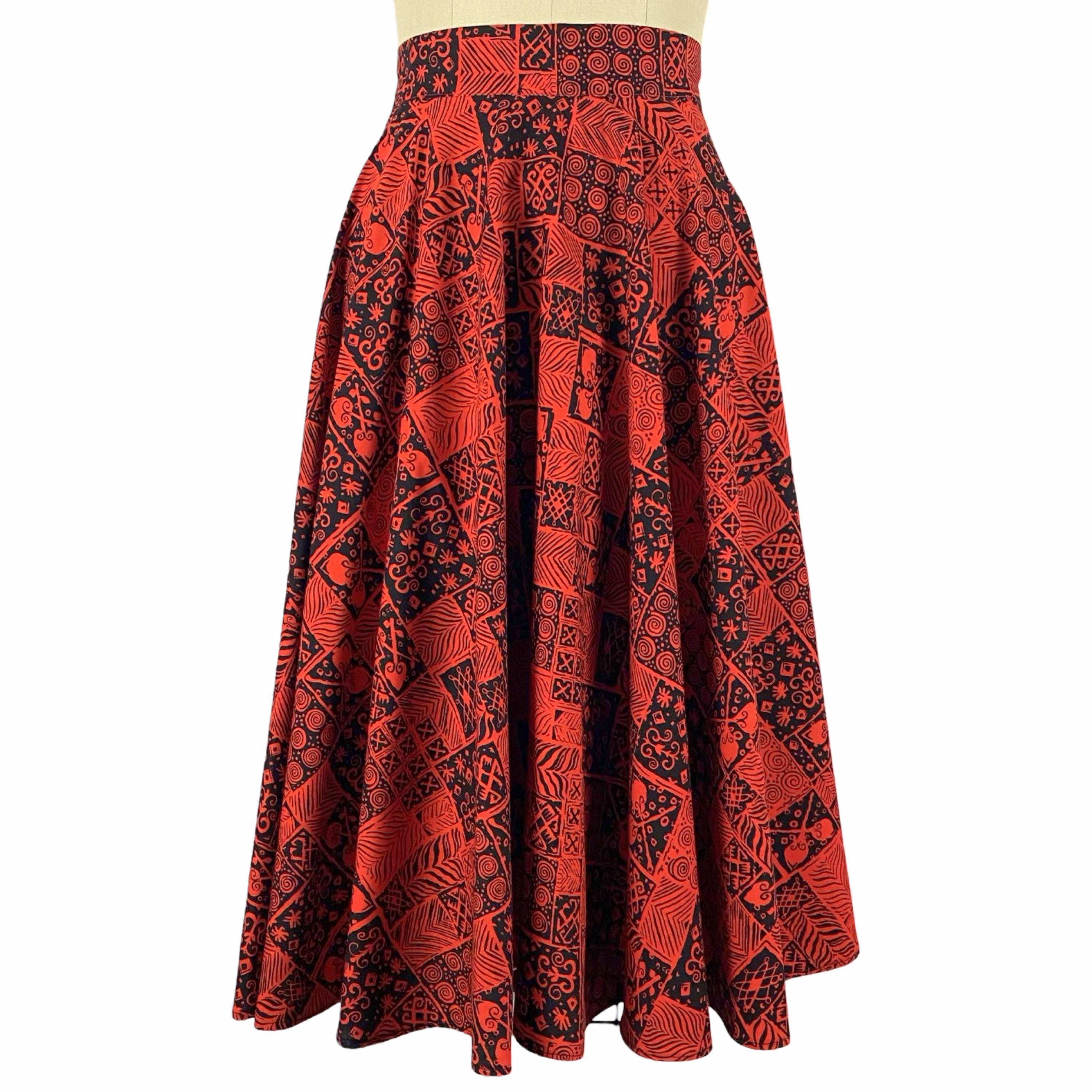 Amazing 1950's red and black cotton block print half circle skirt. Fitted at waist and falls into a flared cut, being more full at the front than at the back. Back metal zip and button closure