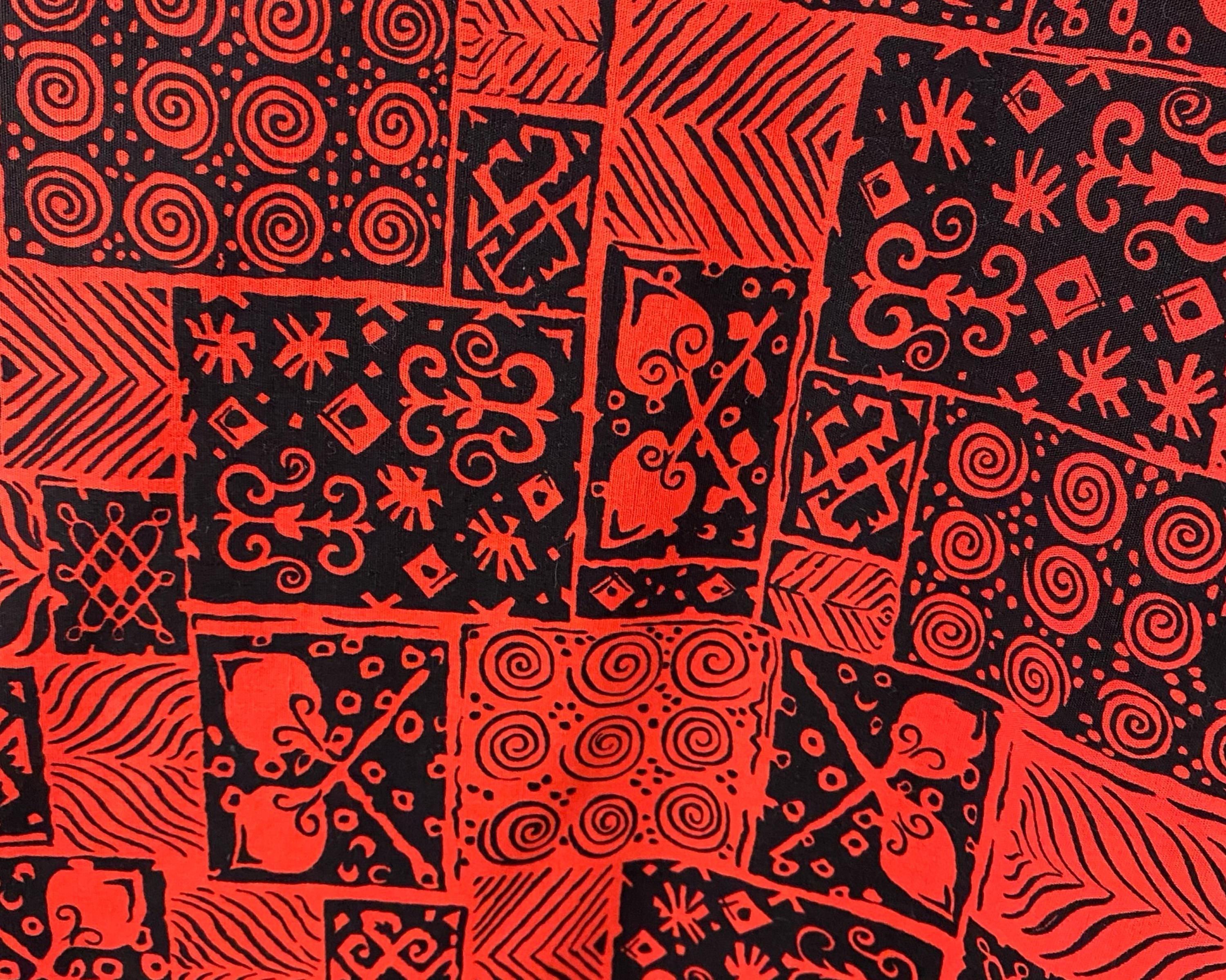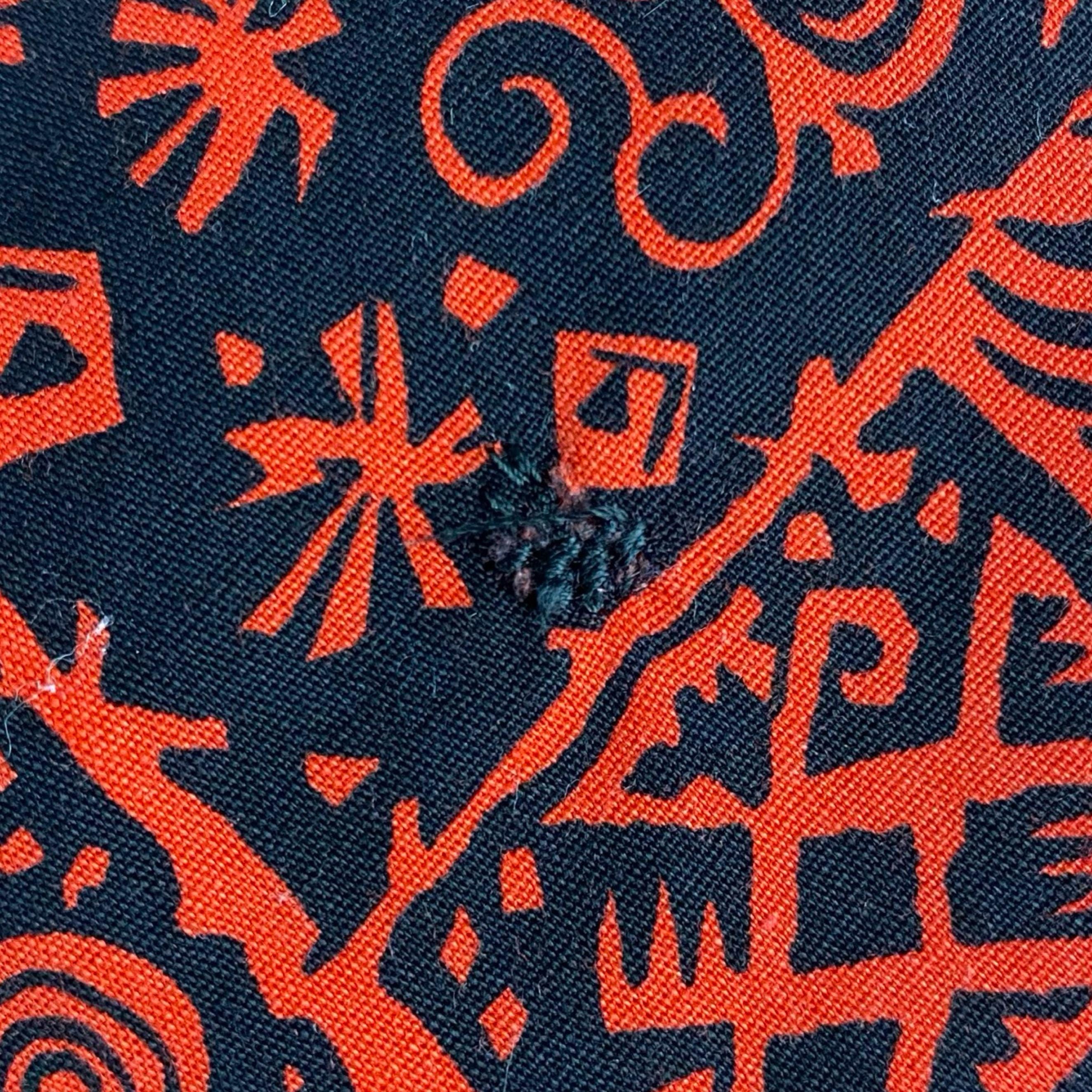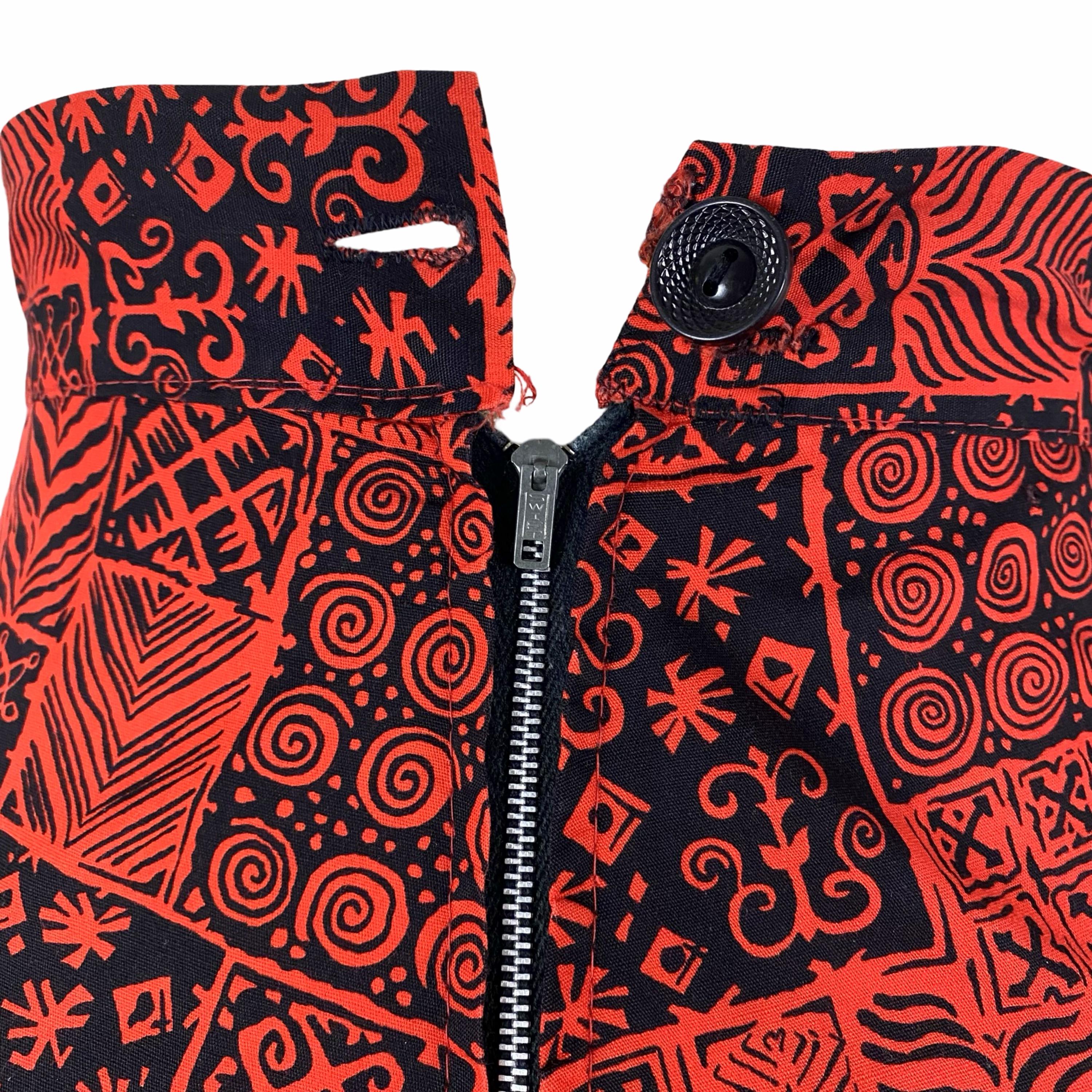 Amazing 1950's red and black cotton block print half circle skirt. Fitted at waist and falls into a flared cut, being more full at the front than at the back. Back metal zip and button closure