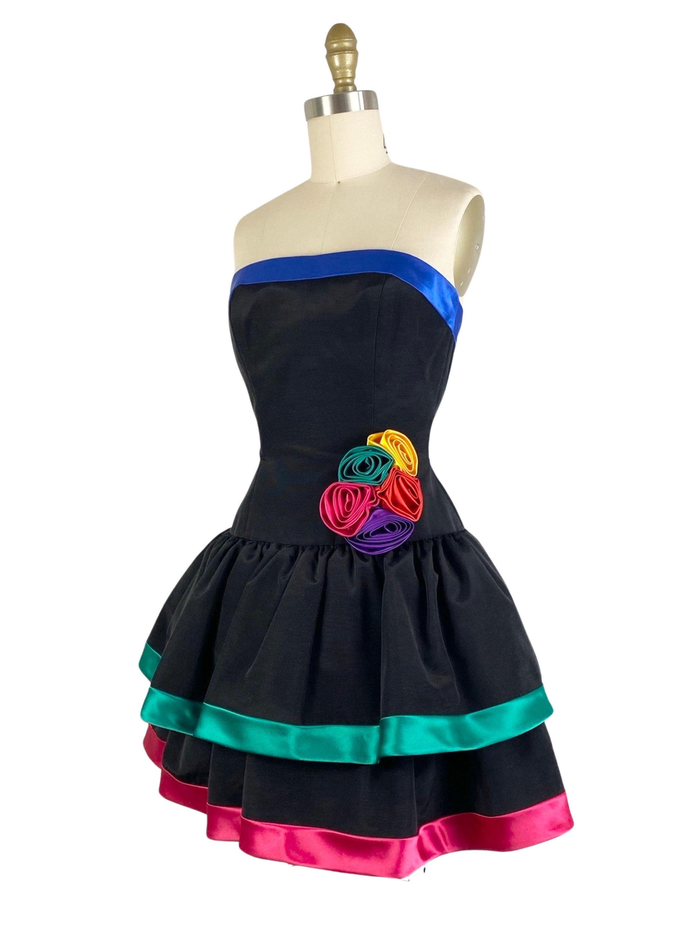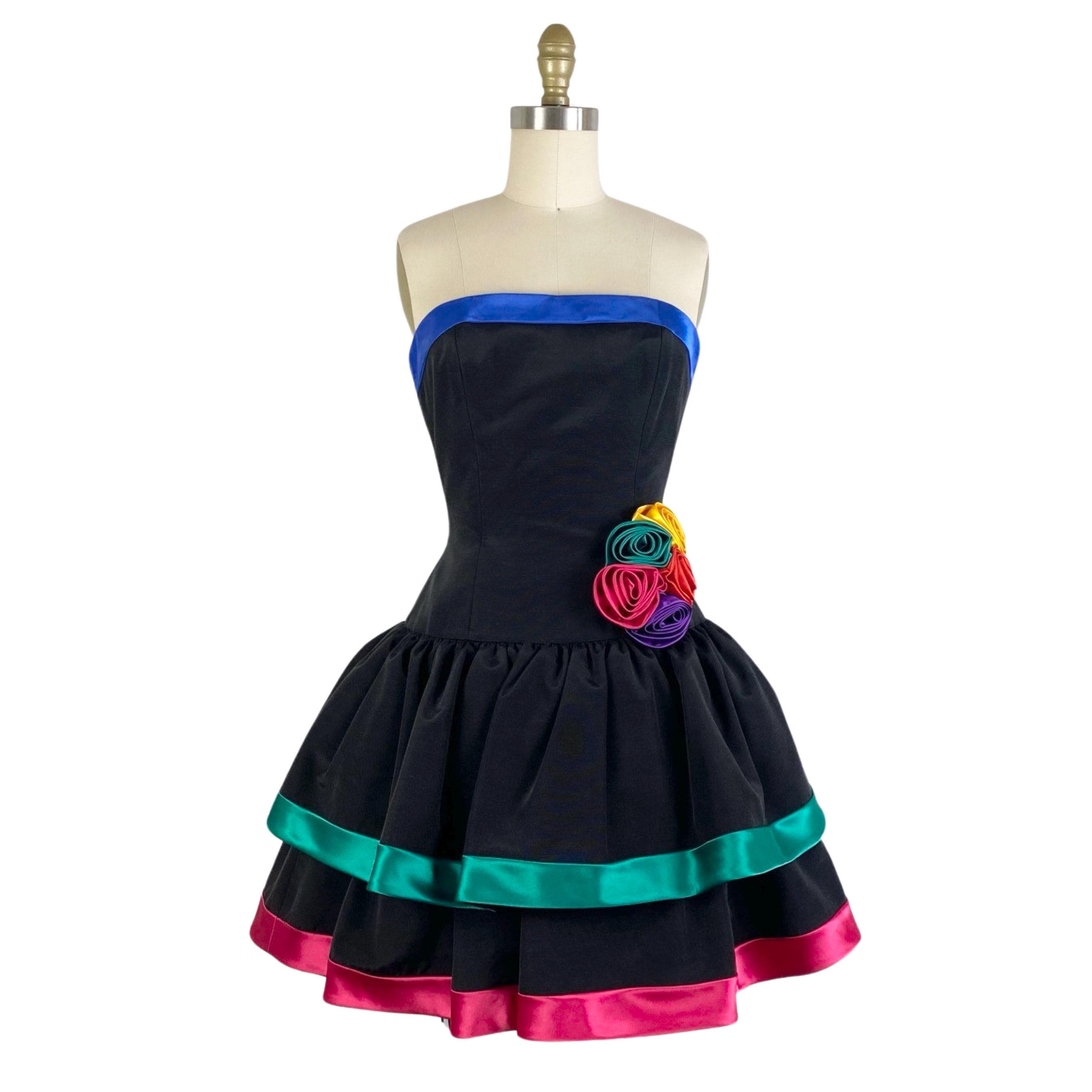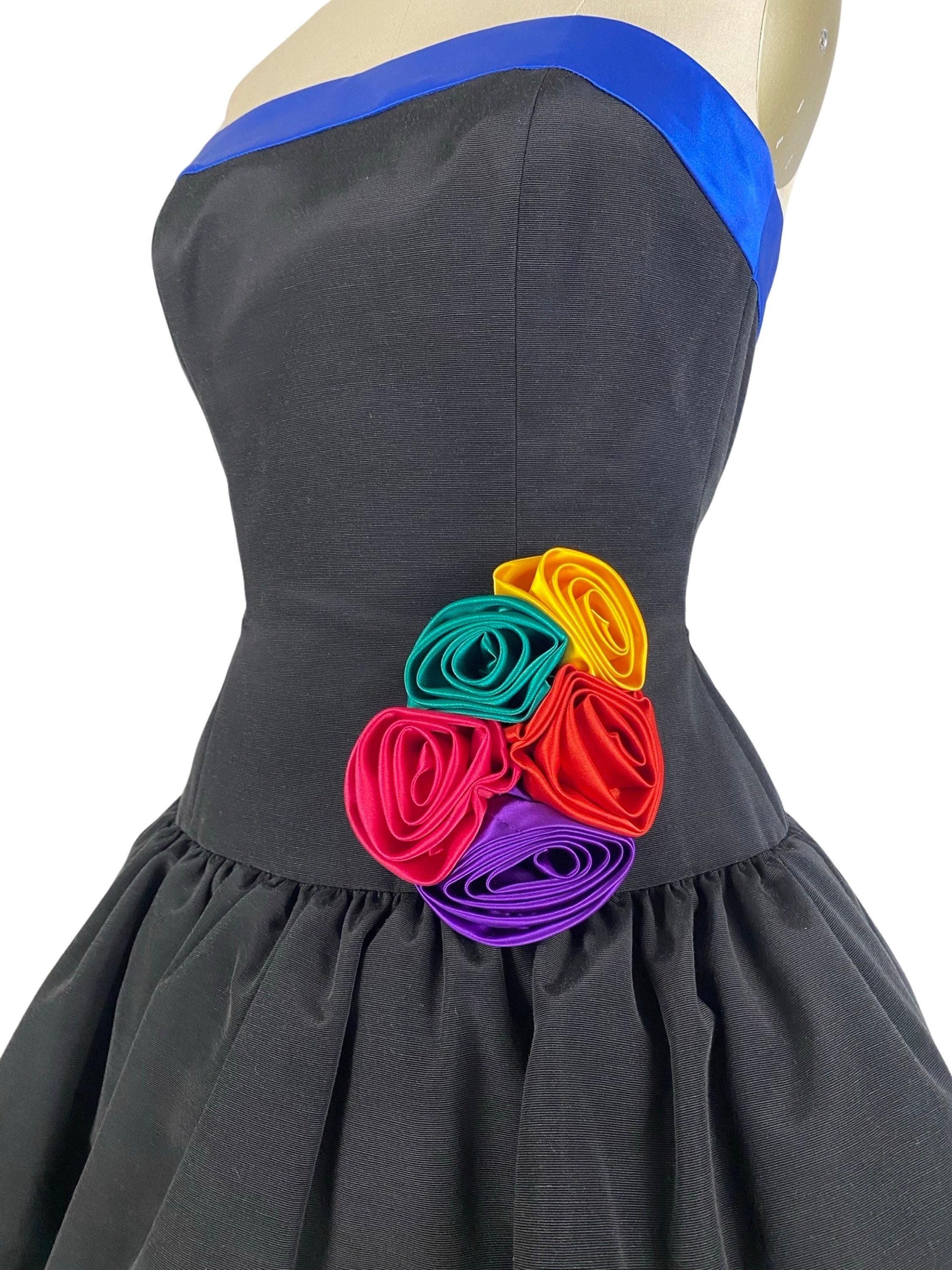 Phenomenal 1980's black faille strapless cocktail dress with striking jewel colored satin ribbon trim and big multi color satin rosette at waist. Structured boned bodice with drop waist and poufy mini skirt. Nylon zip at back and lined in taffeta.