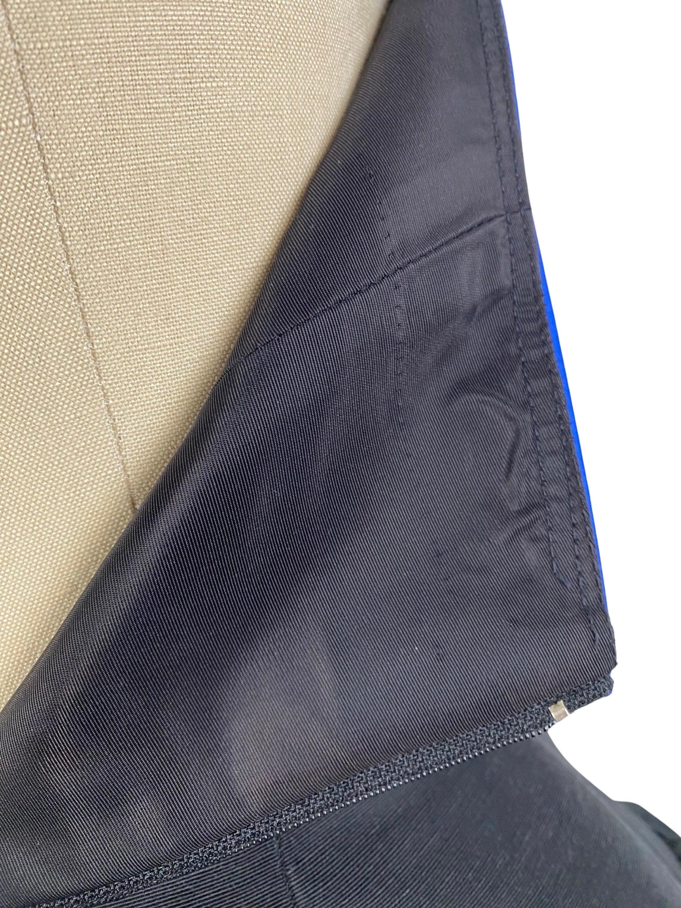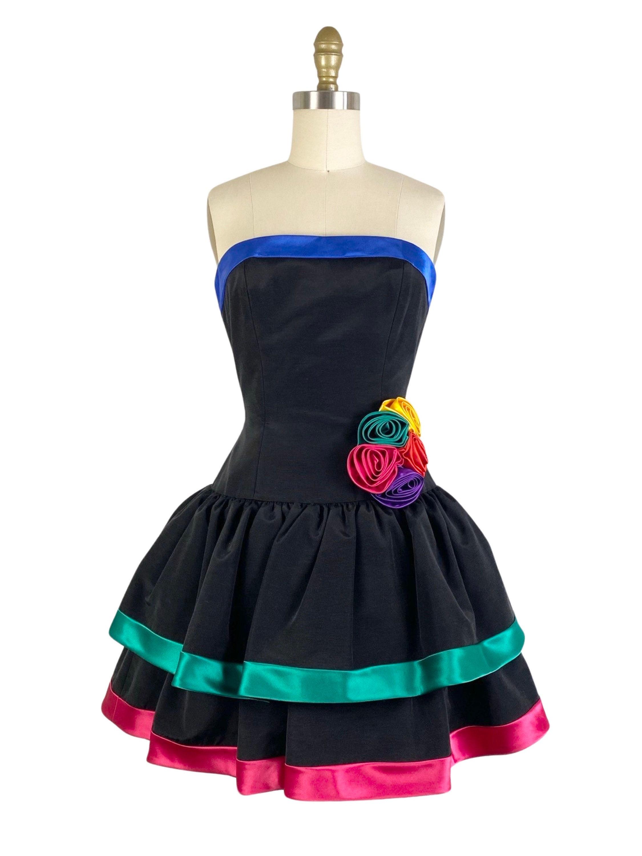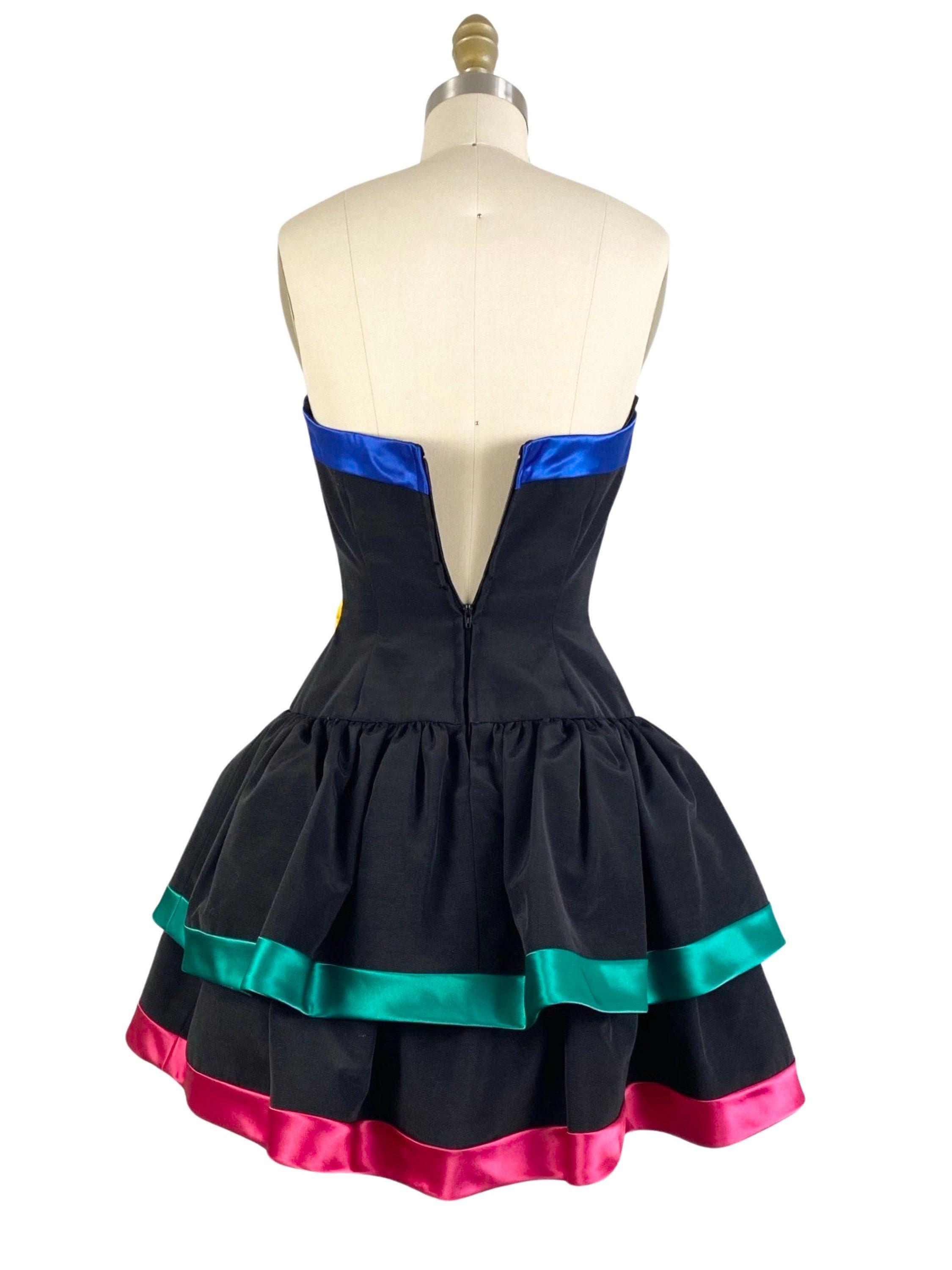 Phenomenal 1980's black faille strapless cocktail dress with striking jewel colored satin ribbon trim and big multi color satin rosette at waist. Structured boned bodice with drop waist and poufy mini skirt. Nylon zip at back and lined in taffeta.