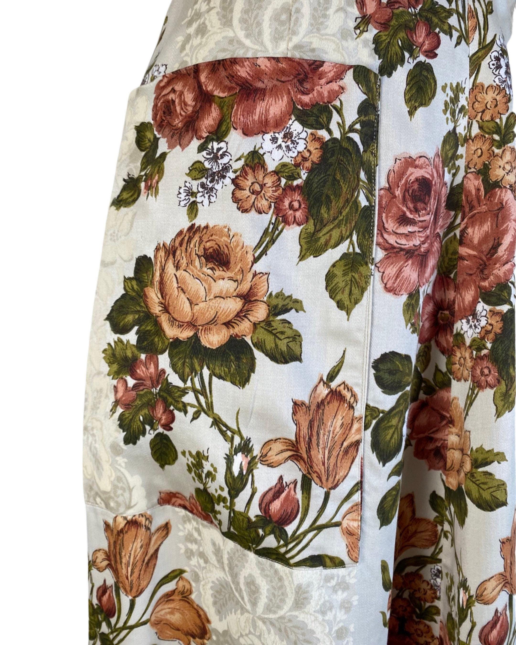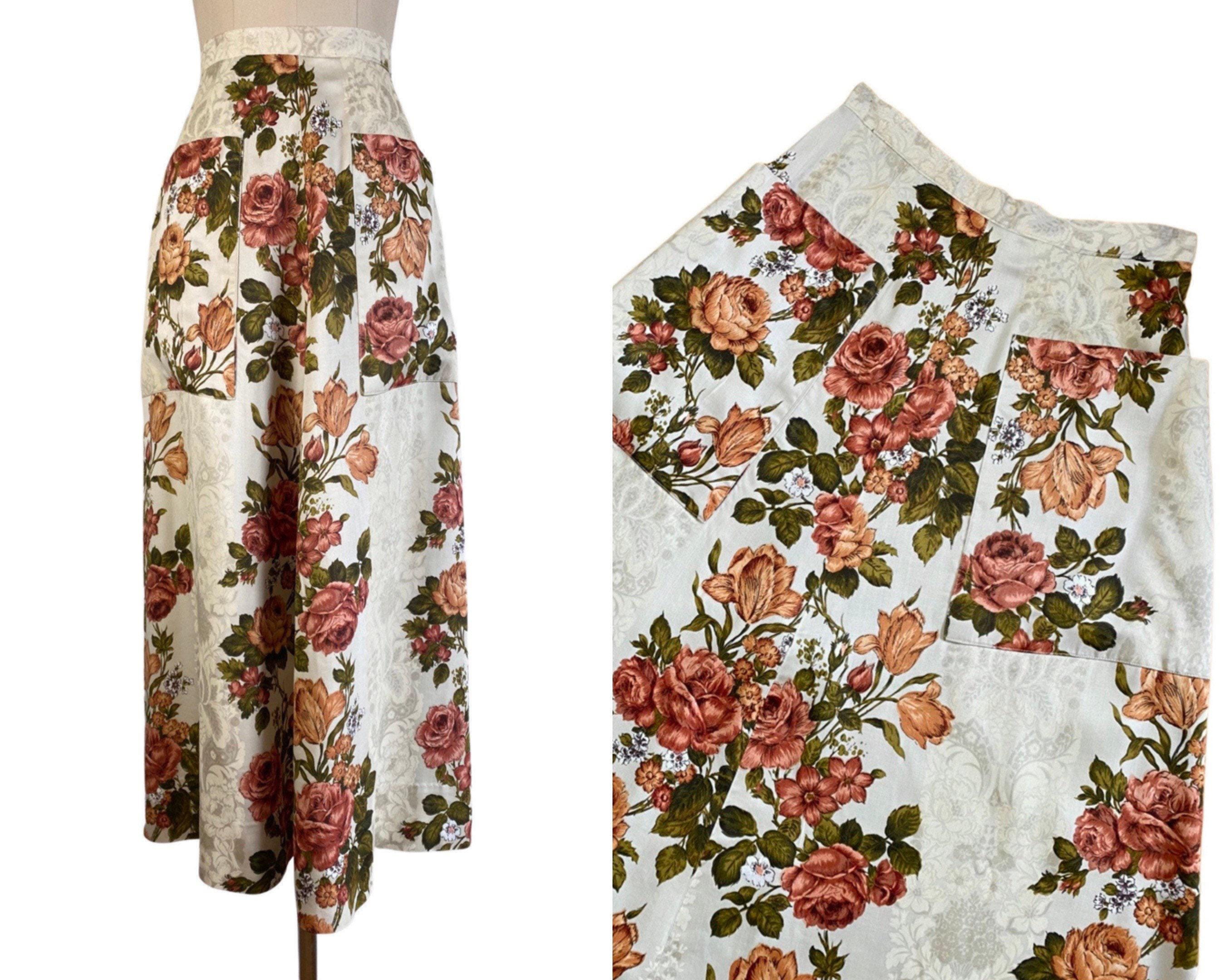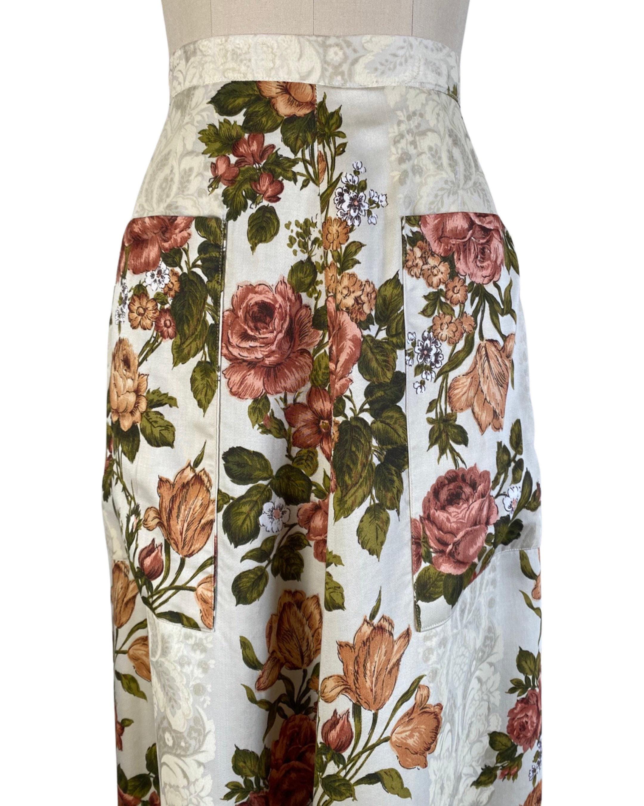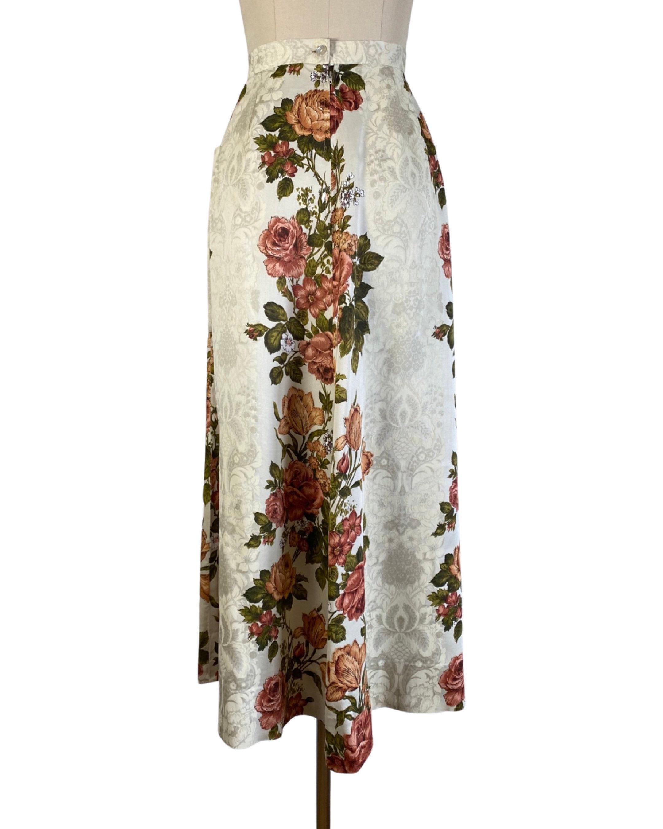 Fabulous 1970's floral maxi skirt in a rust, green and off white colorway with floral shadow print background. A-line shape with two large pockets at each side. Skirt looks to be made from drapes/curtains and feels like a cotton/rayon blend. Back nylon zip and button closure