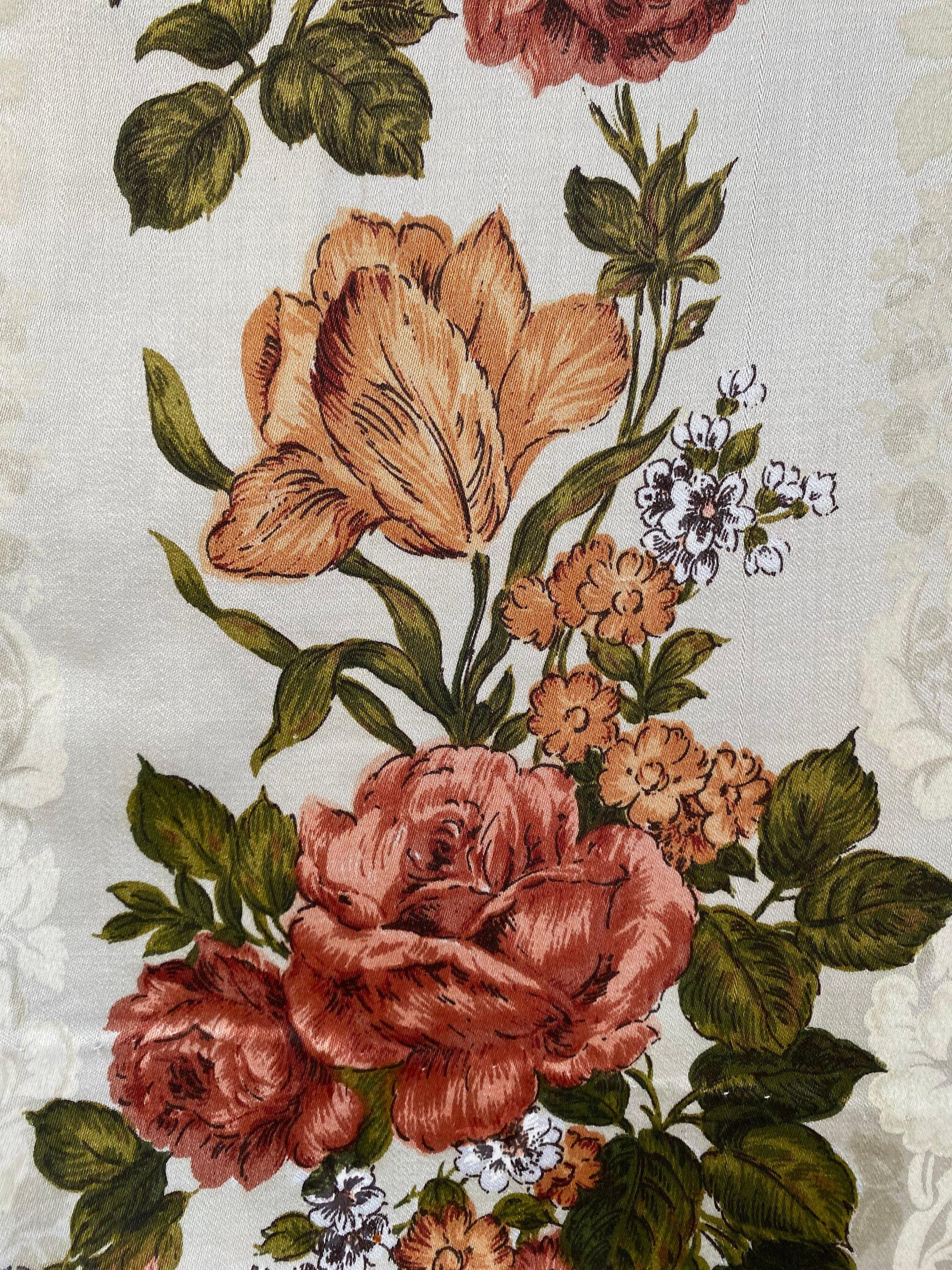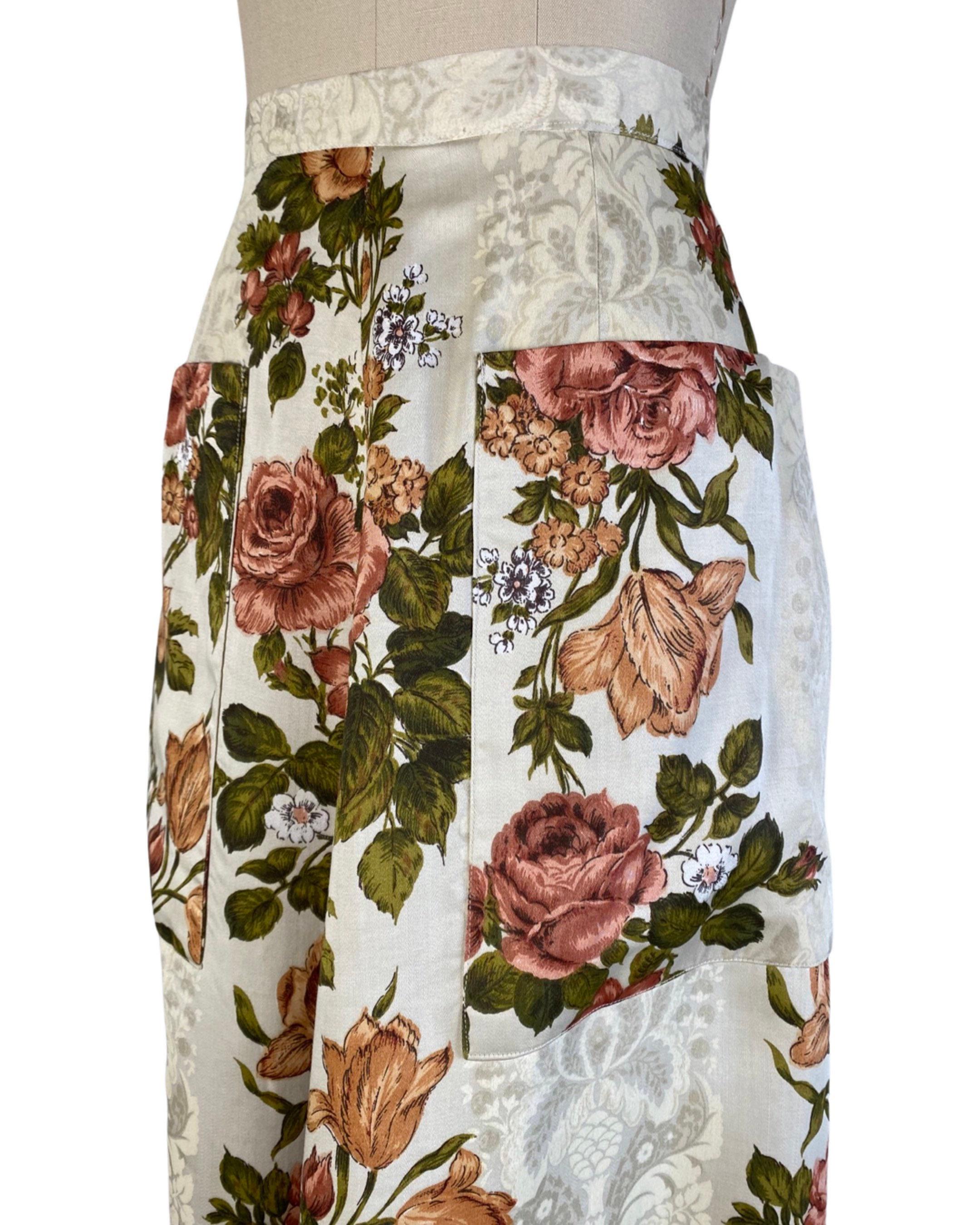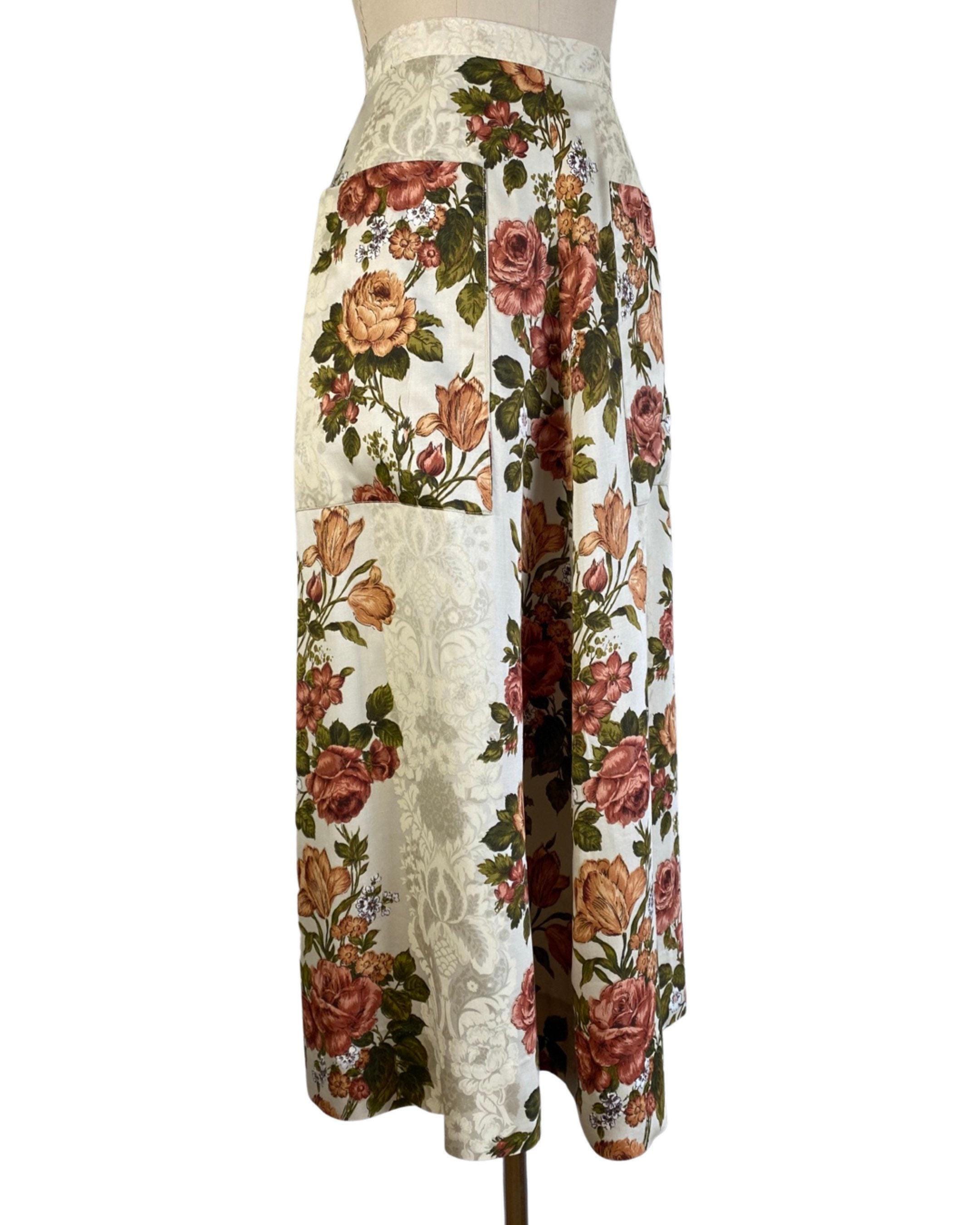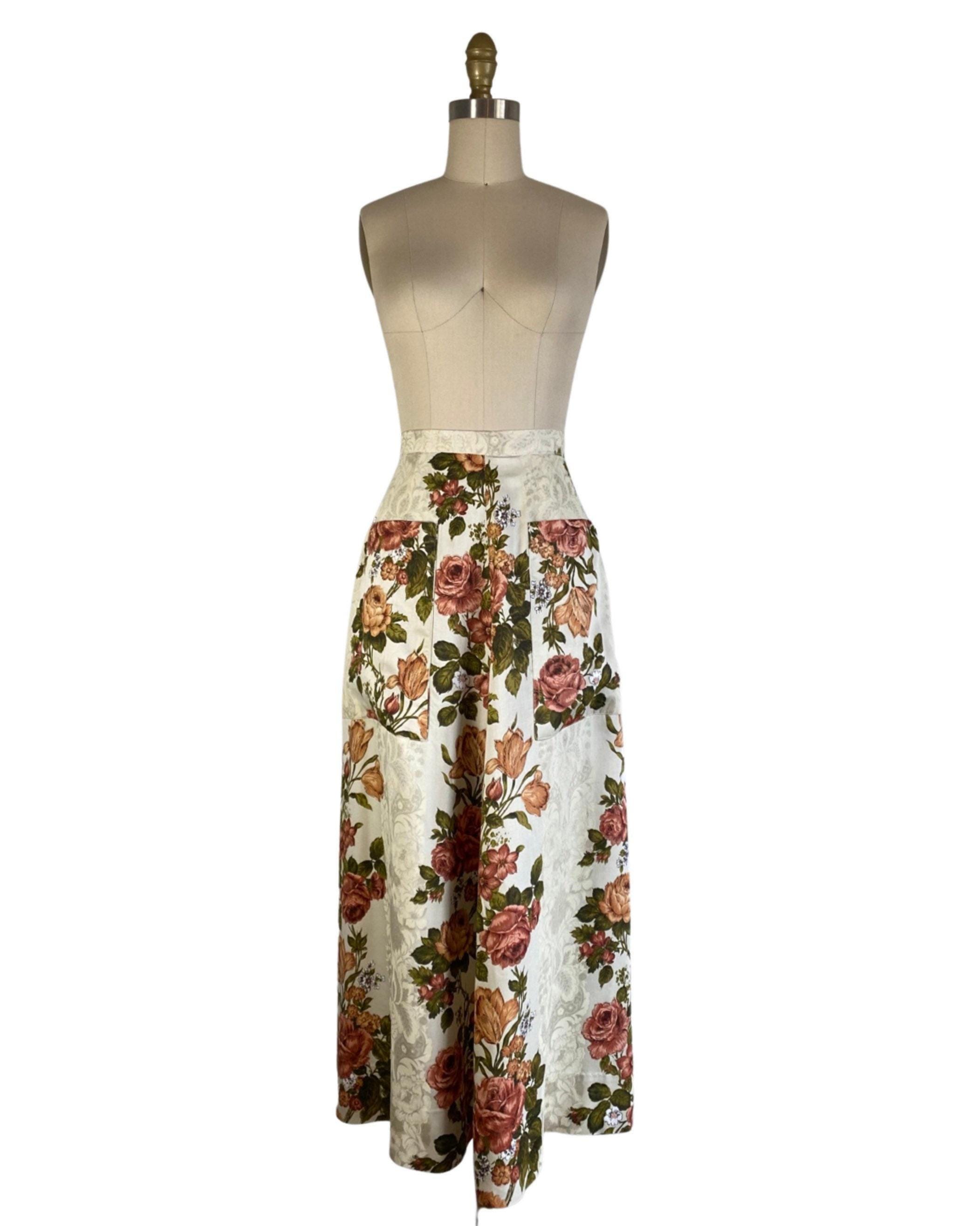 Fabulous 1970's floral maxi skirt in a rust, green and off white colorway with floral shadow print background. A-line shape with two large pockets at each side. Skirt looks to be made from drapes/curtains and feels like a cotton/rayon blend. Back nylon zip and button closure