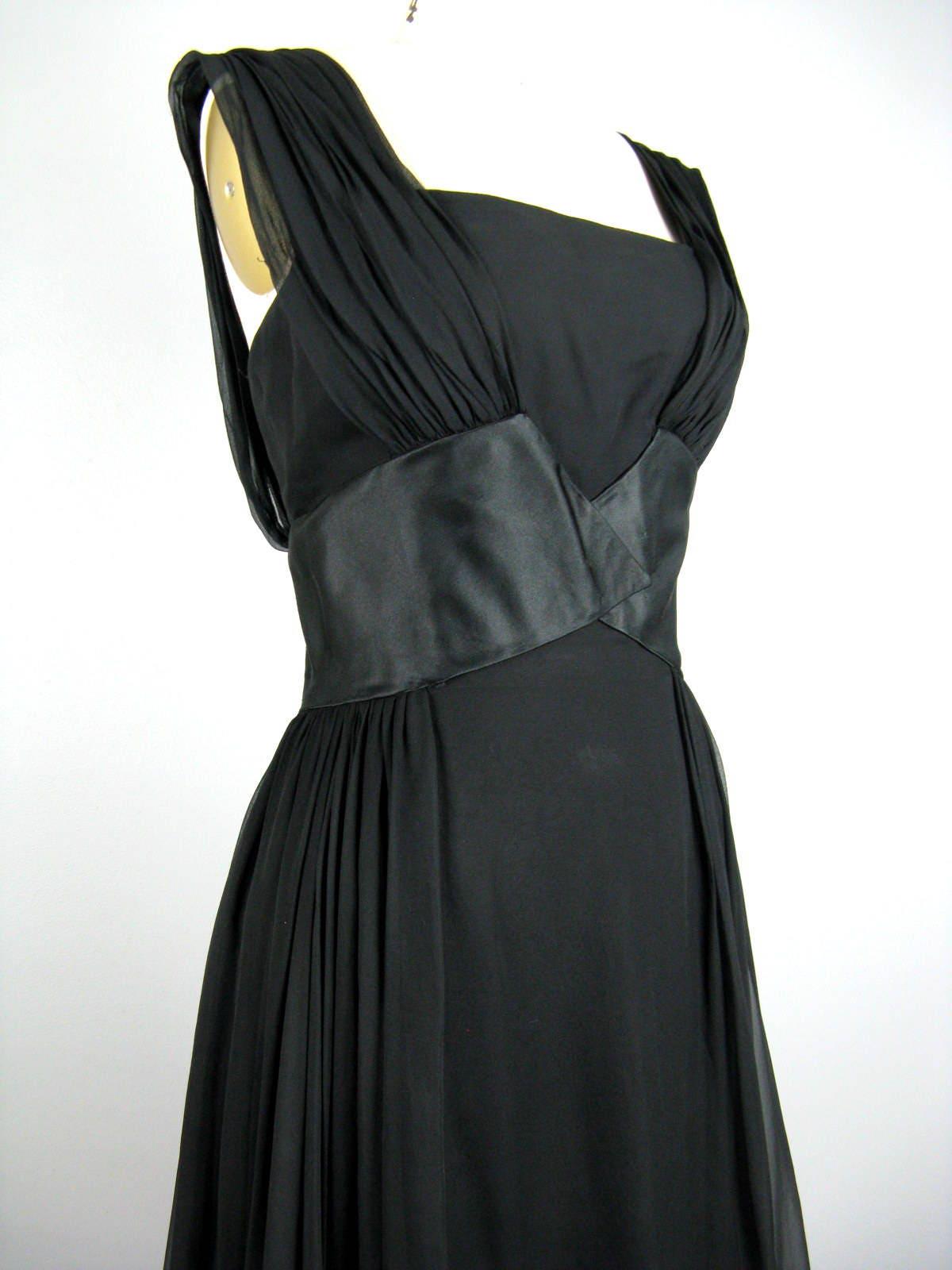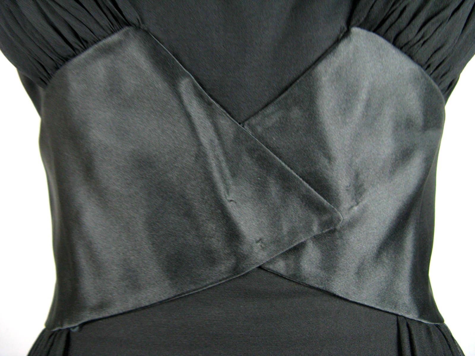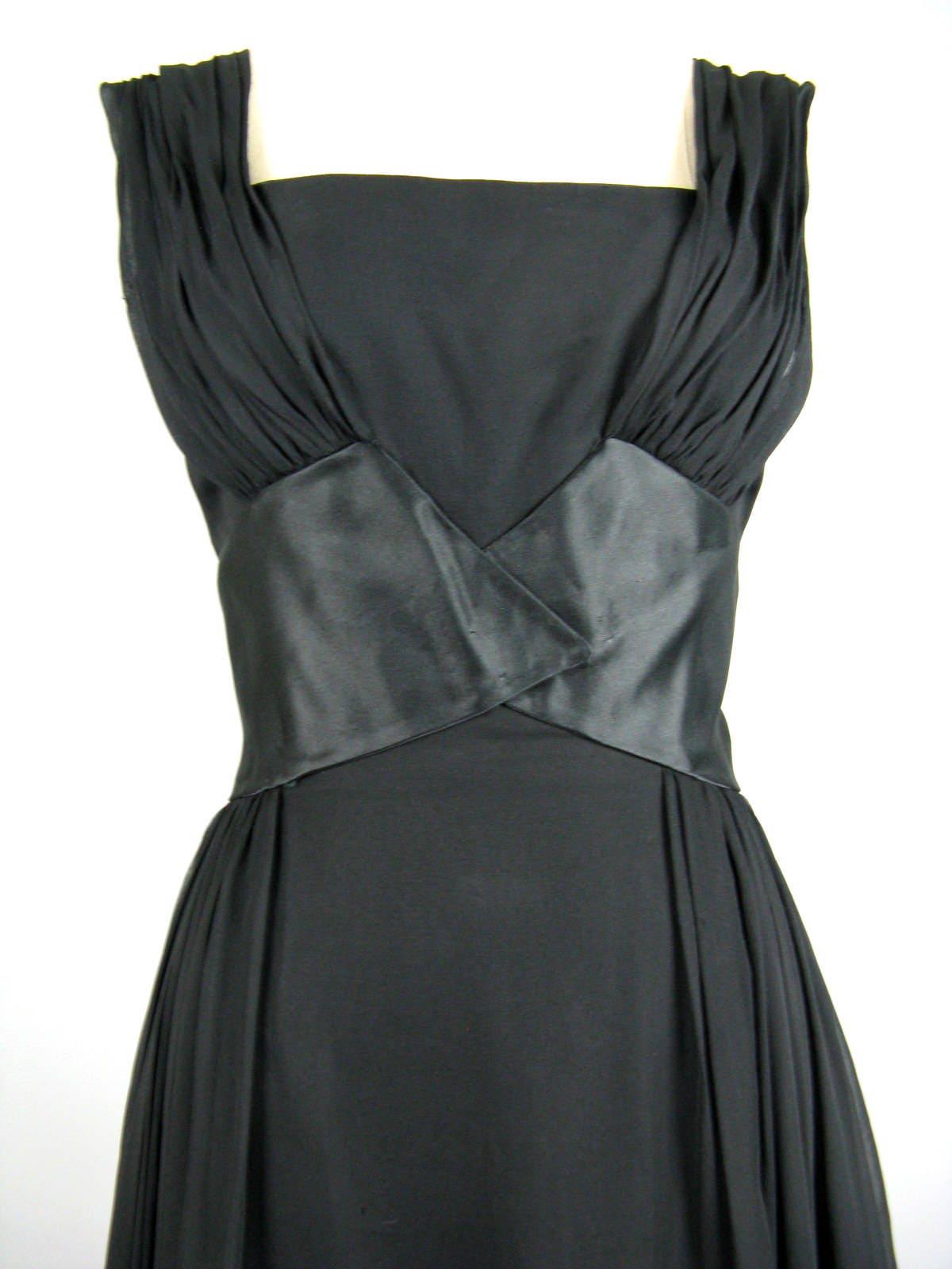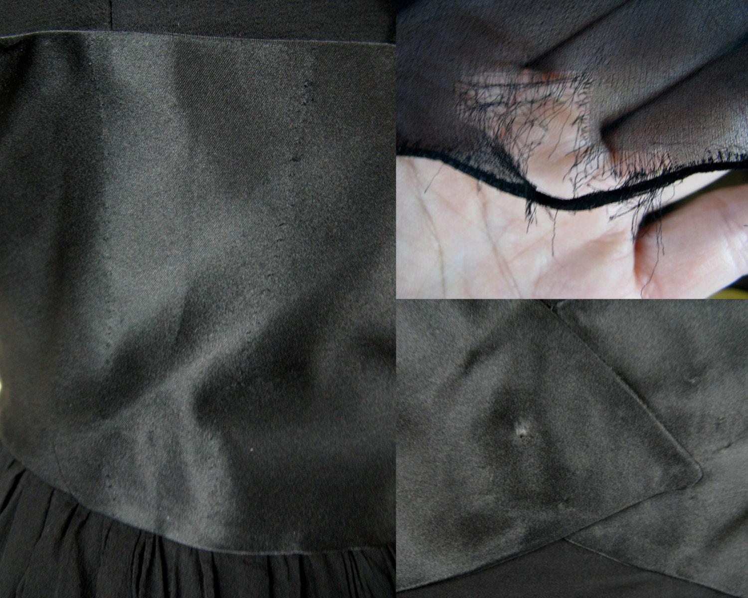 Flowing black silk chiffon, silk satin waist and shelf bust with ruched chiffon straps. Sexy V-back with metal zip. Bodice lined in a semi stiff cotton for structure. Skirt is lined in black rayon.