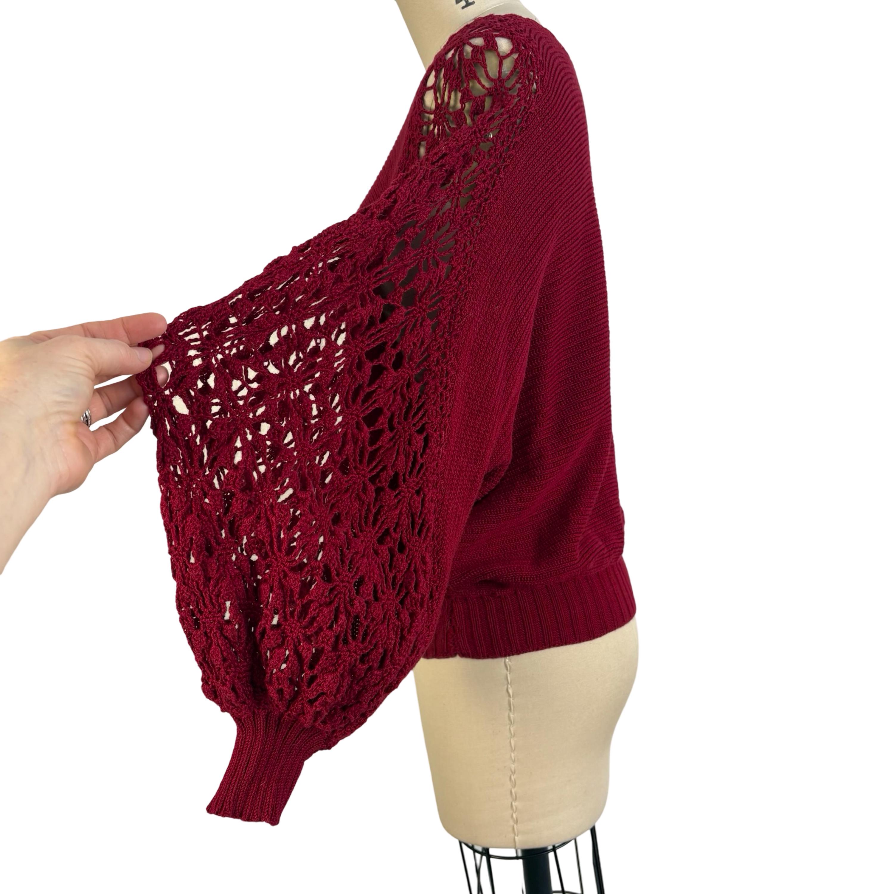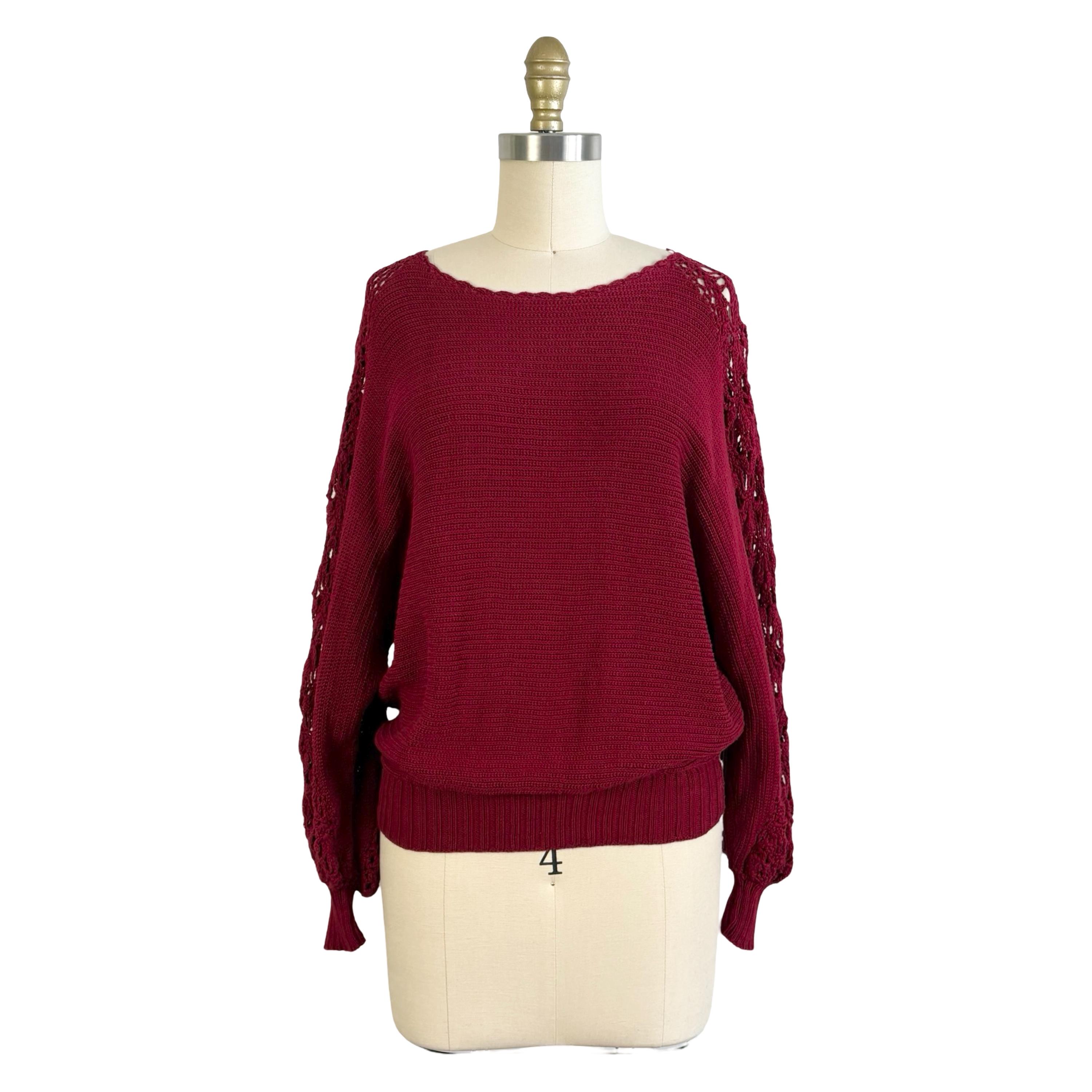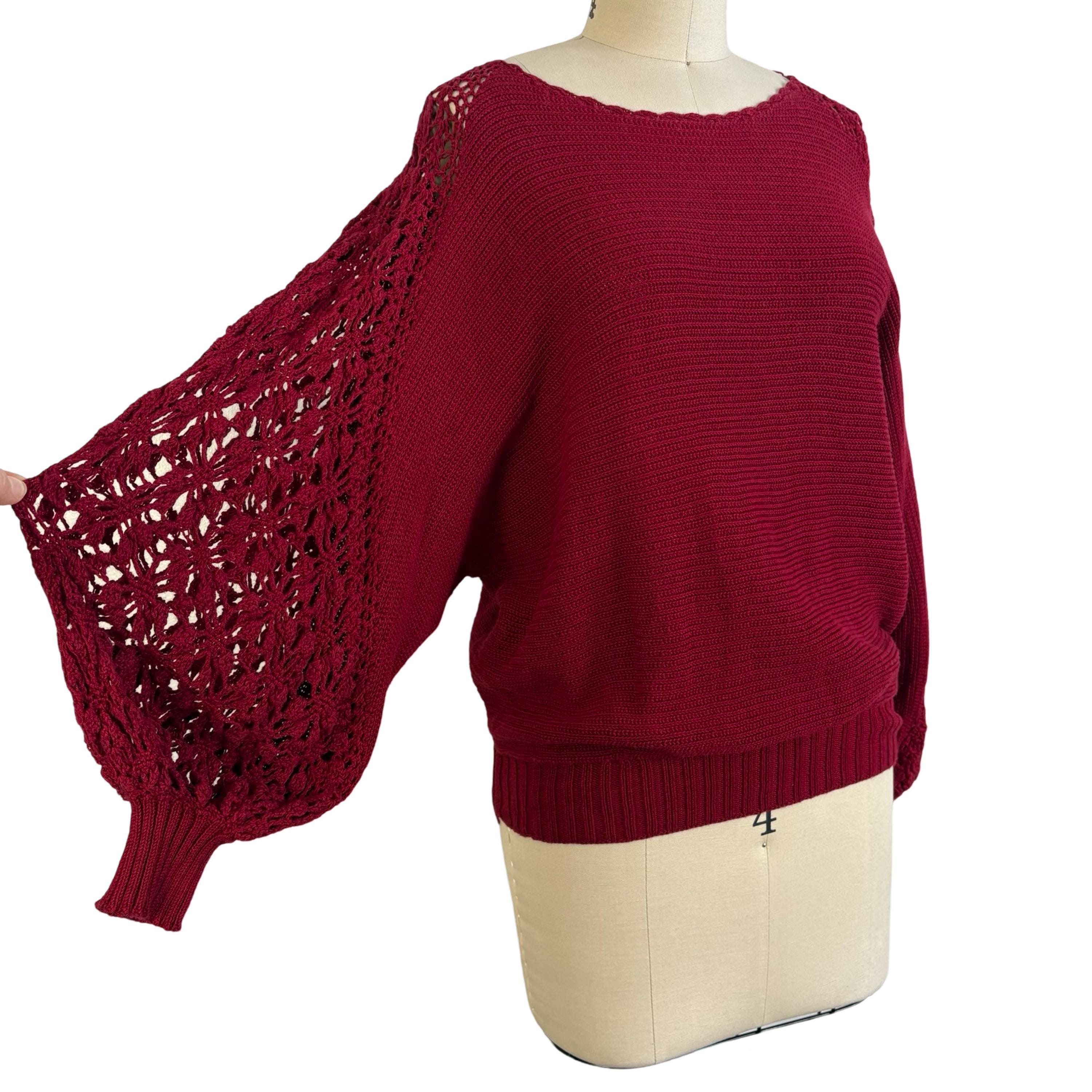Chic 1970's cotton knit maroon sweater with phenomenal crochet balloon sleeves. Wide boat neckline and pullover style with no fasteners. Falls to mid hip.