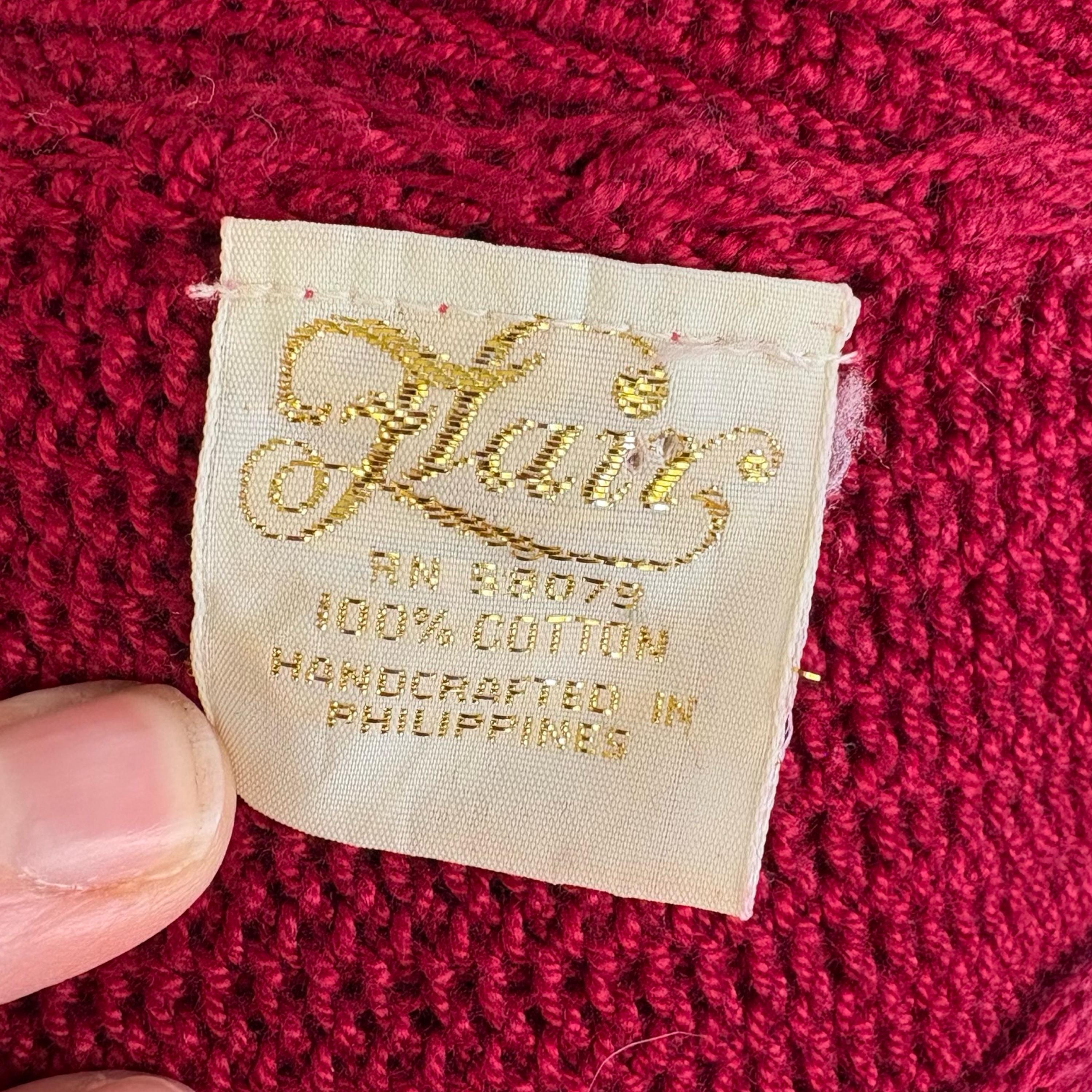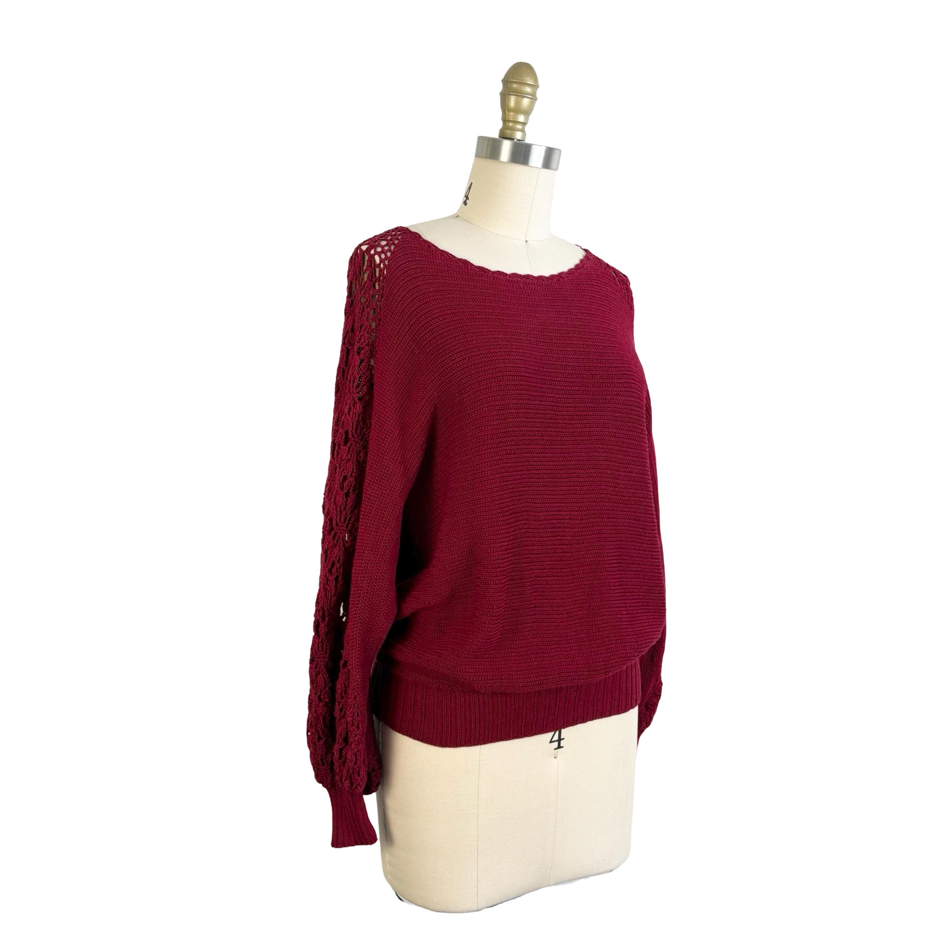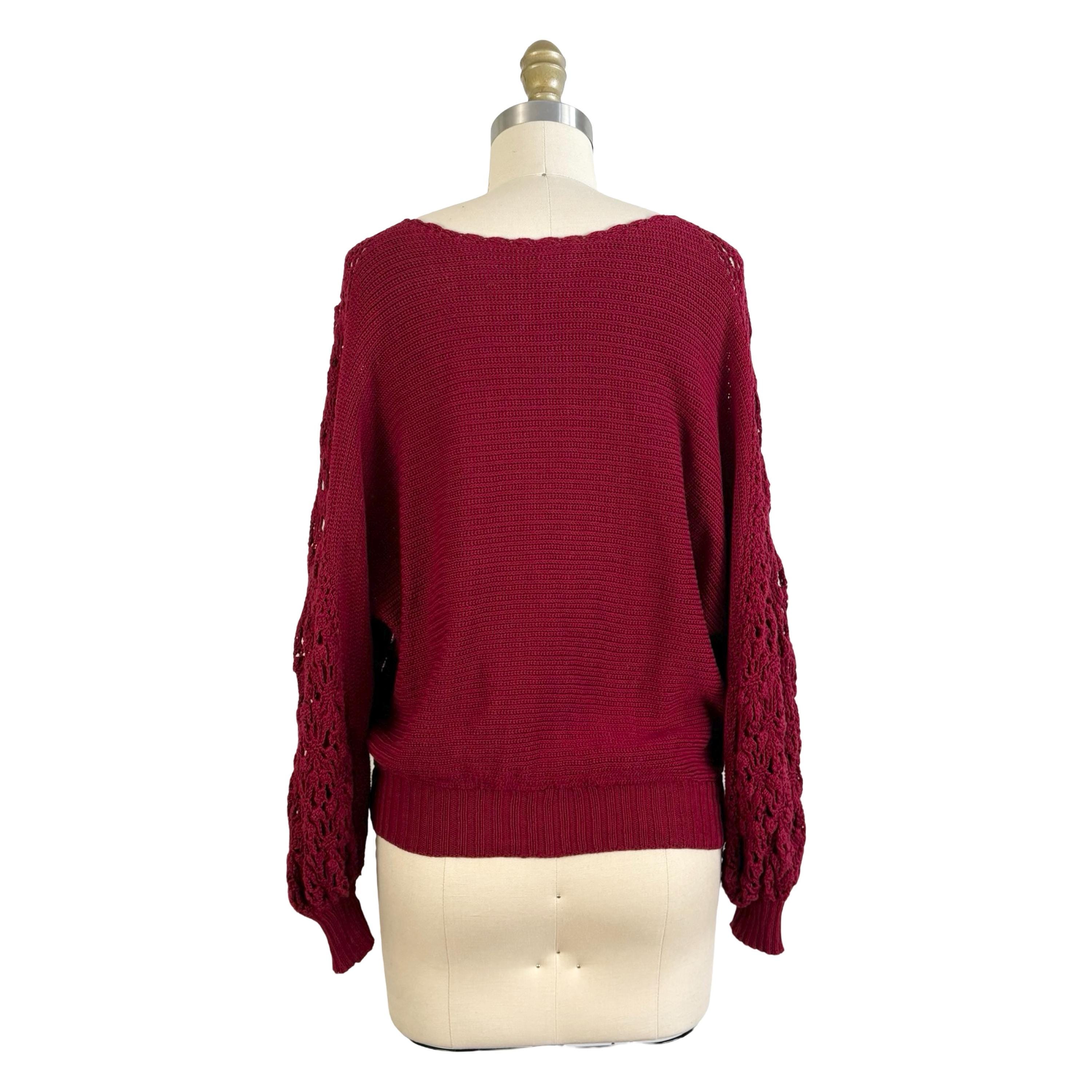 Chic 1970's cotton knit maroon sweater with phenomenal crochet balloon sleeves. Wide boat neckline and pullover style with no fasteners. Falls to mid hip.