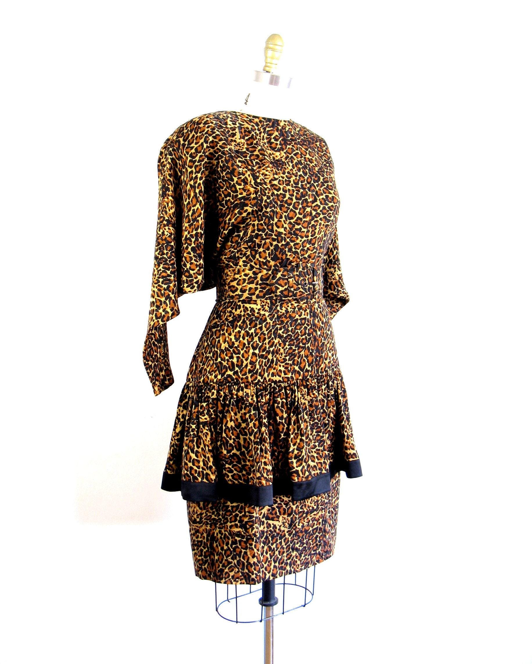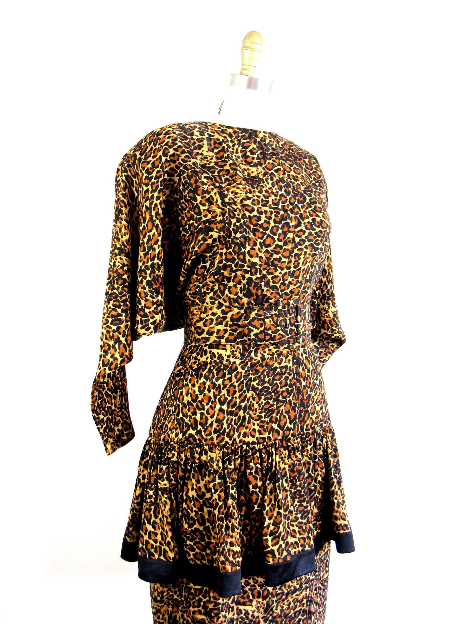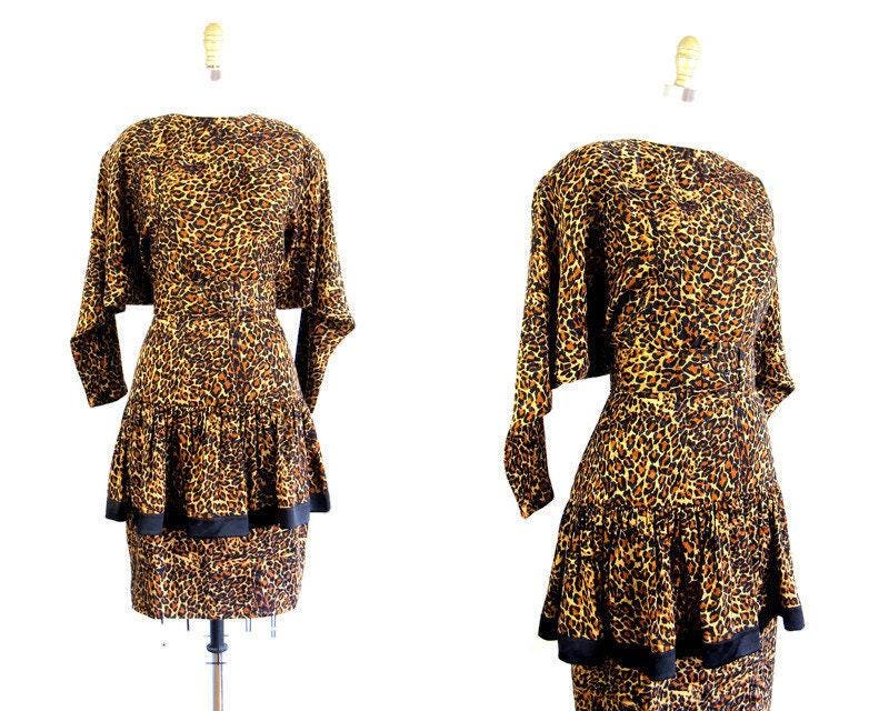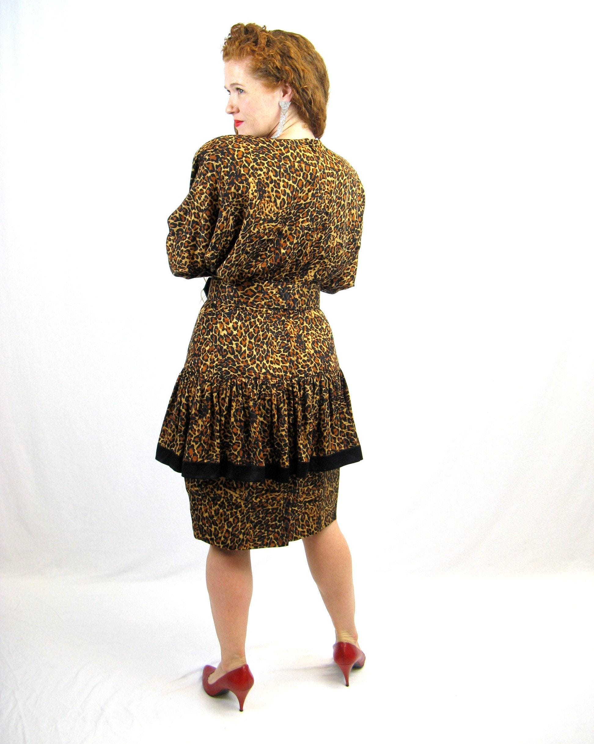 WOW!! Phenomenal 1980's leopard print silk cocktail dress with dropped ruffled overskirt and fab dolmen sleeves. Moderate shoulder pads and matching belt. Unlined bodice and lined skirt with nylon zip up back.