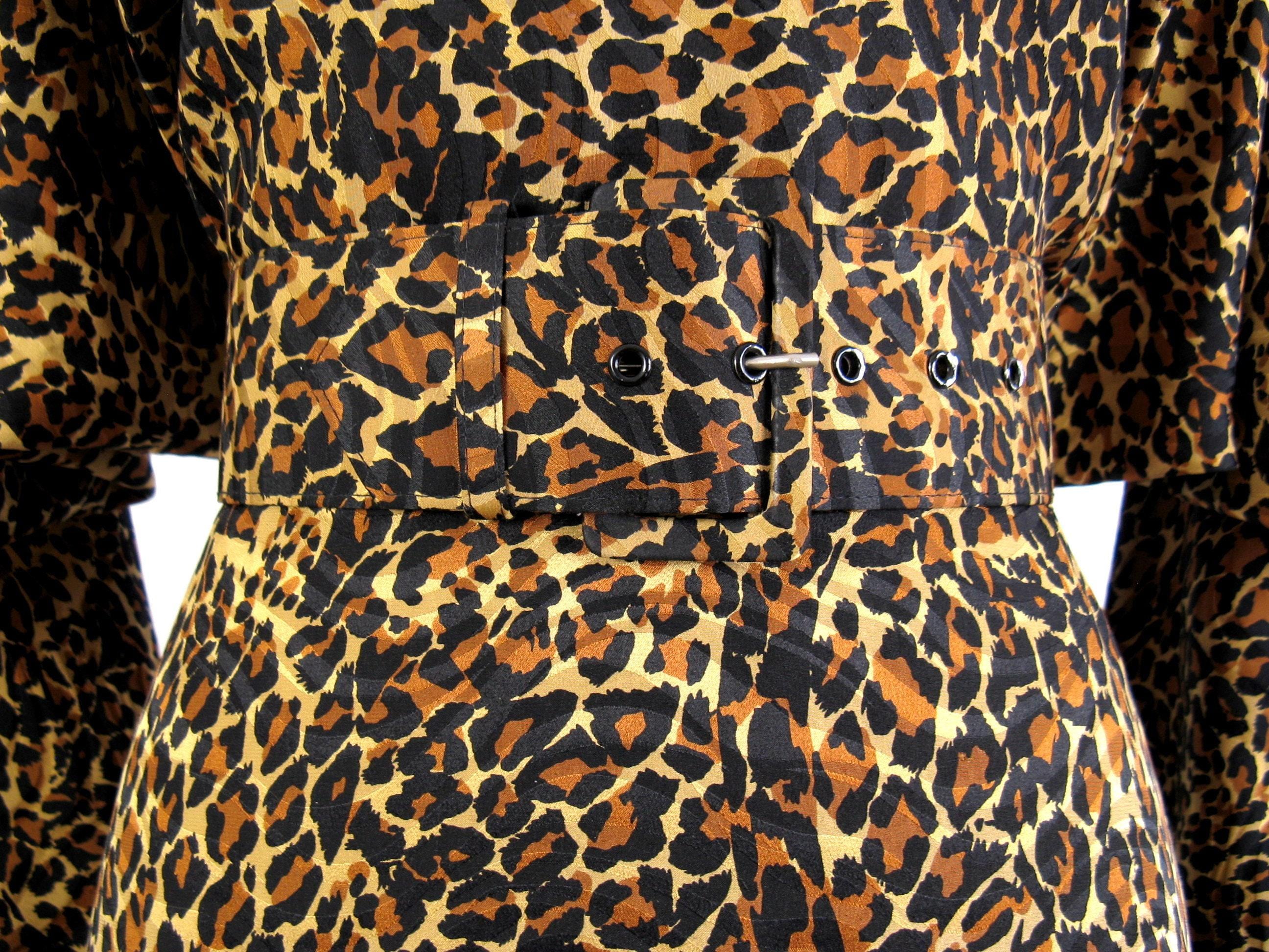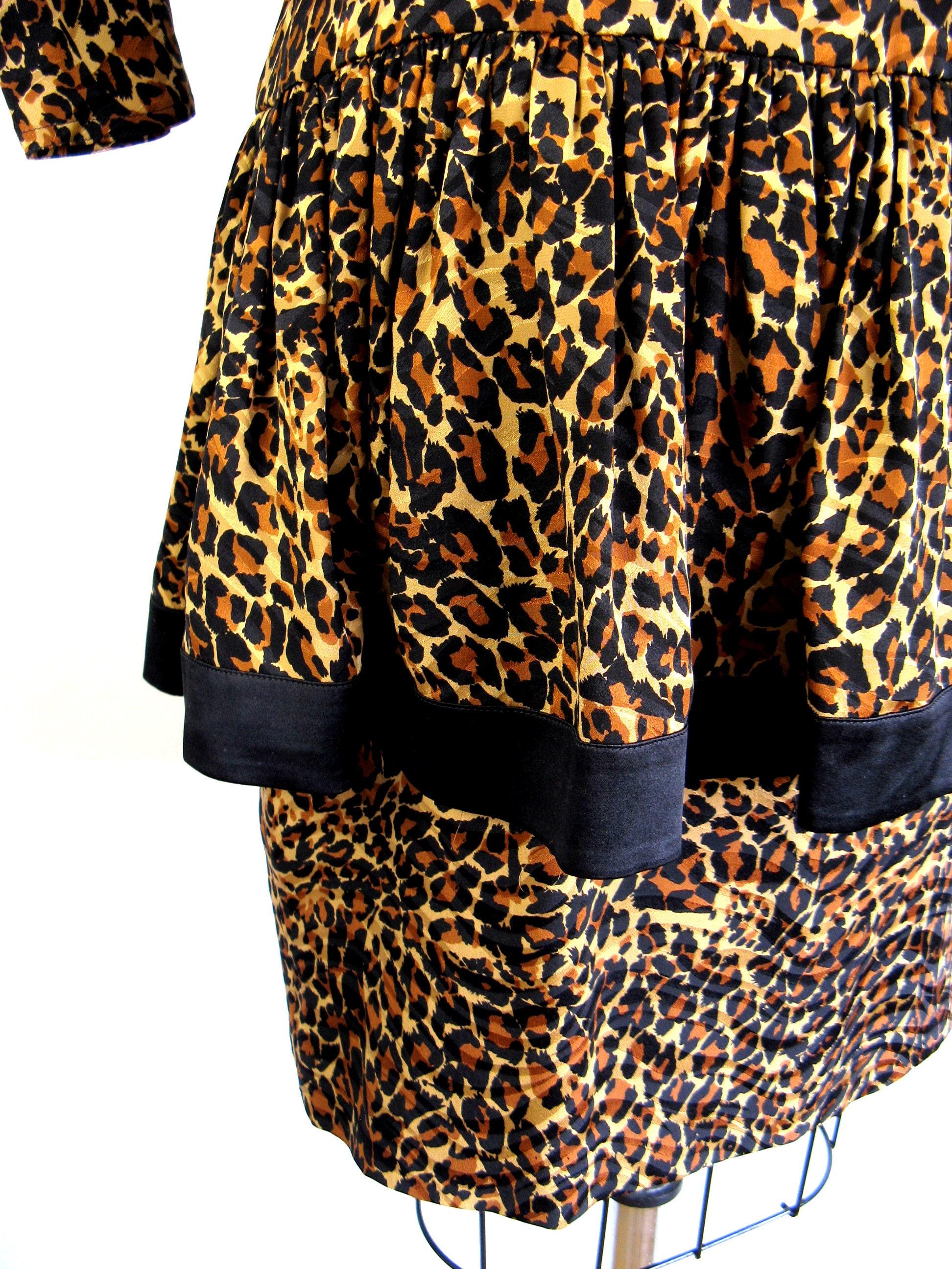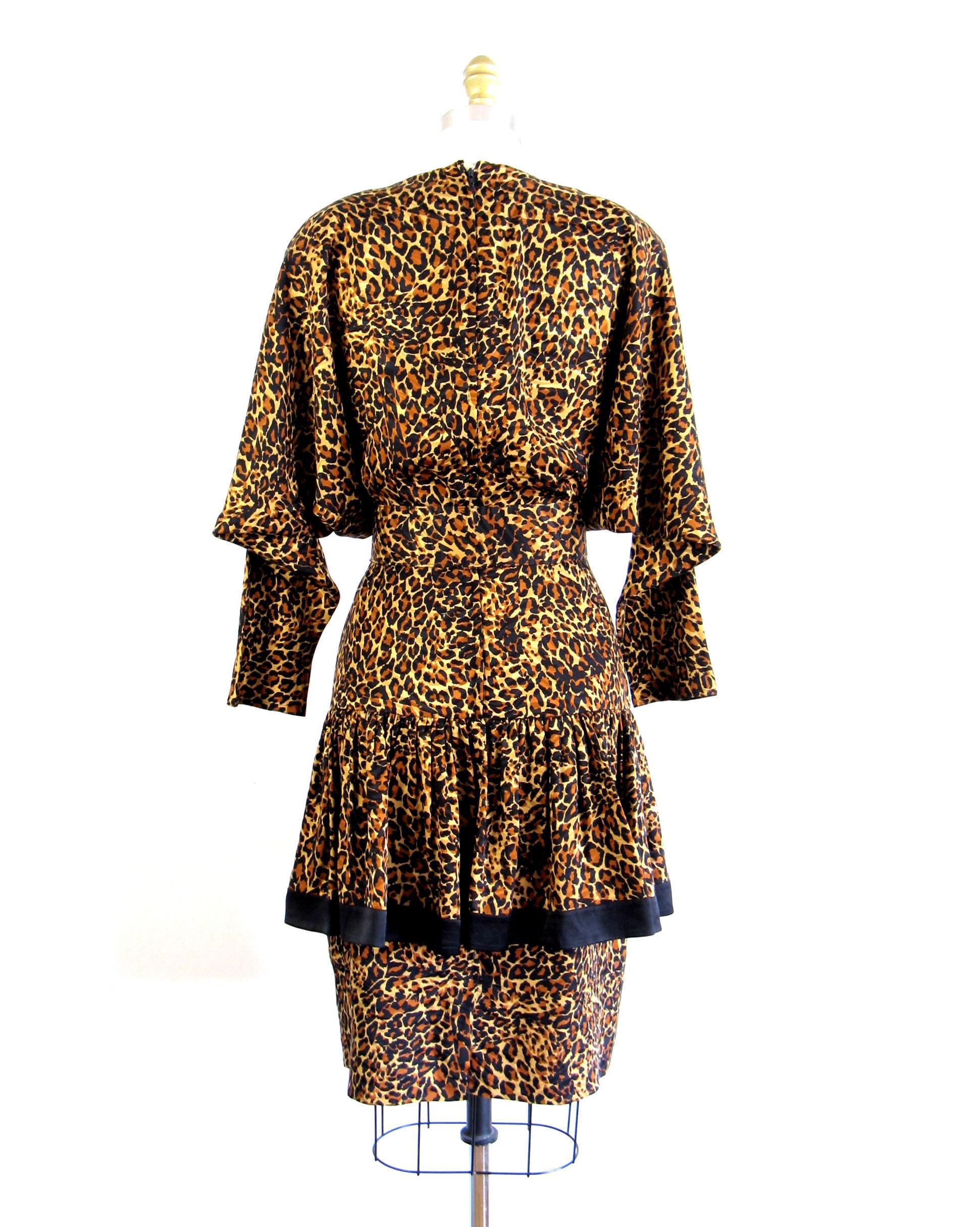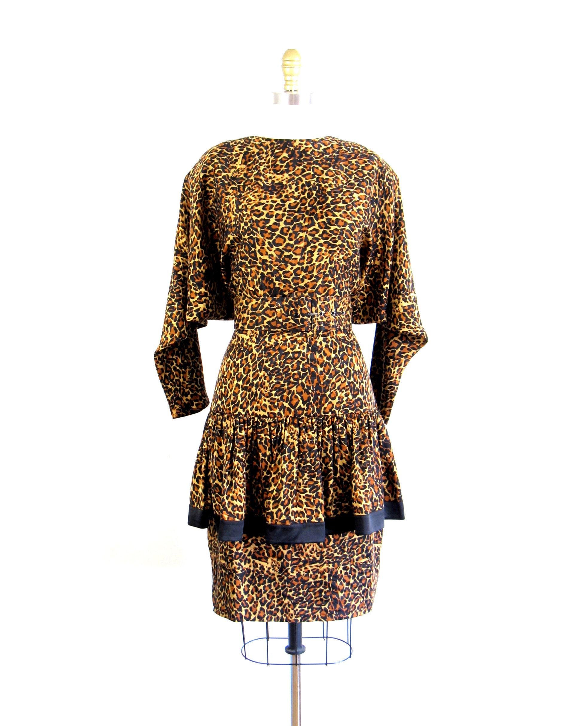WOW!! Phenomenal 1980's leopard print silk cocktail dress with dropped ruffled overskirt and fab dolmen sleeves. Moderate shoulder pads and matching belt. Unlined bodice and lined skirt with nylon zip up back.