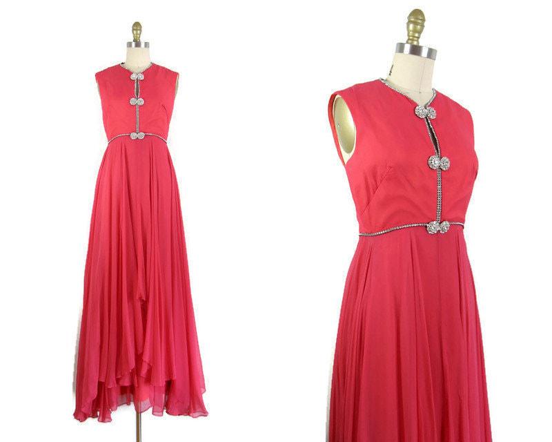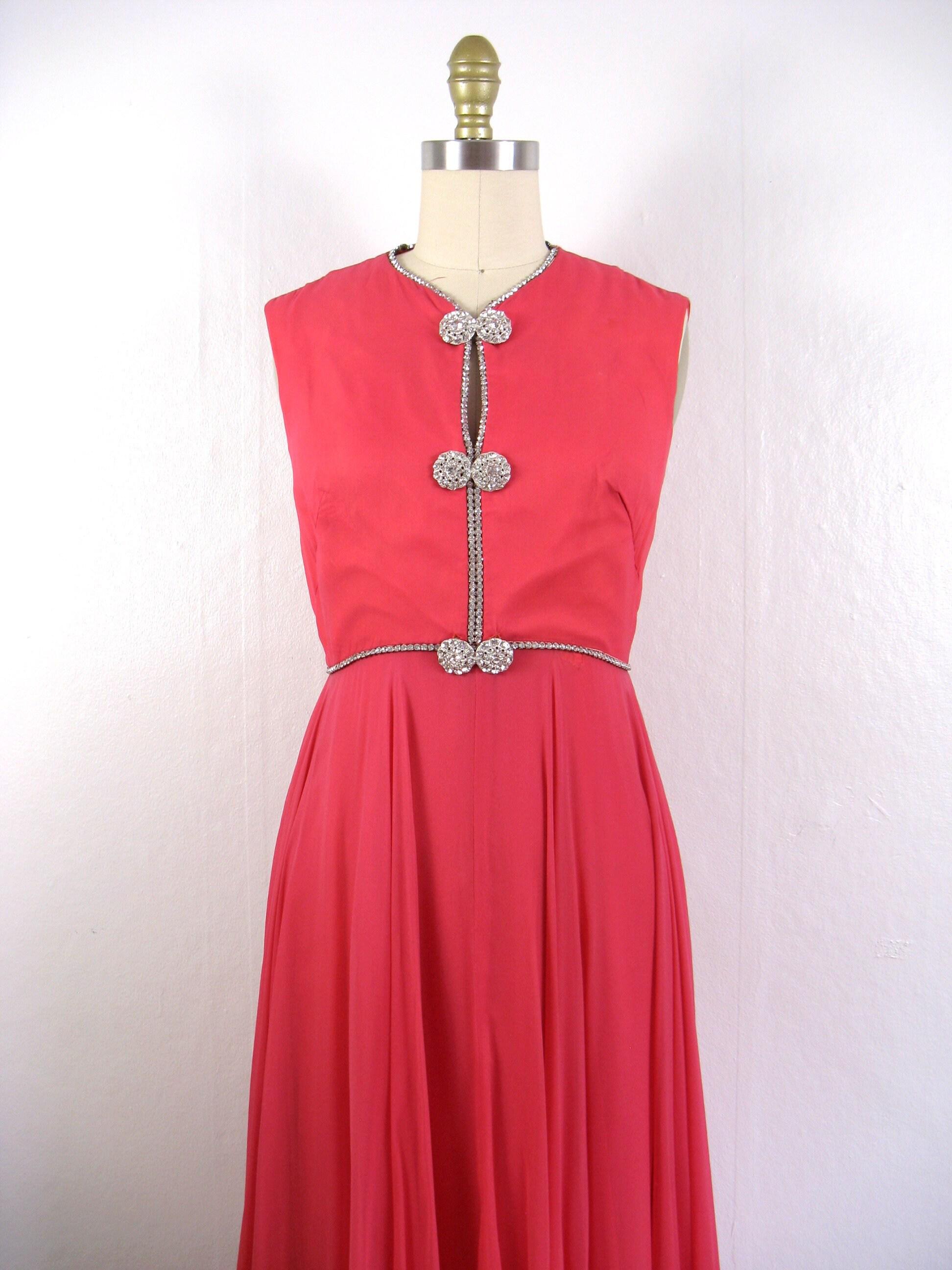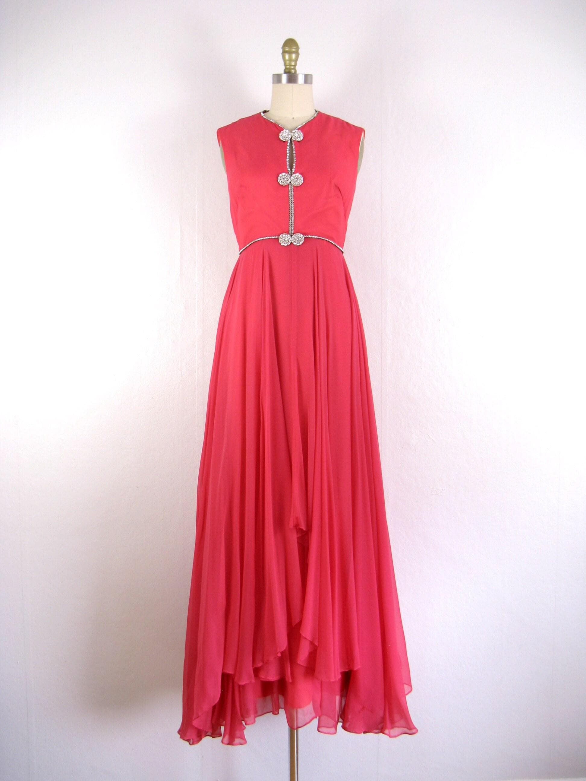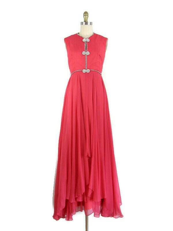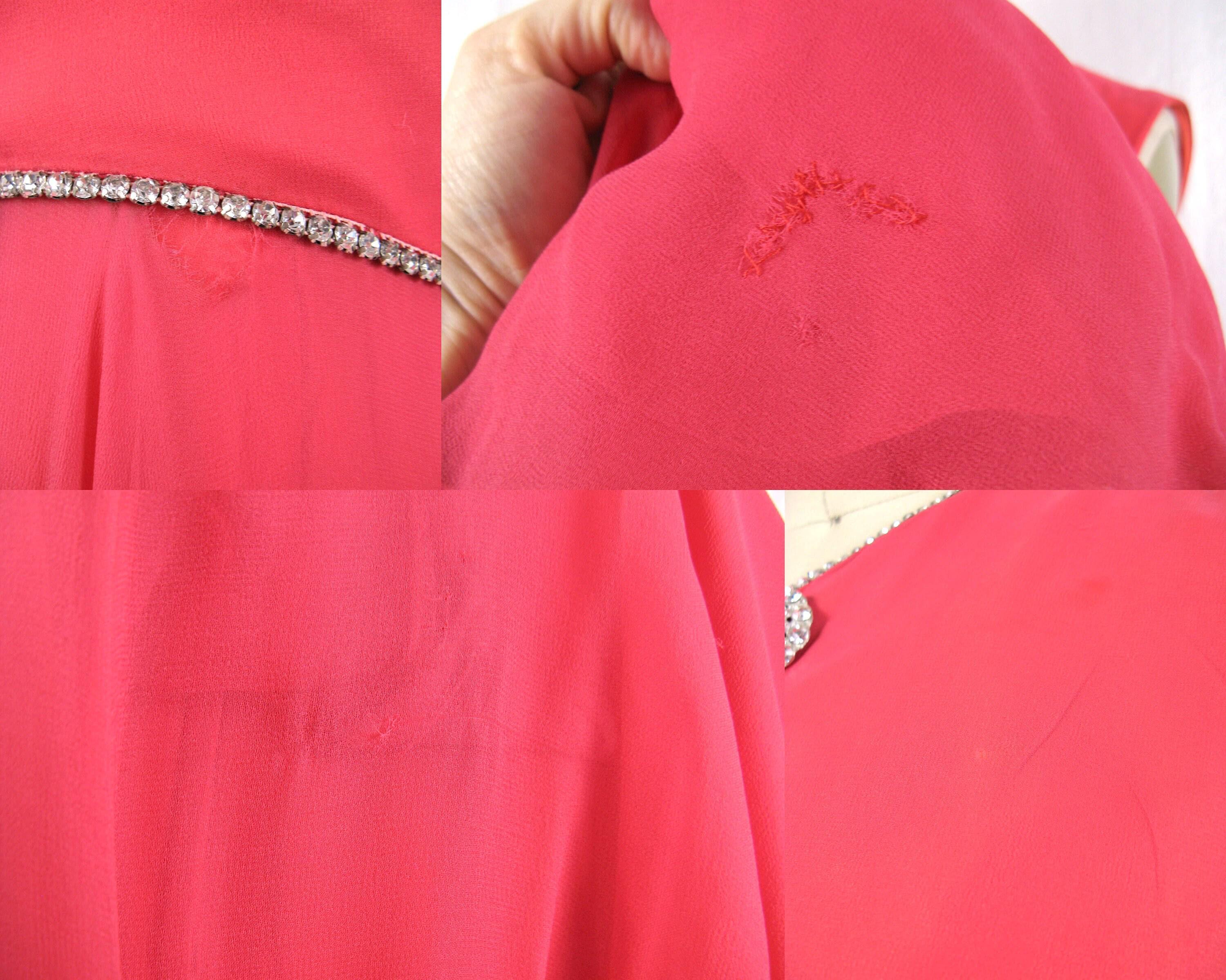 Phenomenal 1960's shocking pink billowing silk chiffon gown with sparkling rhinestone encrusted decorative duets down the front and rhinestone trim. Upswept floor length 3-layer skirt and sleeveless fitted bodice with nylon zip at back. Lined in hot pink acetate taffeta. Absolutely stunning and elegant dress!!