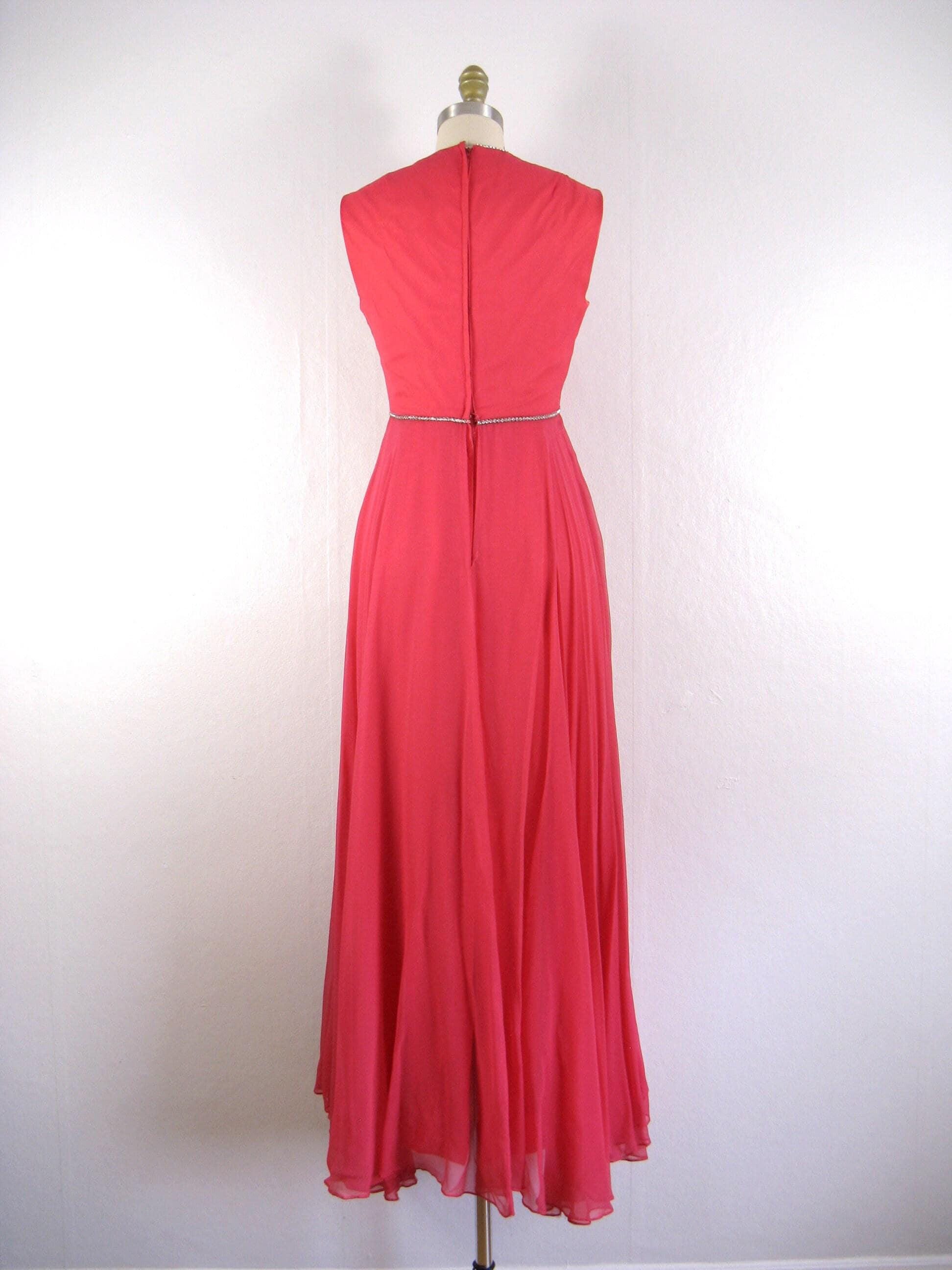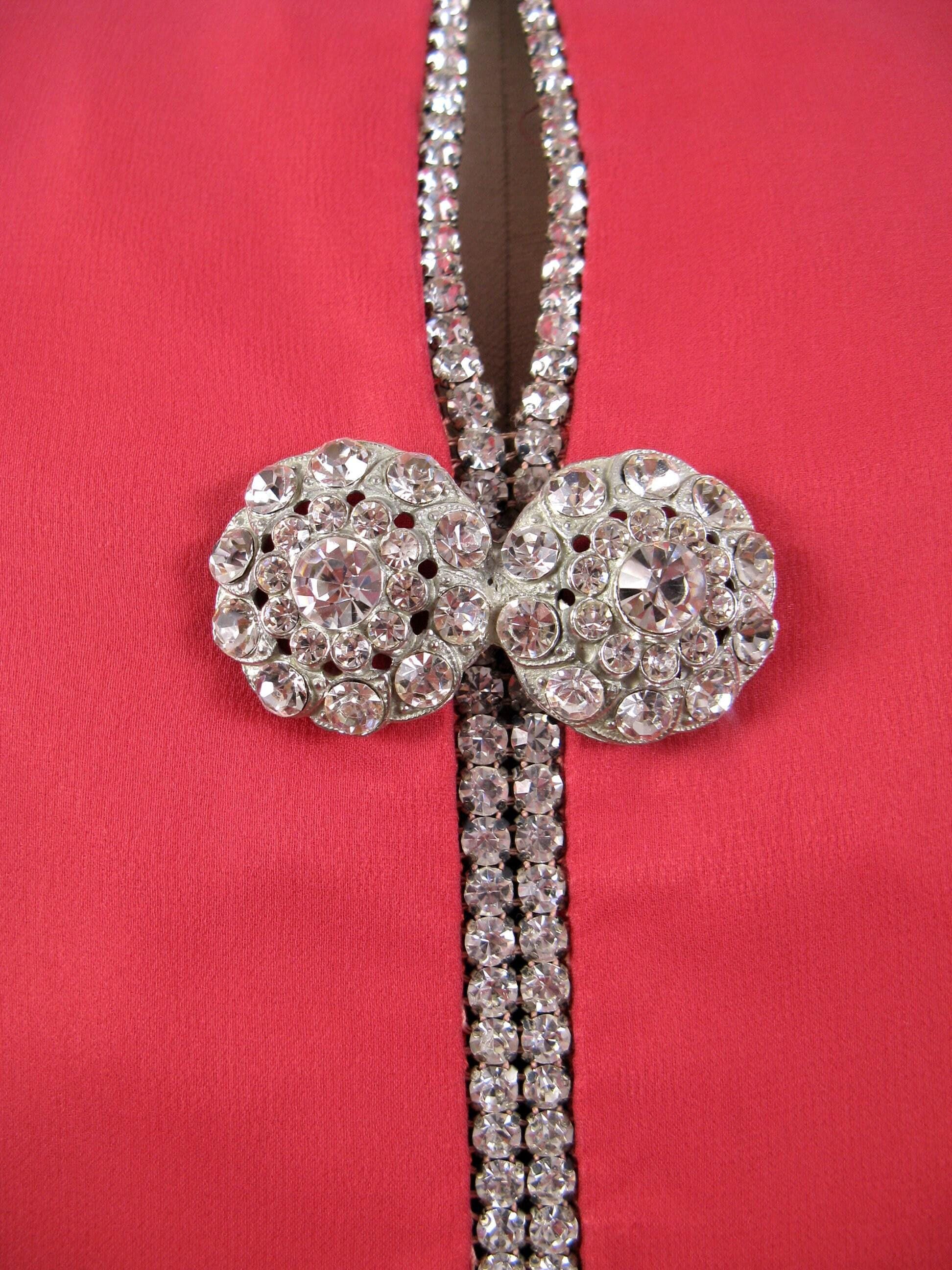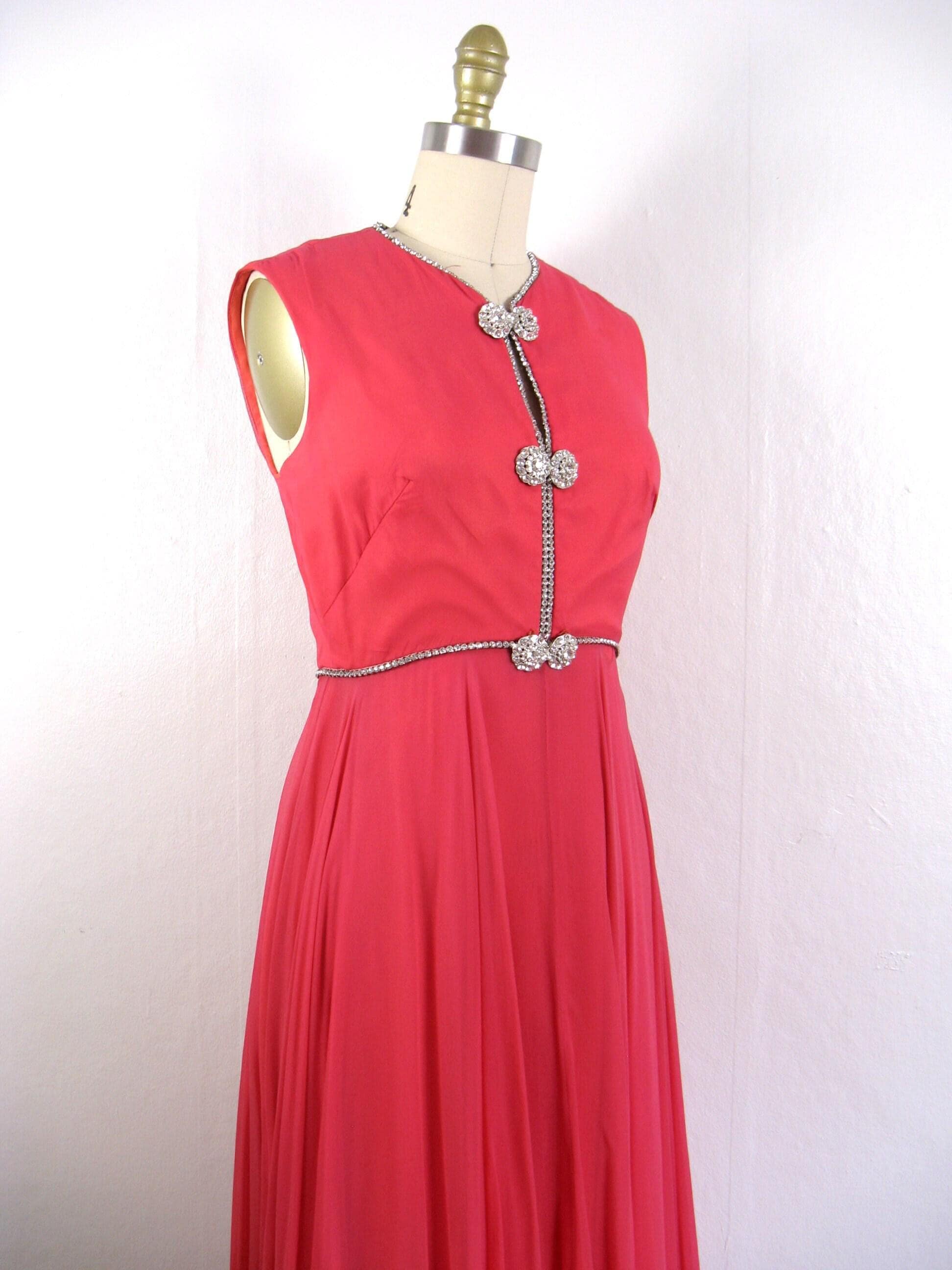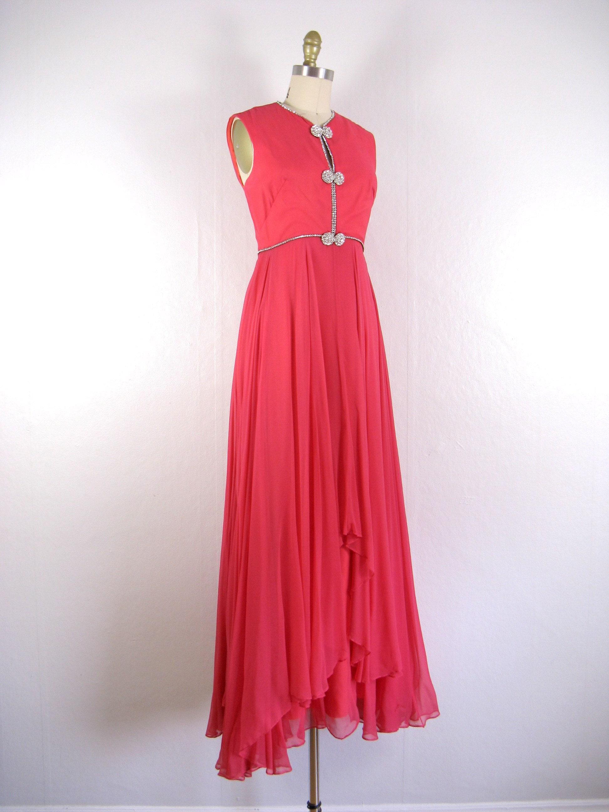 Phenomenal 1960's shocking pink billowing silk chiffon gown with sparkling rhinestone encrusted decorative duets down the front and rhinestone trim. Upswept floor length 3-layer skirt and sleeveless fitted bodice with nylon zip at back. Lined in hot pink acetate taffeta. Absolutely stunning and elegant dress!!