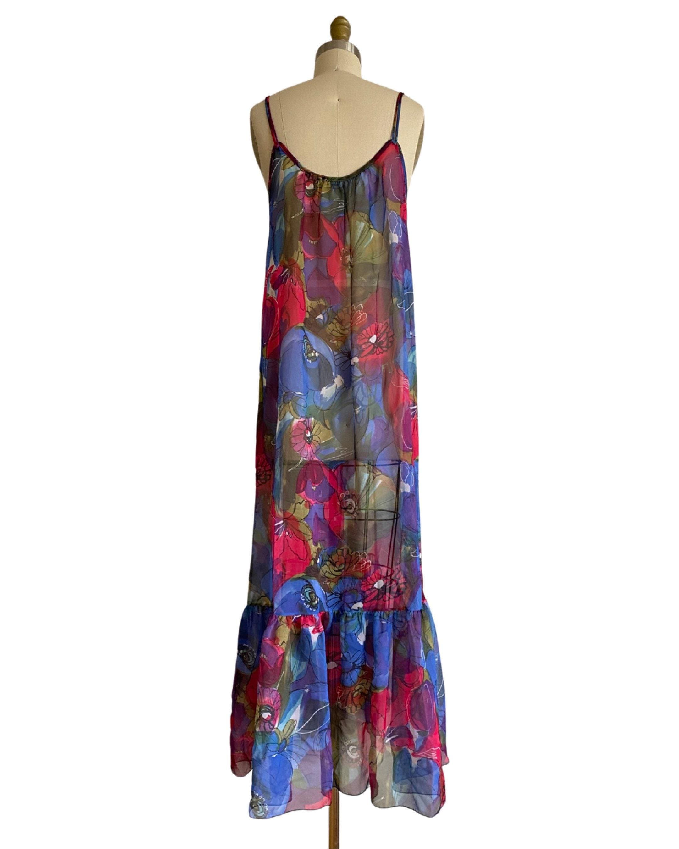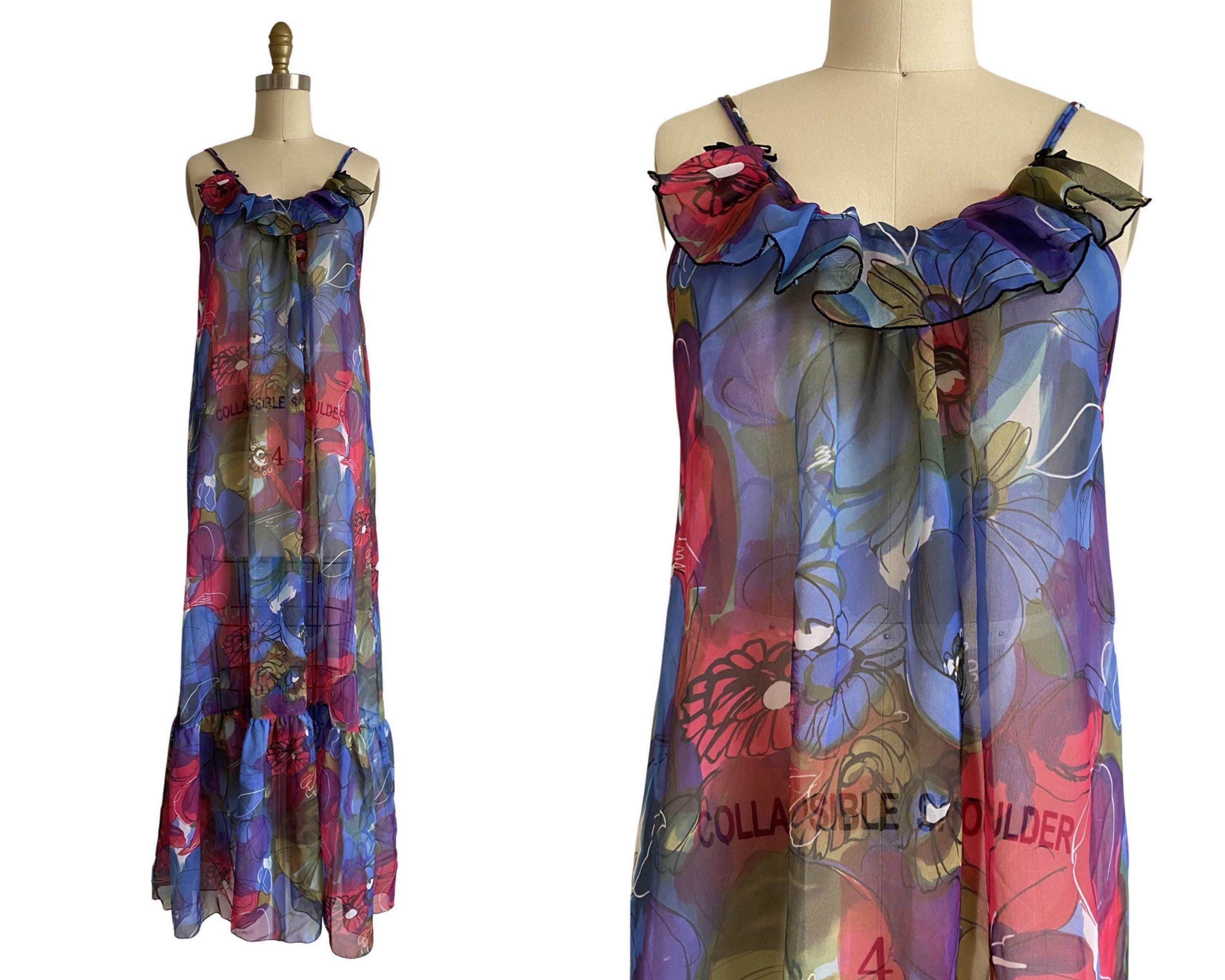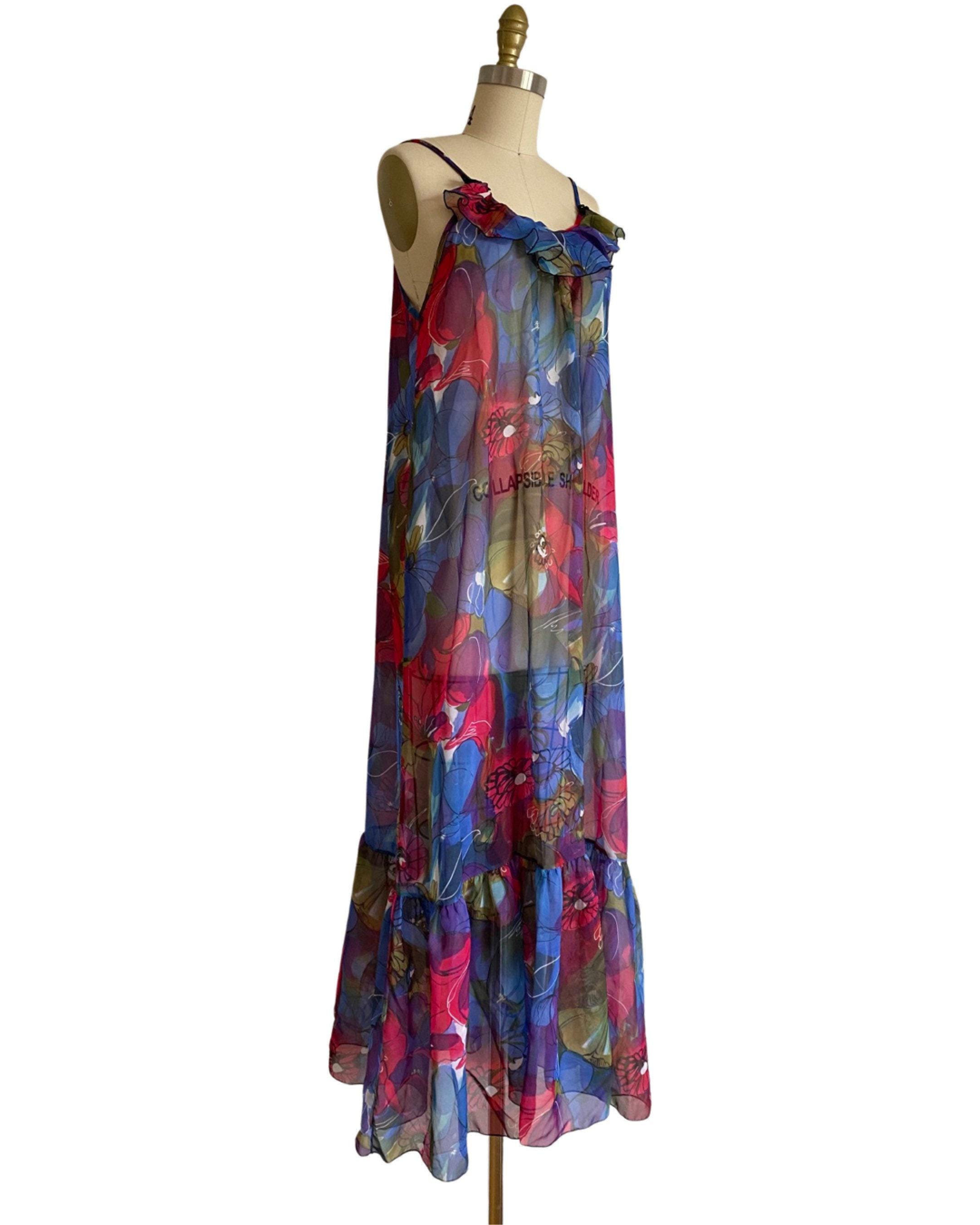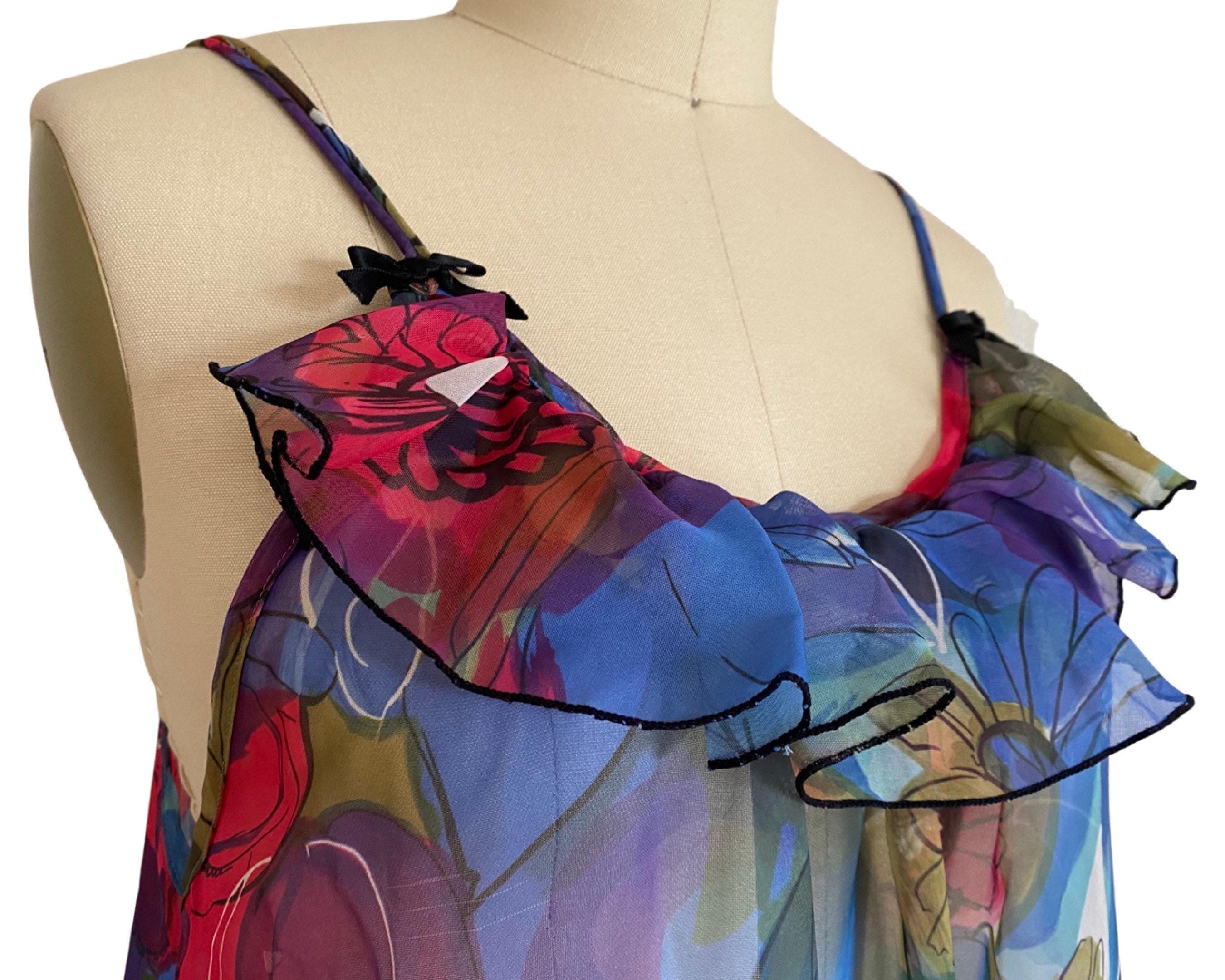 Beautiful 1960's vibrant large scale floral sheer nylon chiffon nightgown. Spaghetti straps and bust ruffle with two cute little black satin bows. Open style fit and large ruffle at hem.