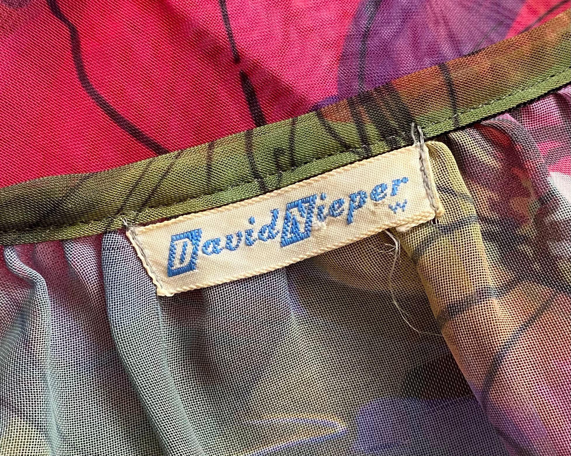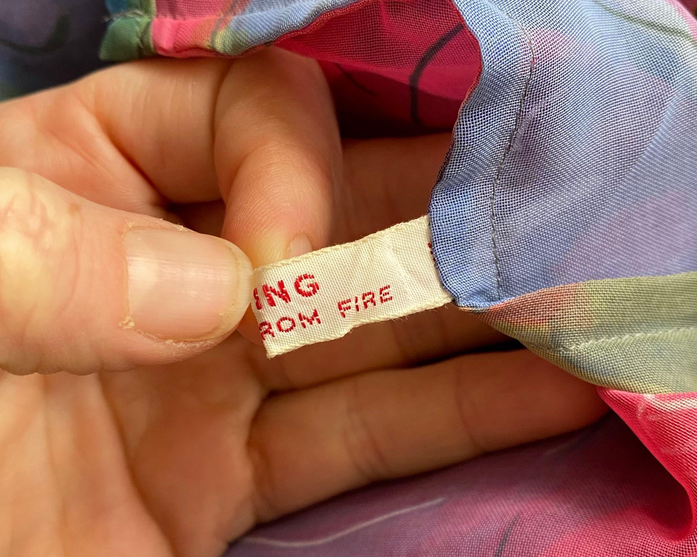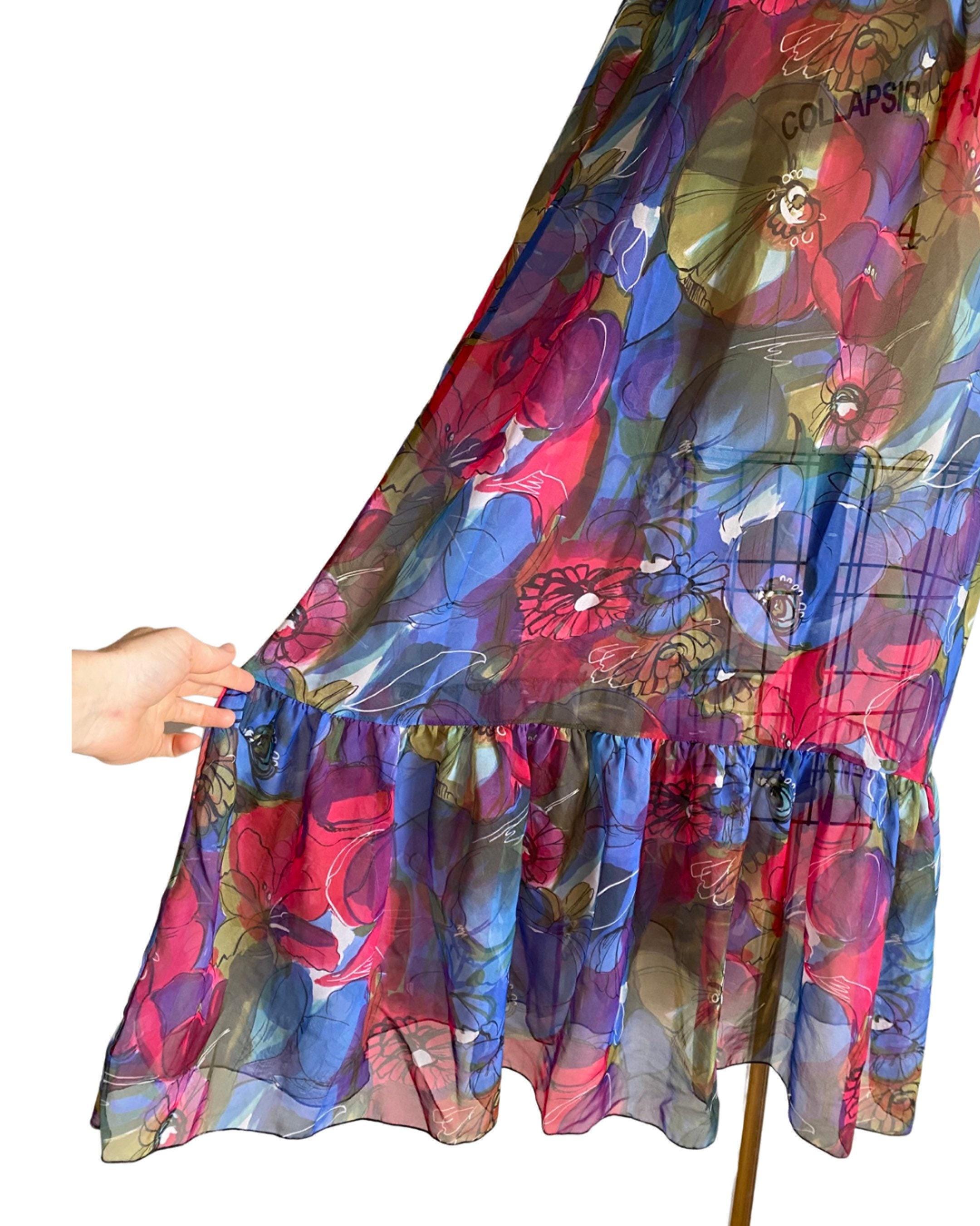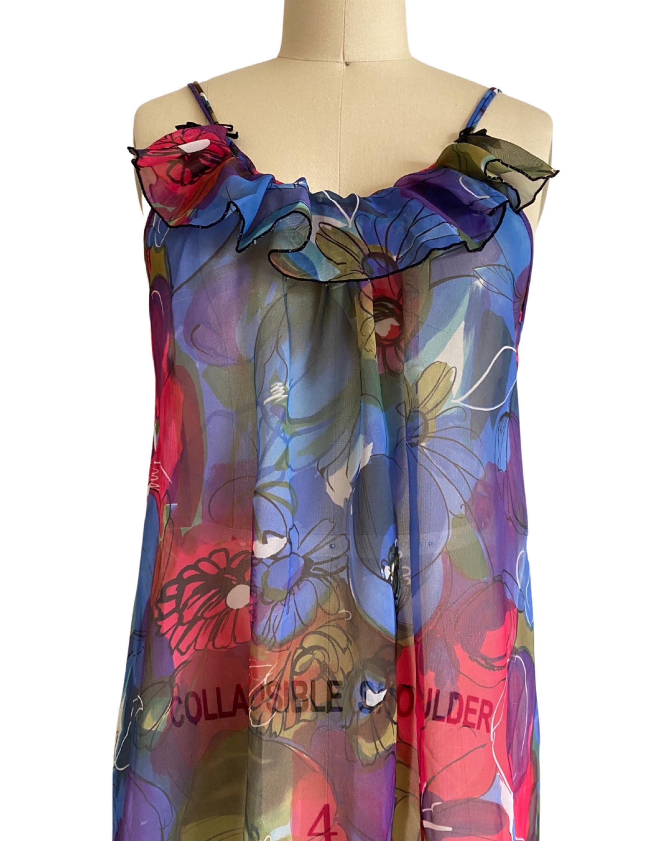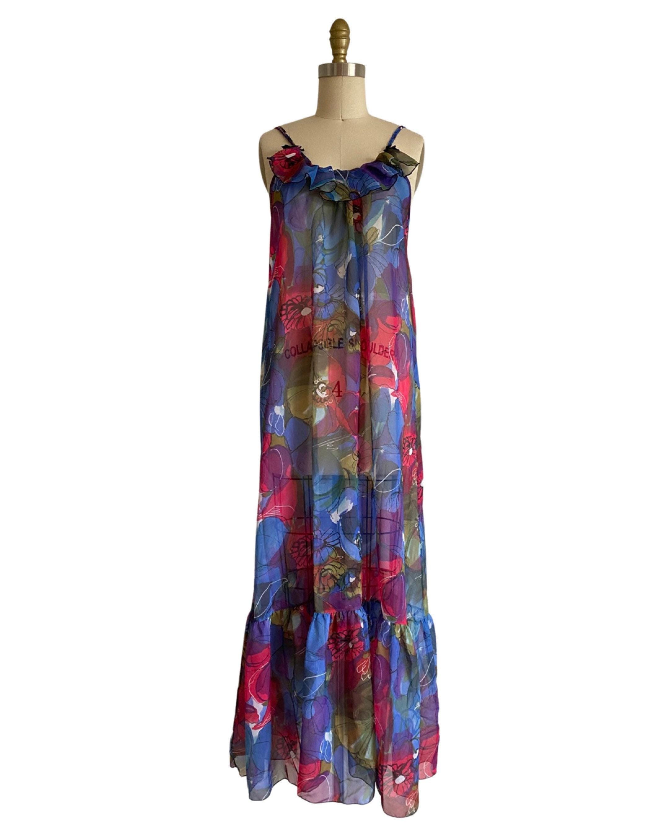 Beautiful 1960's vibrant large scale floral sheer nylon chiffon nightgown. Spaghetti straps and bust ruffle with two cute little black satin bows. Open style fit and large ruffle at hem.